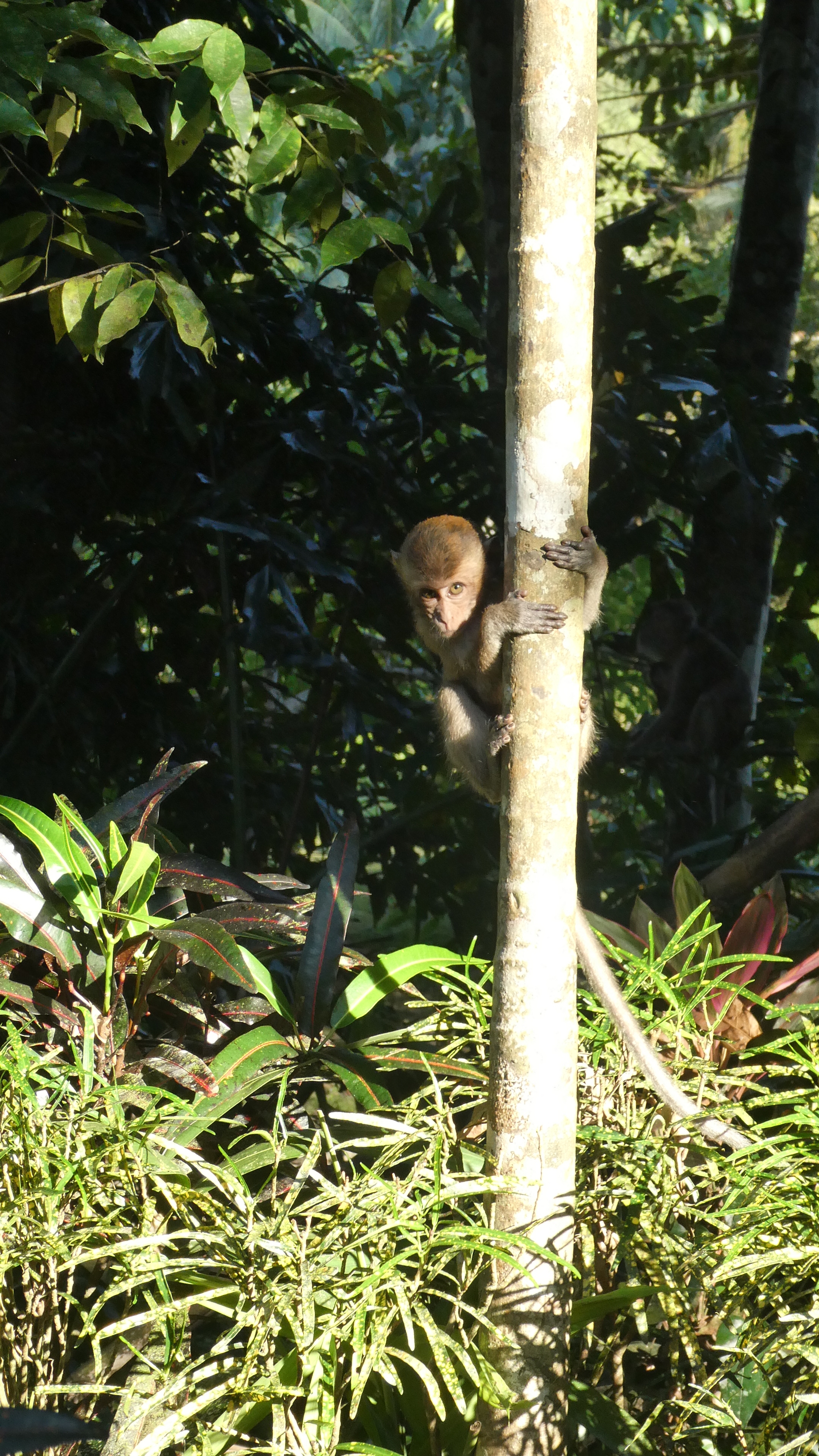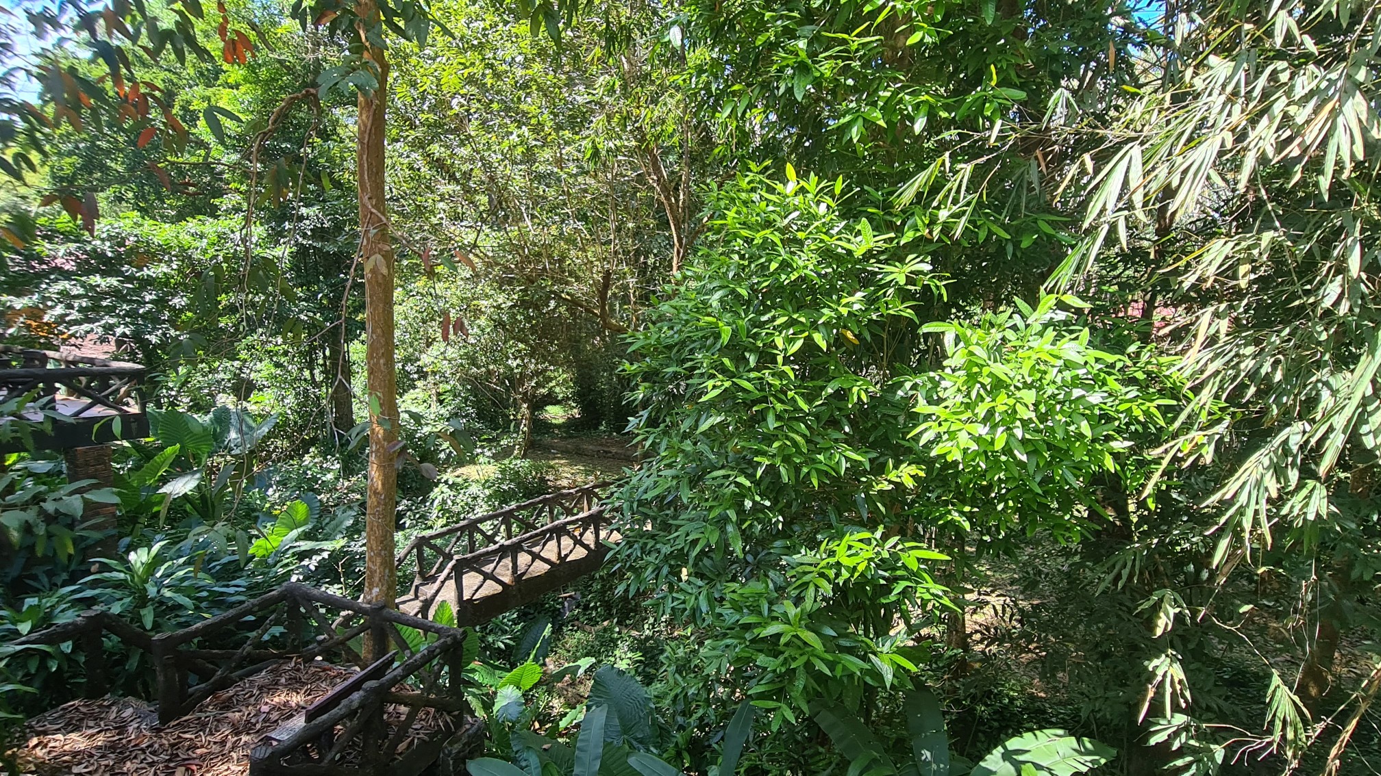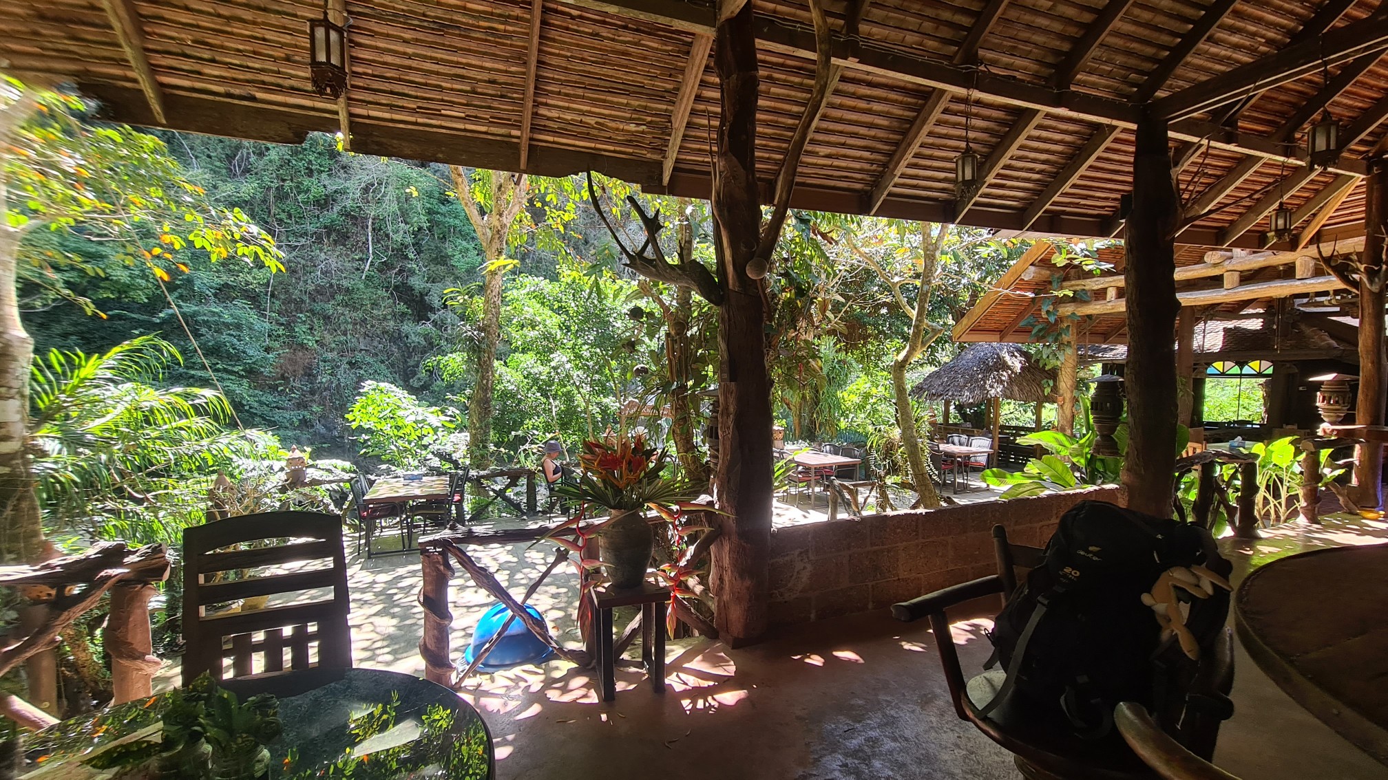 Nachdem ich mich ausgebreitet, geduscht und geruht habe, mache ich mich auf eine erste Erkundungstour durch die Anlage. Über gewundene Pfade geht es durch ein üppiges Pflanzenmeer an verschieden großen Baumhäusern vorbei und am Fluss Sok entlang. Letzterer wird hier allenthalben groß angepriesen als Naturparadies zum Schwimmen, Bootfahren und Tubing. Vielleicht ist ja zu anderen Zeiten mehr Wasser drin, aber aktuell bietet das Rinnsal nicht viel mehr für Auge und Hobby wie die Nahe bei Merxheim. Da hat die Affenbande, die sich hier immer wieder rumtreibt, einen weitaus höheren Unterhaltungswert. Vom Open-Air-Restaurant der Art’s Riverview Lodge kann man ihnen beim Toben in der Felsenhöhle auf der anderen Uferseite zuschauen und manchmal begegnet man ihnen auch direkt vor der Bungalowtür.