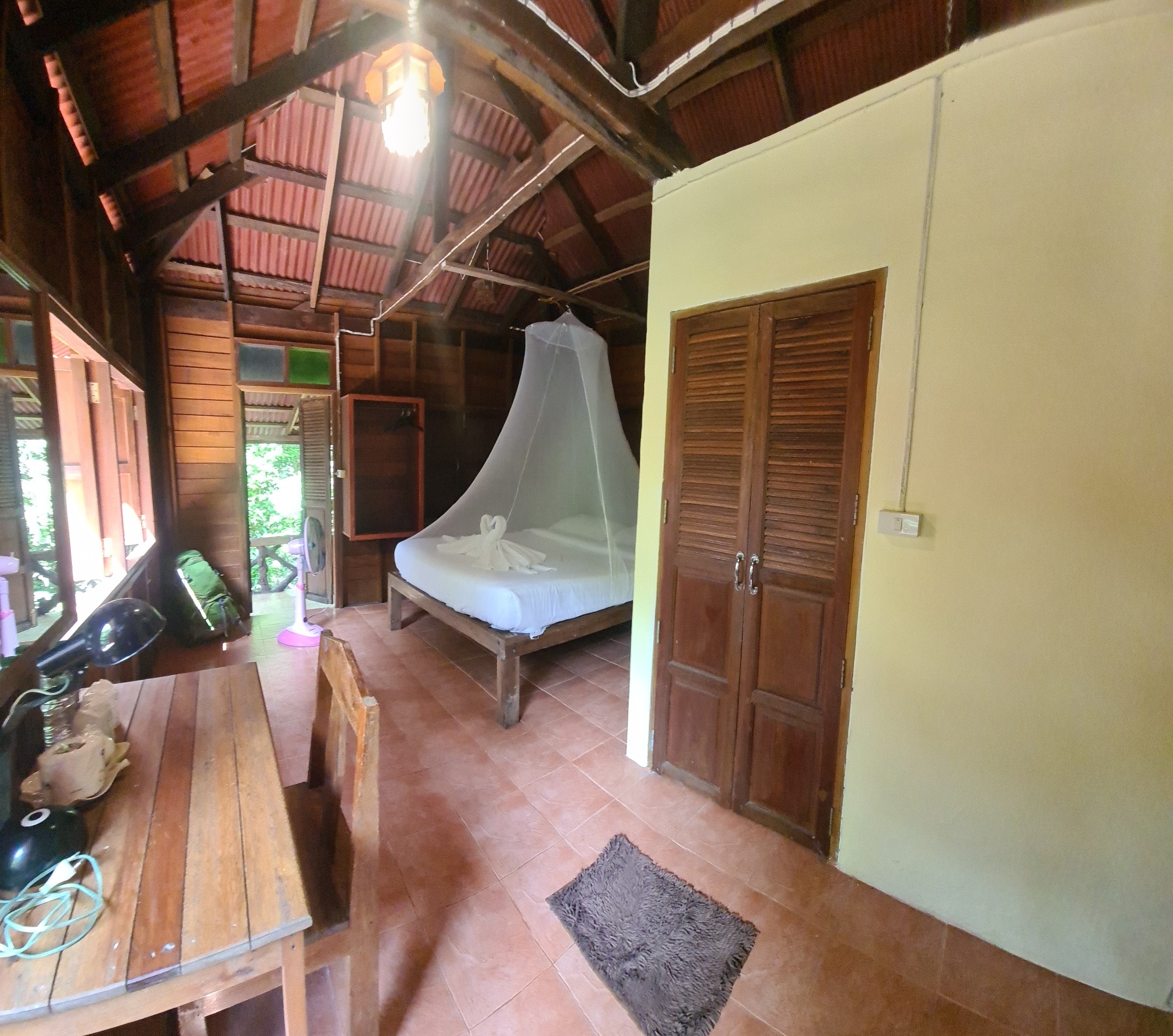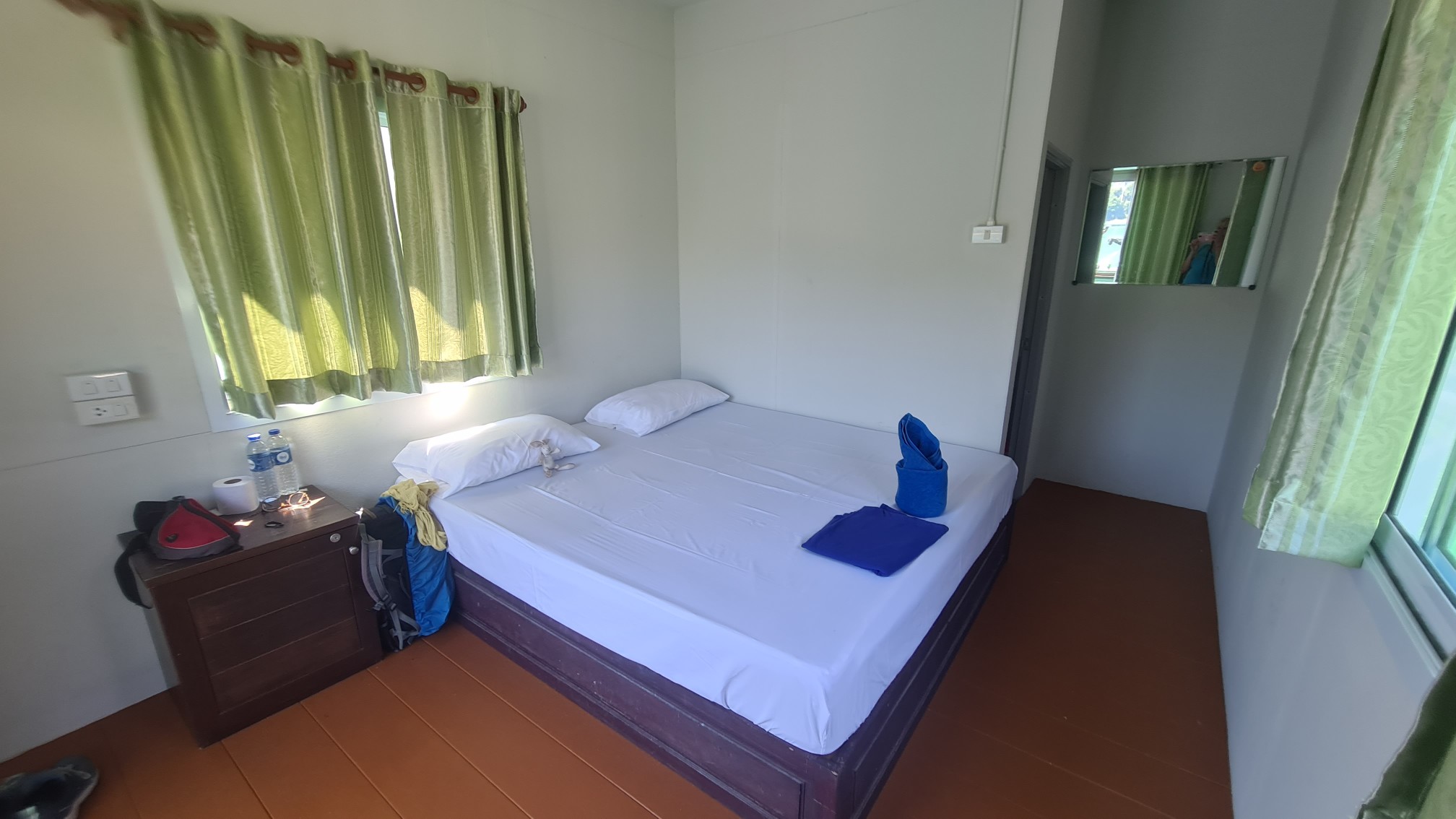 Schon rein optisch unterscheiden sich die verschiedenen Zimmerkategorien: Es fängt ganz links an mit einfachsten Häuschen, in denen nur eine Matratze auf dem Boden liegt und keine Dusche/Toilette vorhanden ist, gefolgt von noch alten, sehr dunklen Blockhäuschen in der linken Ecke (die 2 Monate später auch ersetzt wurden), geht in Folge über in wunderbar einladend und hell wirkende Appartments mit Fensterfront, Doppelbett und eigenem Bad und steigert sich rechter Hand des Restaurants dann bis zu den Suiten hoch. Nach dem Anlanden plärrt unser Guide Bao mit den Zimmerschlüsseln in der Hand immer nur „Double?“ und „Single?“ übern See. Na ja, da ich kein Double gebucht habe, sondern alleine reise und einfach nur die günstigste Kategorie ausgewählt habe, fühle ich mich bei dem Zuruf „Double“ nicht angesprochen. Hatte ich doch angenommen, der gute Mann hat eine Liste mit Paaren und eine Liste mit Einzelreisenden, denen dann jeweils die Zimmer zugeteilt werden. Ich halte mich wie so oft einfach mal bedeckt im Hintergrund und harre der Dinge, die da kommen. Und was soll ich sagen … Bao und auch die Hotelmanagerin haben absolut keinen Plan, wer welche Zimmerkategorie reserviert hatte. So beziehen Paare die kleinen, super einfachen Mini-Häuschen, während ich, weil ich erst ganz zum Schluss auf den Zuruf „Single“ reagiere, bekomme eines dieser luxuriösen Traumhäuschen!! Bingo!! Manchmal ist es doch gut, wenn man die Klappe hält und sich blöd stellt. Alle meinen ich hätte extra ein „Single-Room“ für mich alleine reserviert, dabei habe ich, wie ich später feststelle, 500-1.000 Baht weniger gezahlt, als die anderen Traveller. Ob die drei anderen Single-Reisenden vom gleichen Missverständnis profitiert haben oder tatsächlich alleine sein wollten, habe ich nicht erfragt.