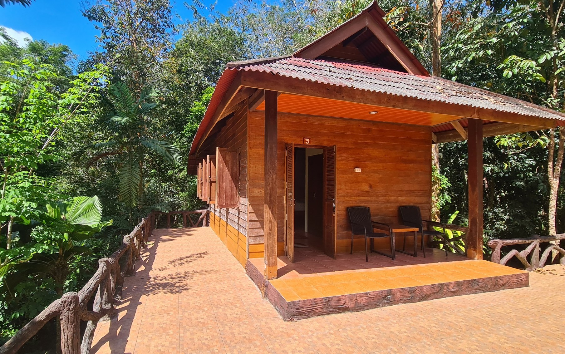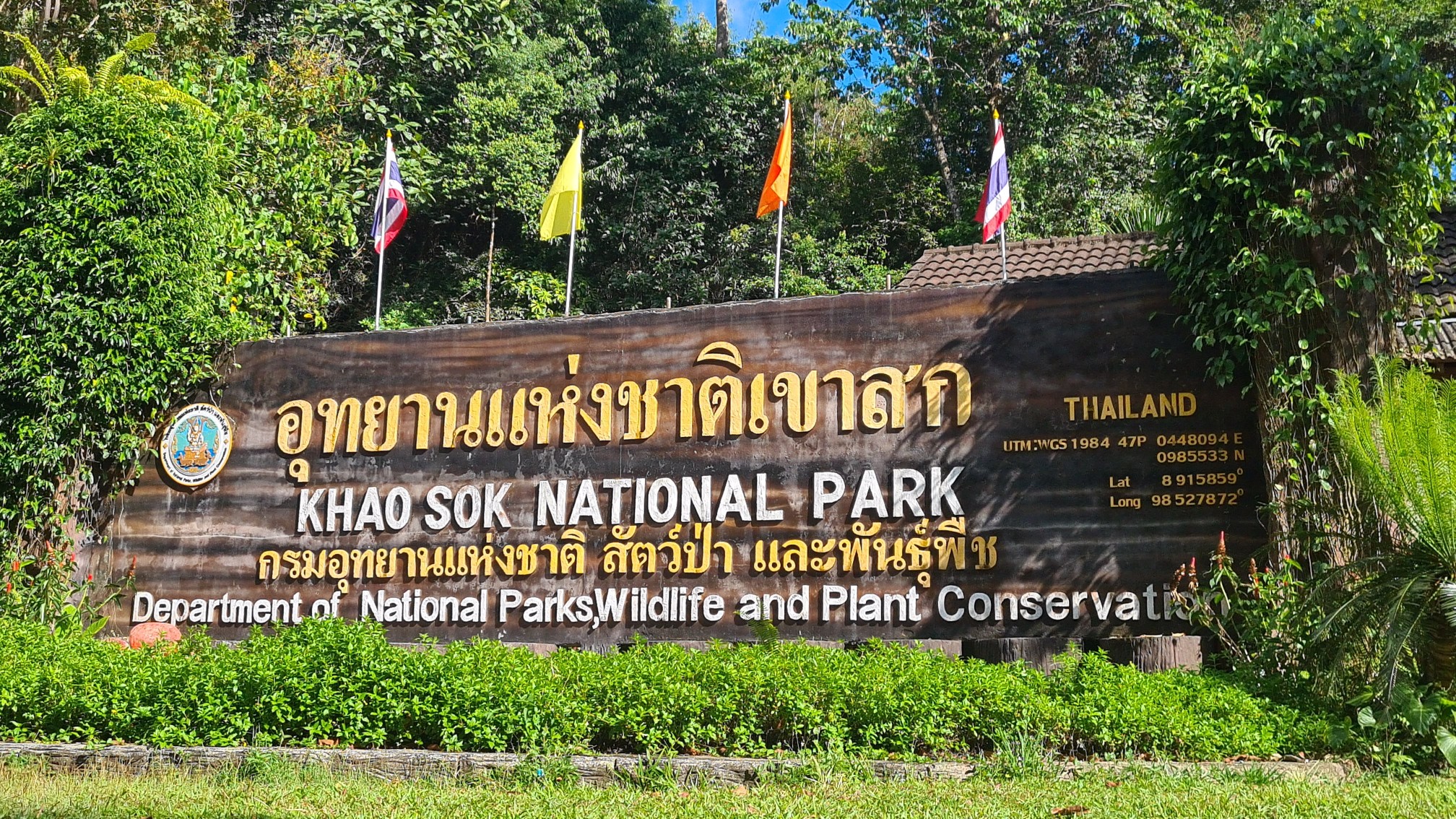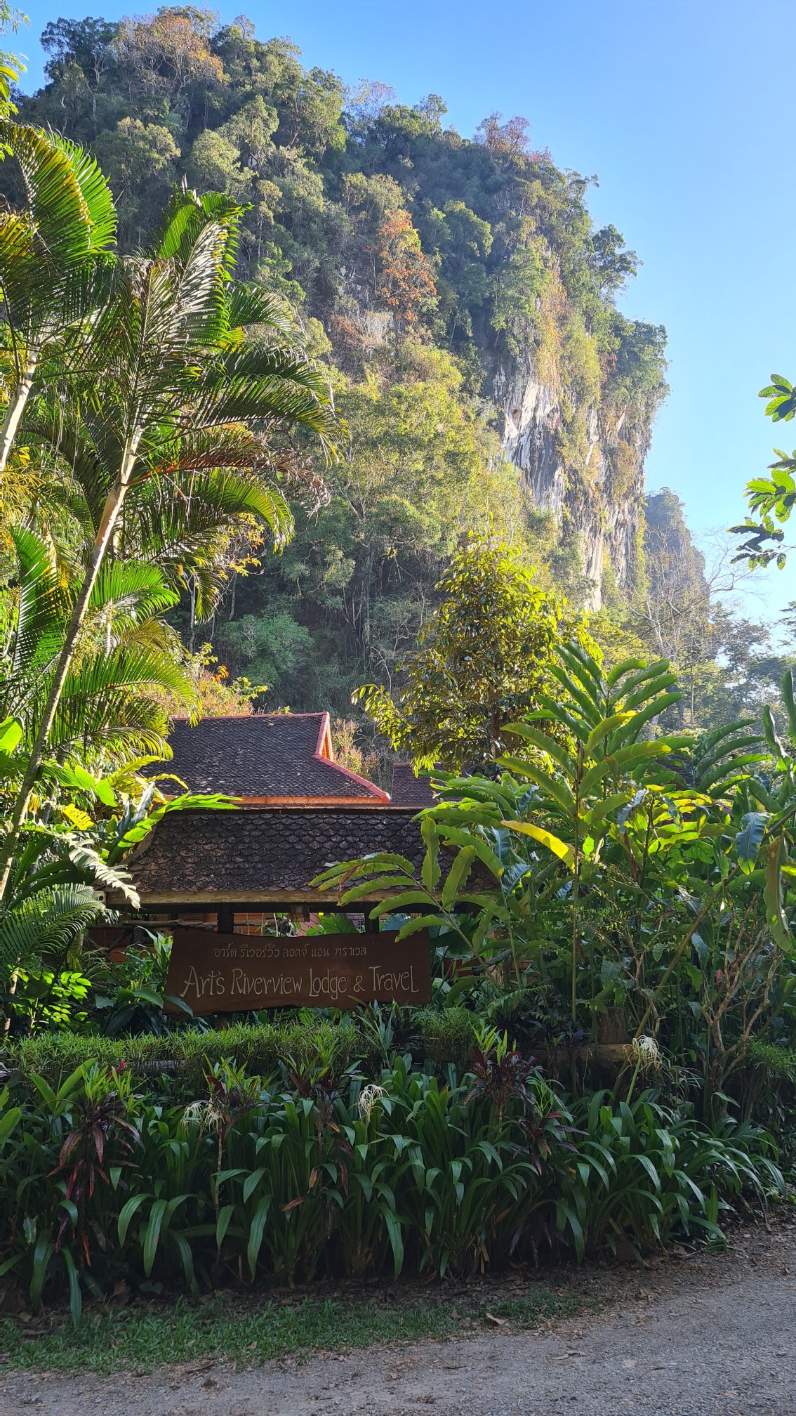 Eigentlich wird man von den Mini-Vans aus Surat Thani kommend an einer offiziellen Bushaltestelle abgeliefert, die noch zwei Kilometer außerhalb des Khao Sok Dorfes liegt. Eigentlich, aber eigentlich bin ich es ja mittlerweile auch gewohnt, dass ich nie exakt an dem Ziel ankomme, das ich eigentlich gebucht habe. Nichtsahnend werden die wenigen Passagiere unseres Mini-Busses nach knapp zweistündiger Fahrt mit knappen Worten hinaus komplimentiert. Noch ist uns die Gegend hier völlig fremd, aber zumindest stehen wir schon mal vor einem Haupteingang des Khao Sok National Parks. Klingt nicht ganz verkehrt. Für die nächsten drei Nächte habe ich mir einen kleinen Bungalow in der Art’s Riverview Lodge gegönnt. Ich darf anrufen, um mich von einem Shuttle am vermeintlichen Bus-Stop abholen zu lassen. Natürlich ist die Verwirrung groß, da ich ja gar nicht an der Bushaltestelle stehe – wovon ich aber nichts weiß.