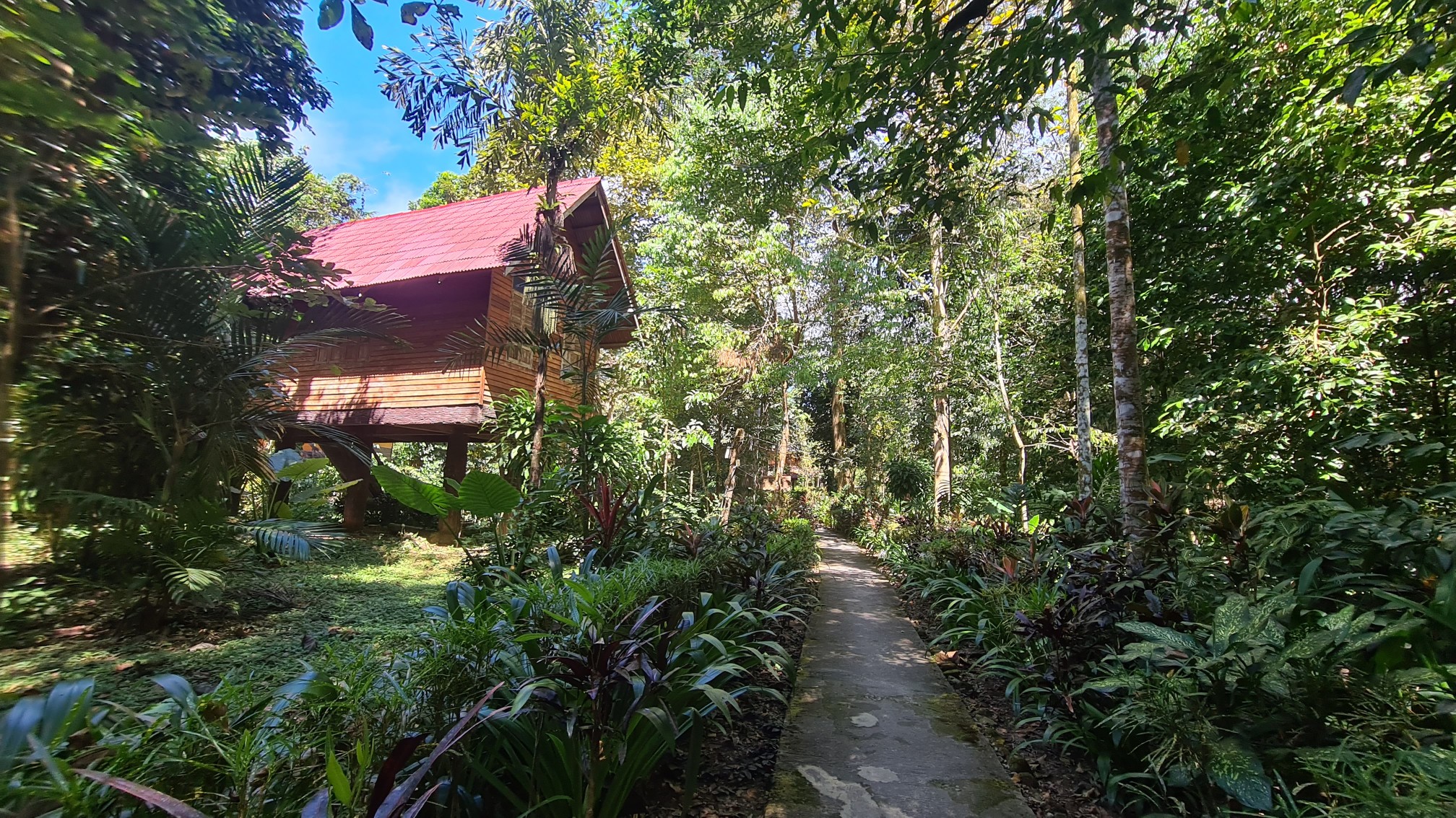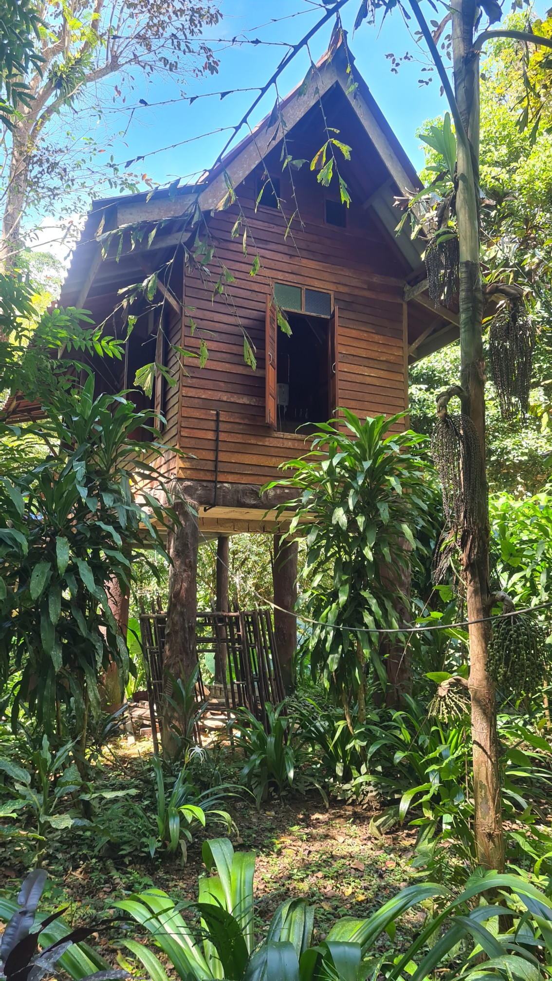 Aber zurück zu meinem Rasta-Man-Driver Louis, der – wie ich die nächsten Tage noch feststelle – meist etwas bekifft oder auch alkoholisiert ist. Auf der Ladefläche bringt er mich zu der wunderbar abgelegenen und in den Urwald eingebetteten Anlage der Art’s Riverview Lodge etwa einen Kilometer vom Ortszentrum entfernt. Es ist unglaublich: Sobald wir in den grünen Dschungel mit den riesigen Bäumen einfahren, liegt ein ohrenbetäubendes Grillenzirpen in der Luft! Ich kann mich nicht erinnern, so etwas Tierisches schon einmal gehört zu haben. Faszinierend!