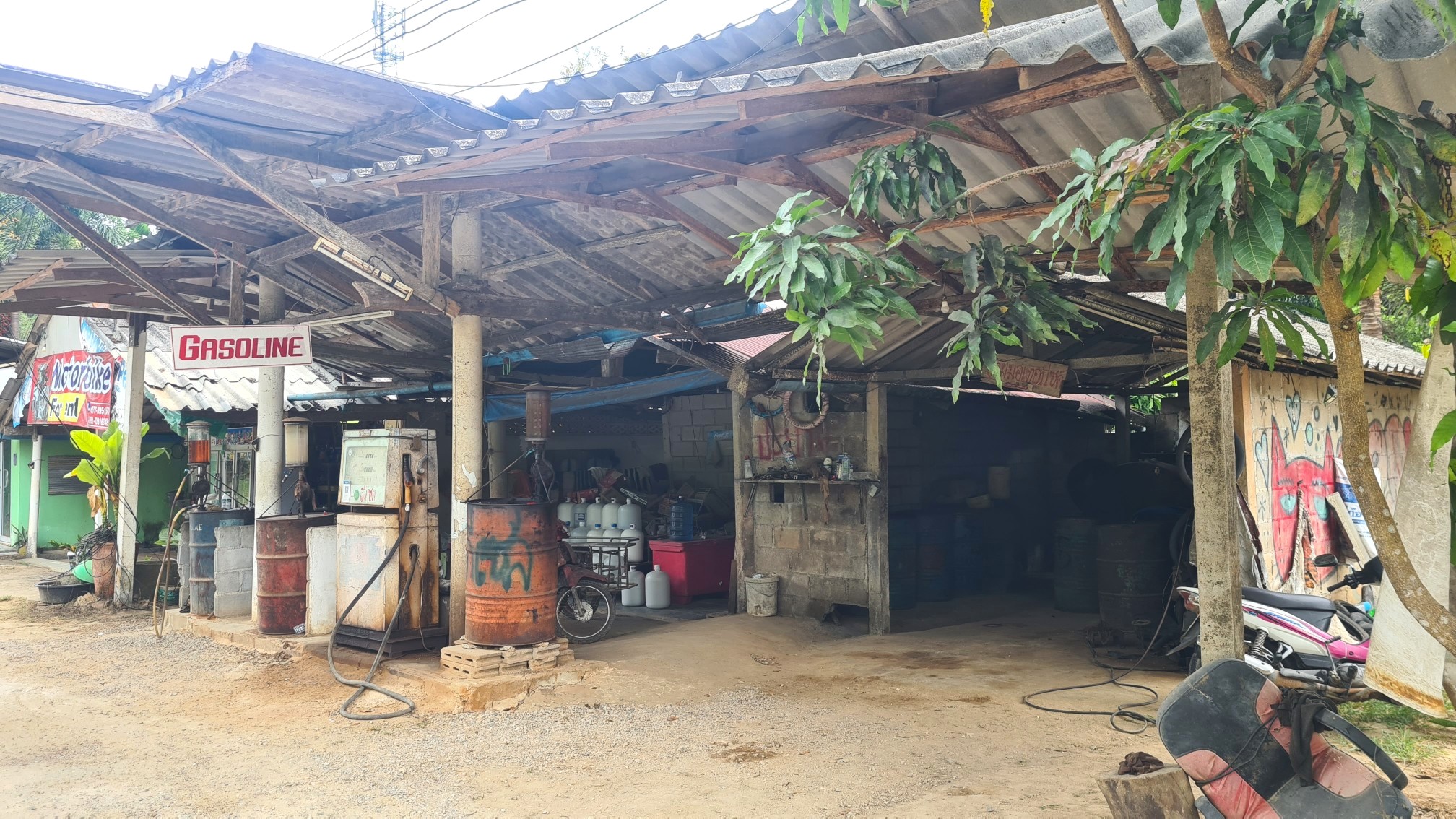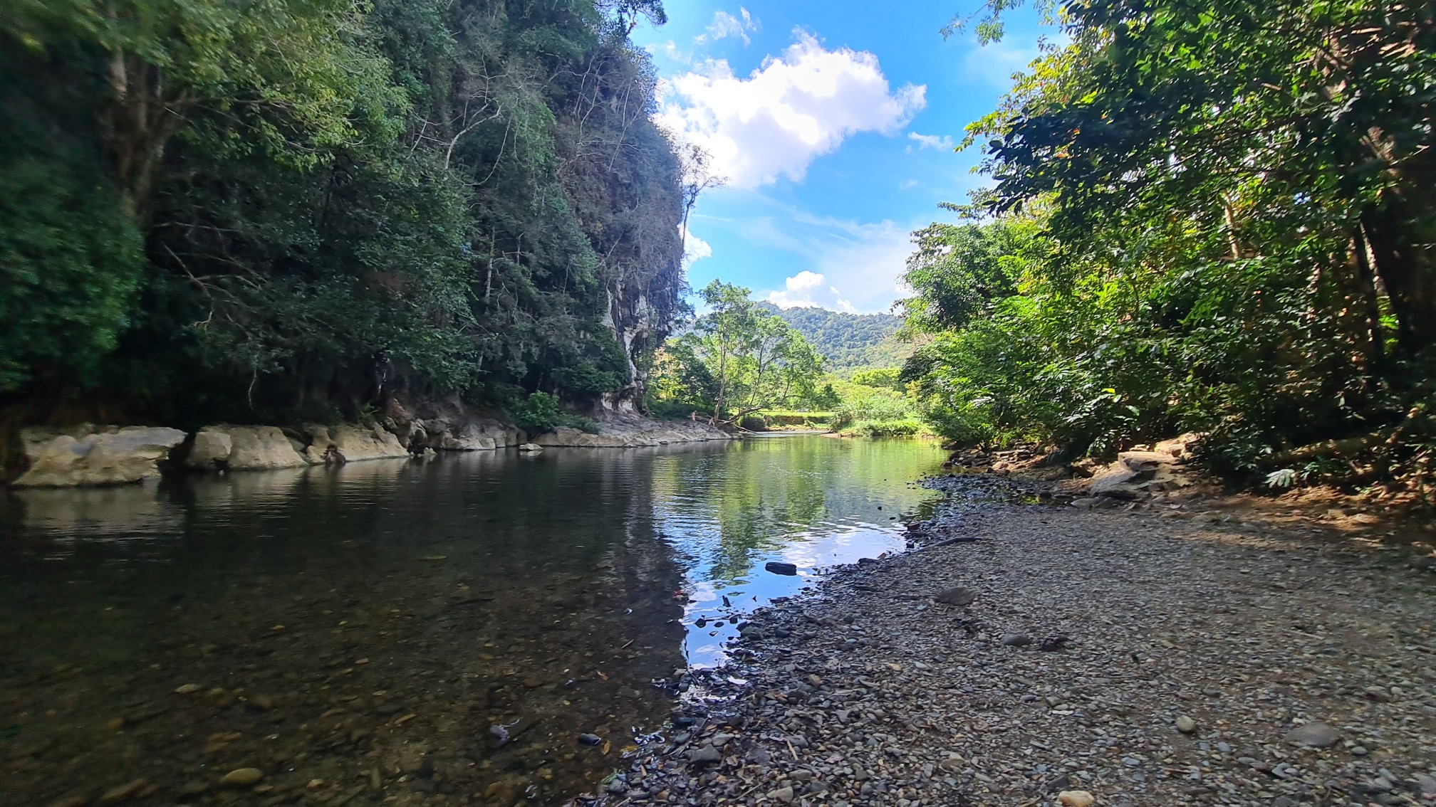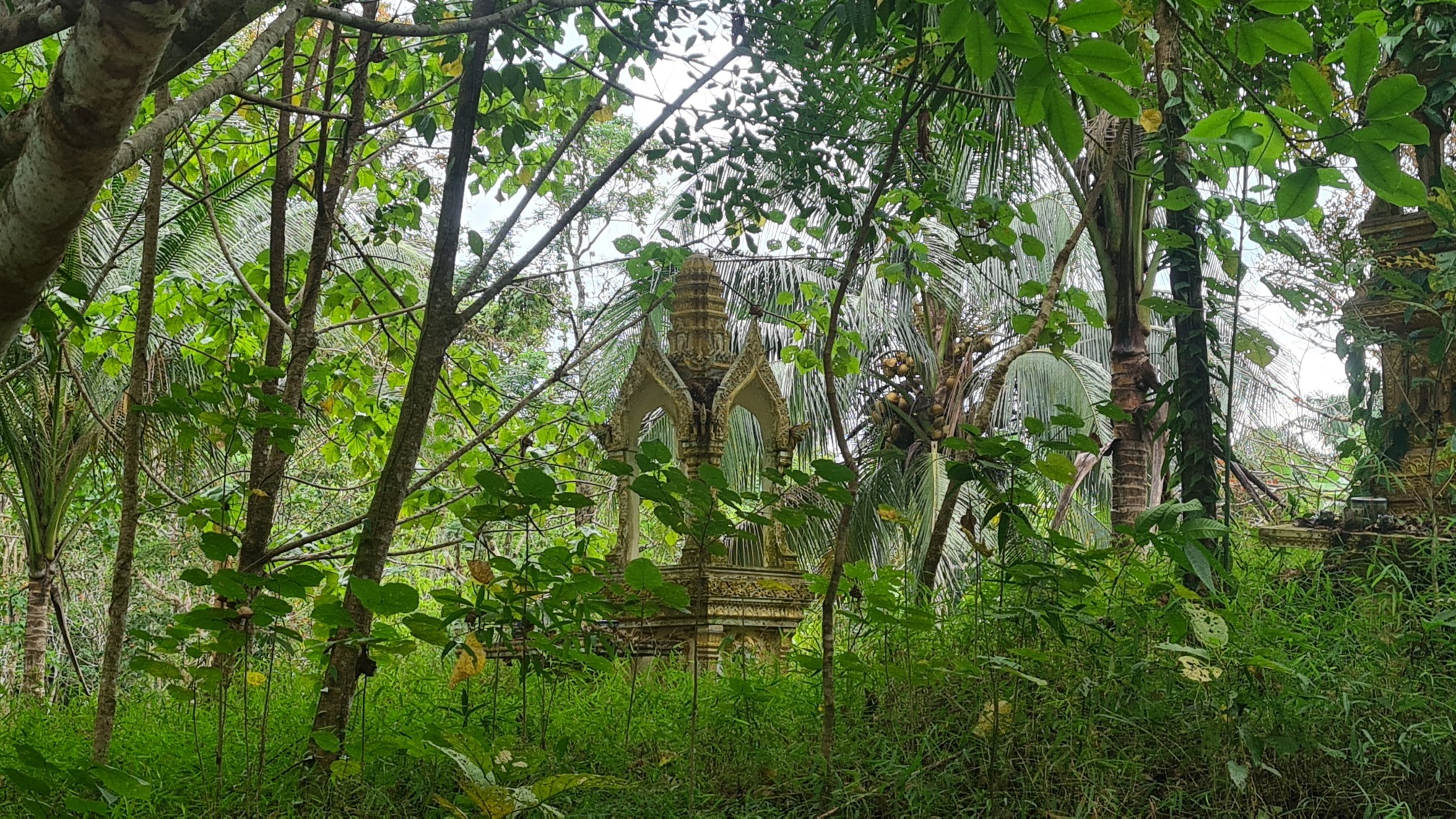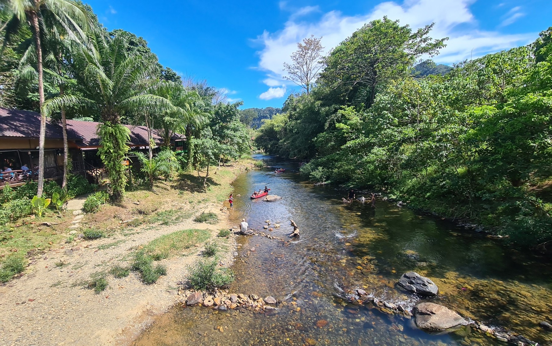 Anschließend wate ich durch den Fluß auf die andere Uferseite und wandere, etwas verwegen, um das Felsmassiv herum – vorbei an noch einsameren Camps, Kautschuk-Plantagen und Lost Places zum Wat an der Hauptstraße und von dort wieder zurück ins Dorf.