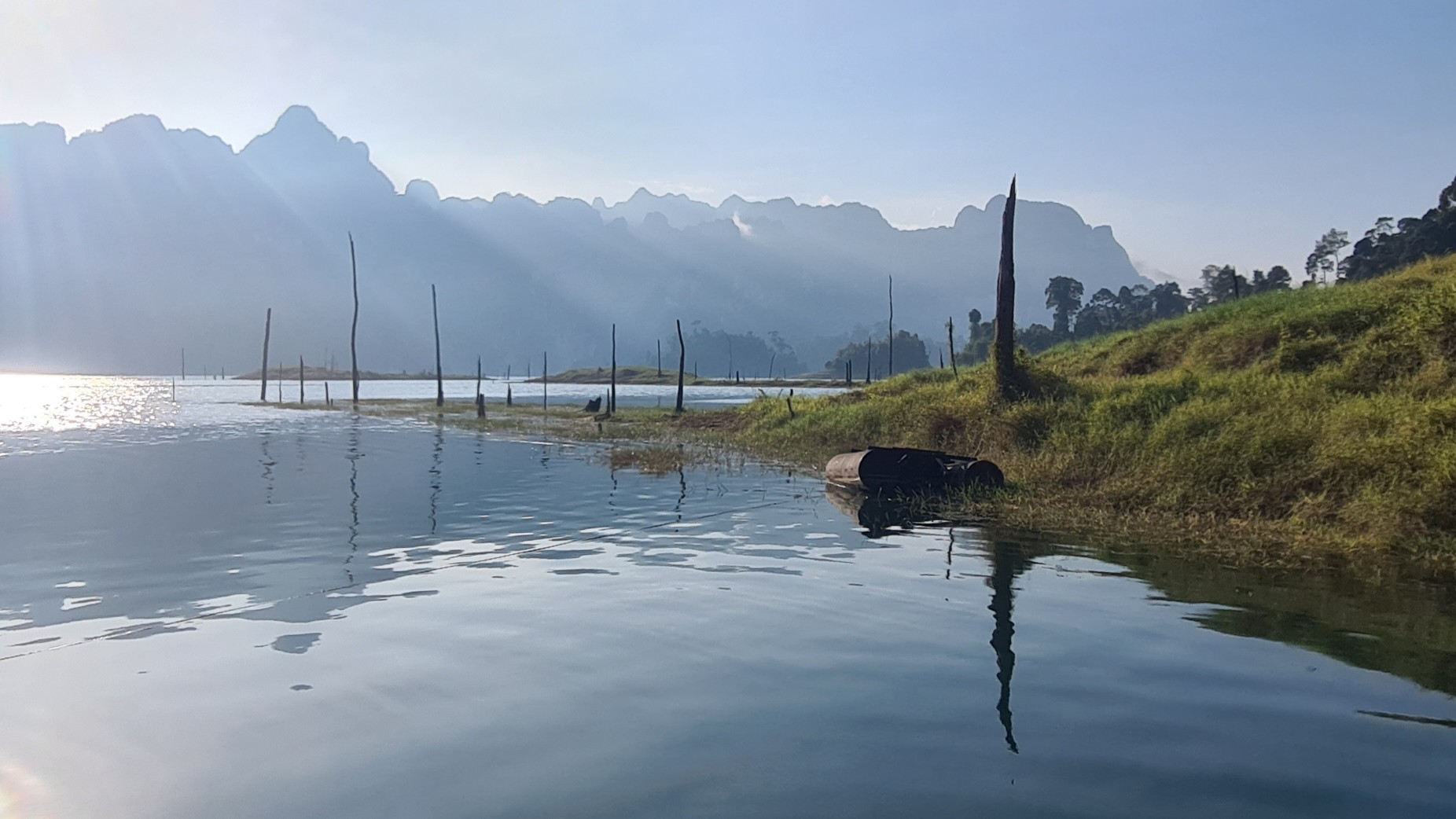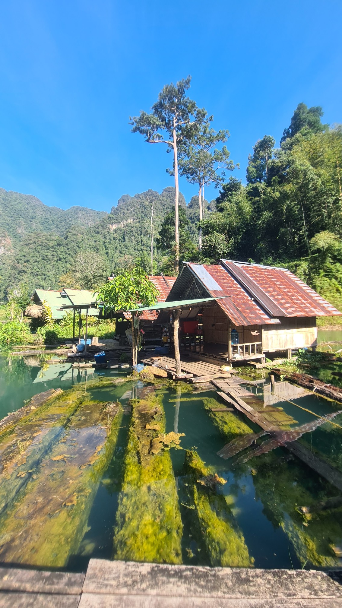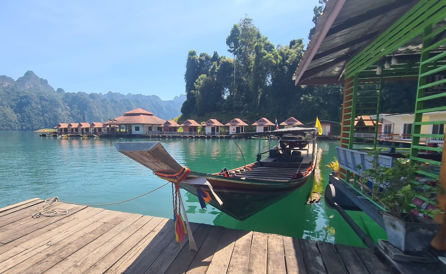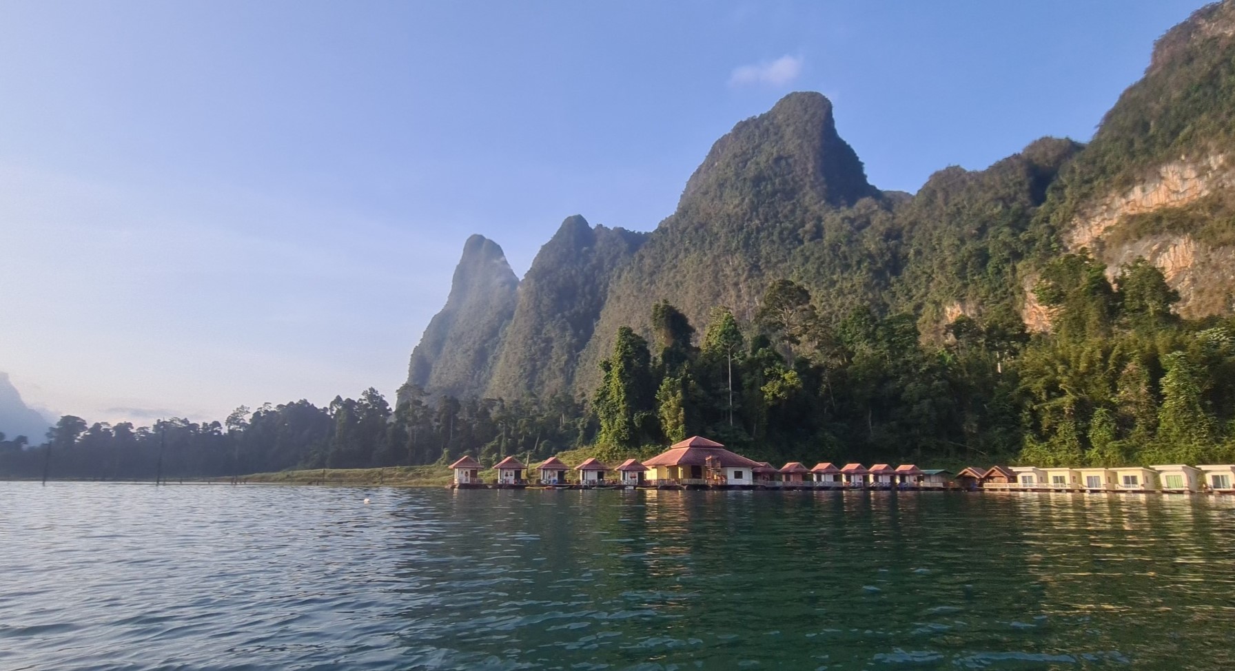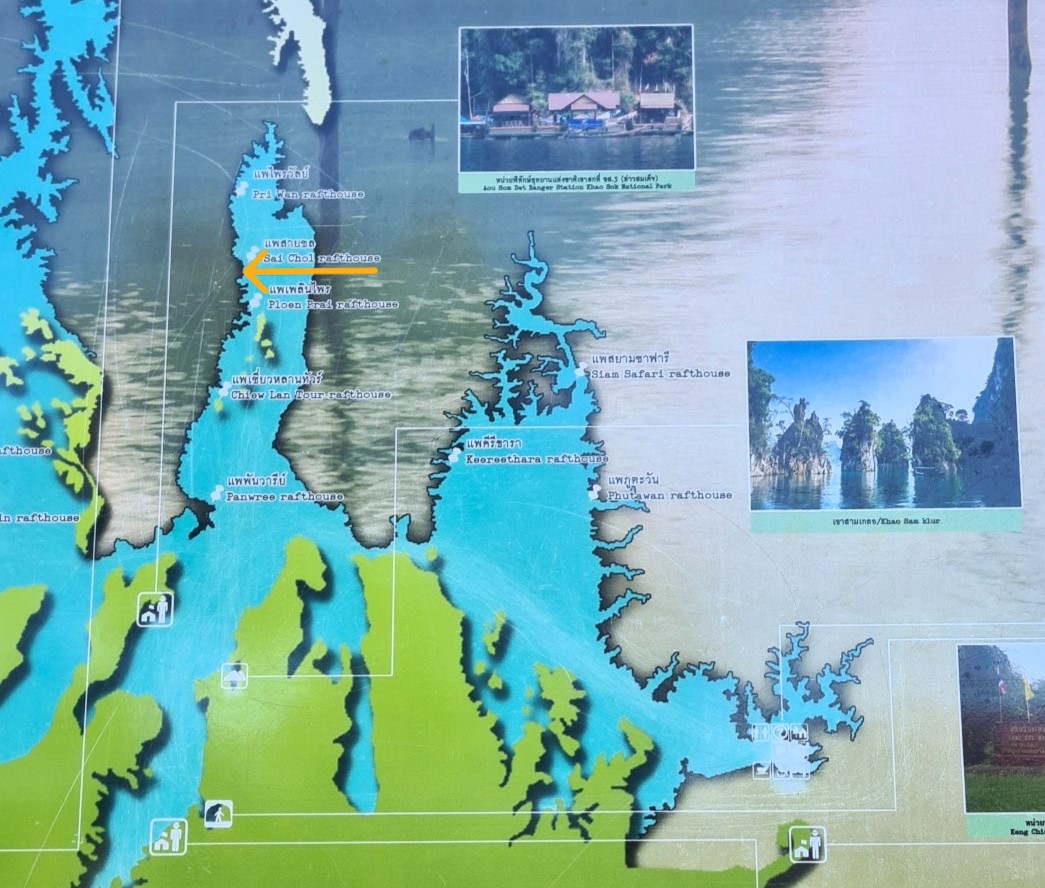 Eigentlich hatte ich, nachdem ich ja ob meines limitierten Reisebudgets eine günstige Unterkunft auf dem See gebucht hatte, nicht sonderlich viel erwartet. Nach den Fotos bei der Recherche zu urteilen, waren viele der schwimmenden Billig-Unterkünfte vor Corona ziemlich marode. Aber bereits von Weitem ist zu erkennen, dass das Phae Sai Chol Raft zu einer der inzwischen renovierten Locations gehört und vor allem eine absolute Traumlage hat.