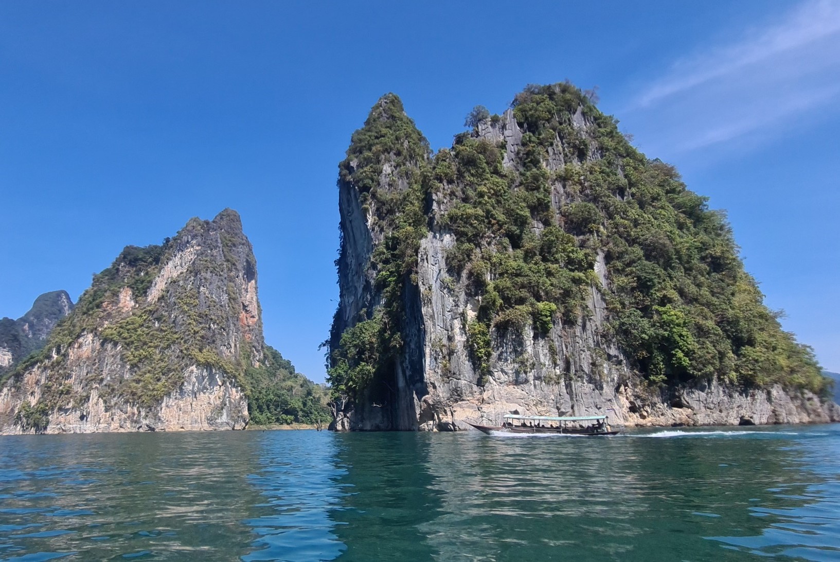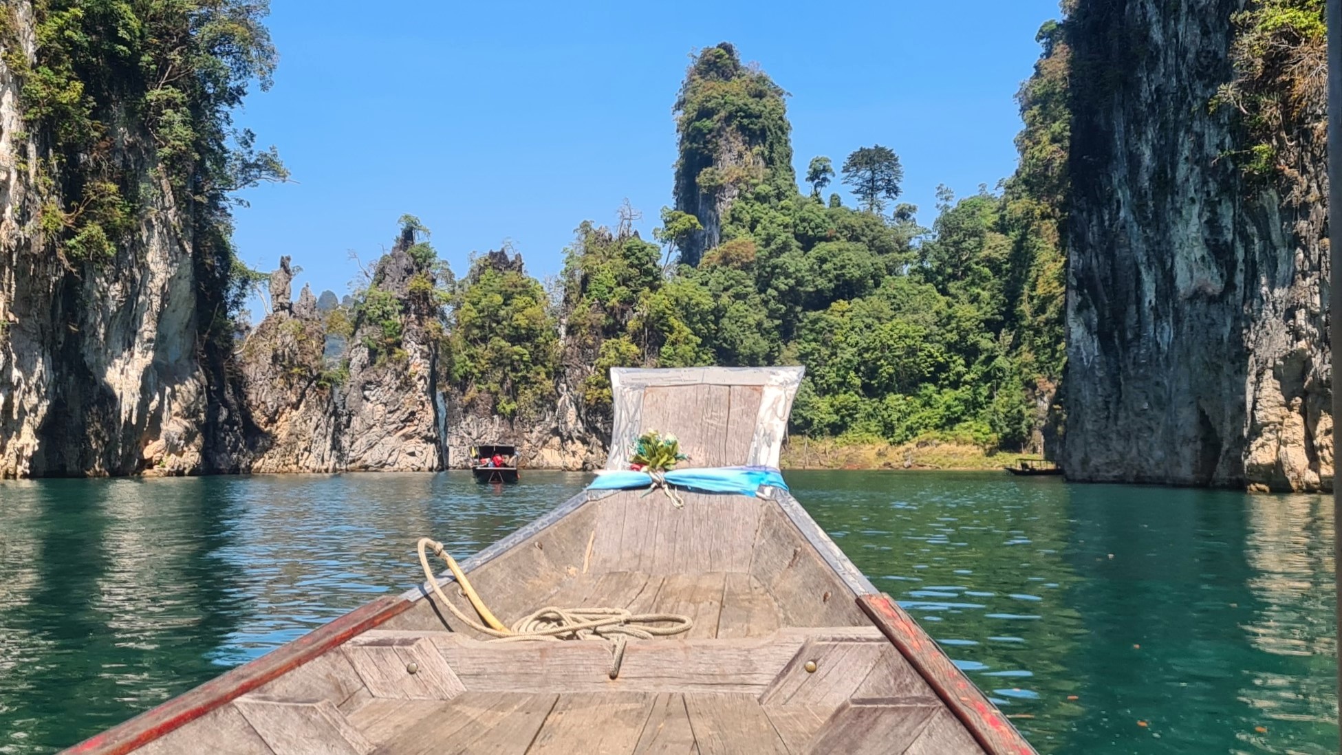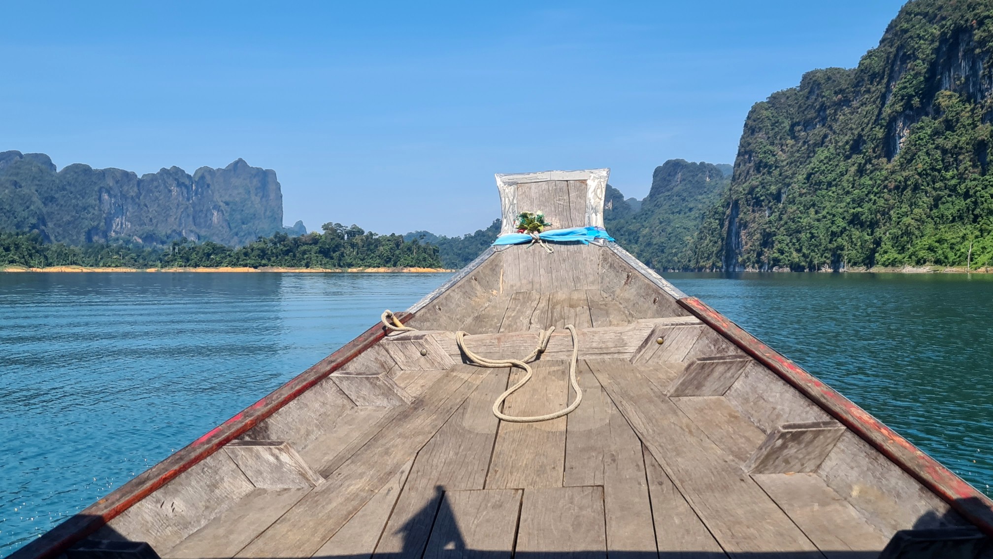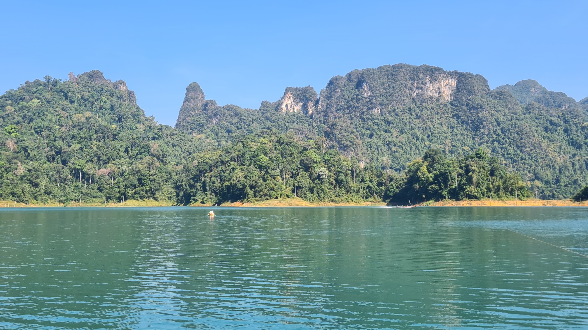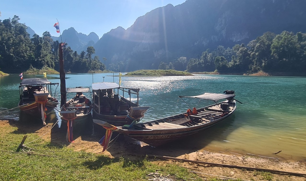 Aber der Reihe nach: Vorschriftsmäßig mit Schwimmwesten ausstaffiert starten wir mit unserem voll besetzten Longtailboot zu unserer ersten Ausfahrt auf dem 165 km² großen Cheow Lan Lake, der durch den Bau des Rajjabrapha Staudammes 1982 entstanden und von einem der ältesten Regenwälder der Welt umgeben ist. Auch wenn unser Guide meint, er müsse sich als Gallionsfigur in Szene setzen, sind die Ausblicke über die riesige Wasserfläche zu den rundum liegenden Karstbergen ein Traum. Nichts als Natur, Wasser, bizarre Kalksteinfelsen und Dschungel so weit das Auge reicht.