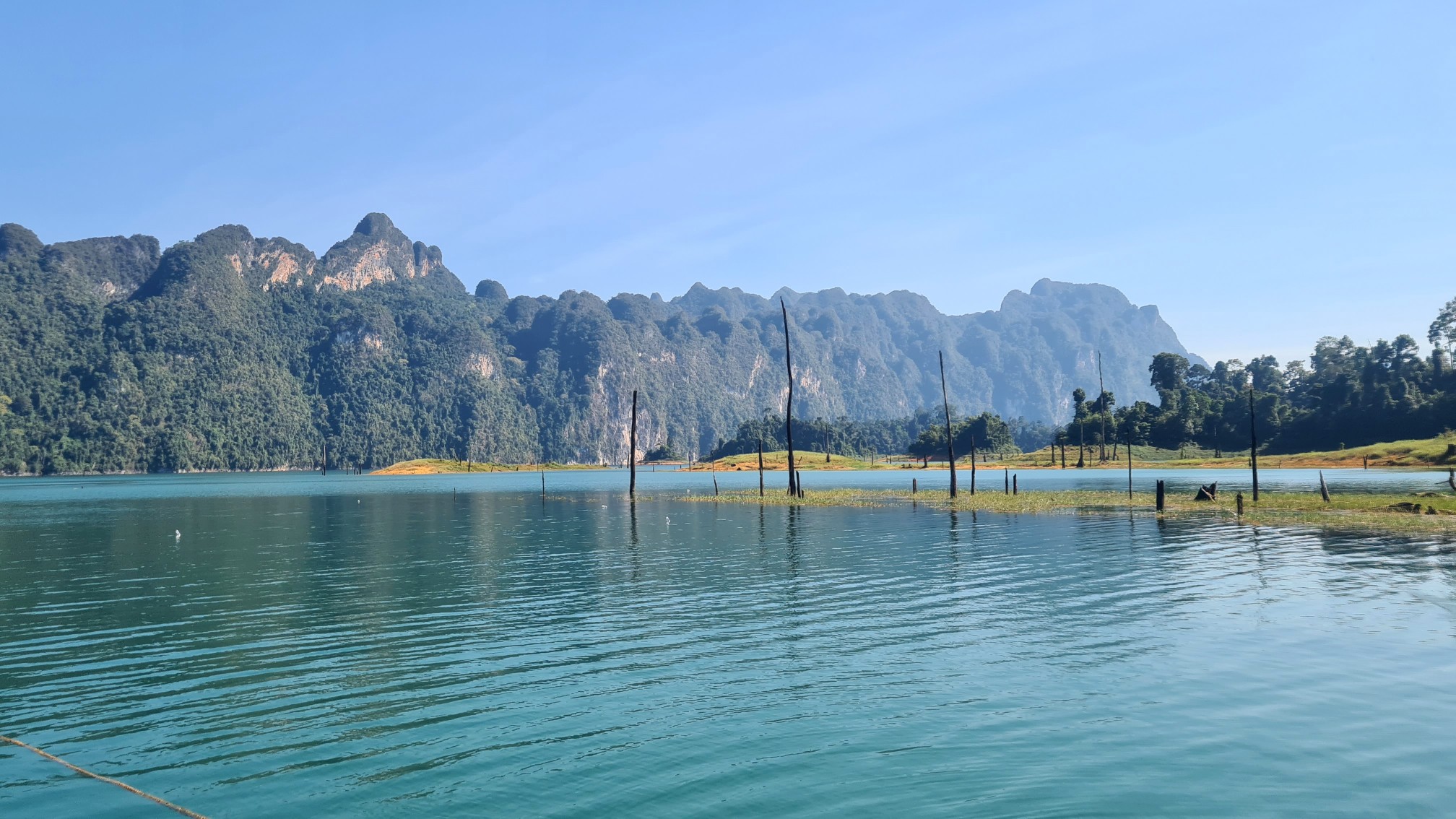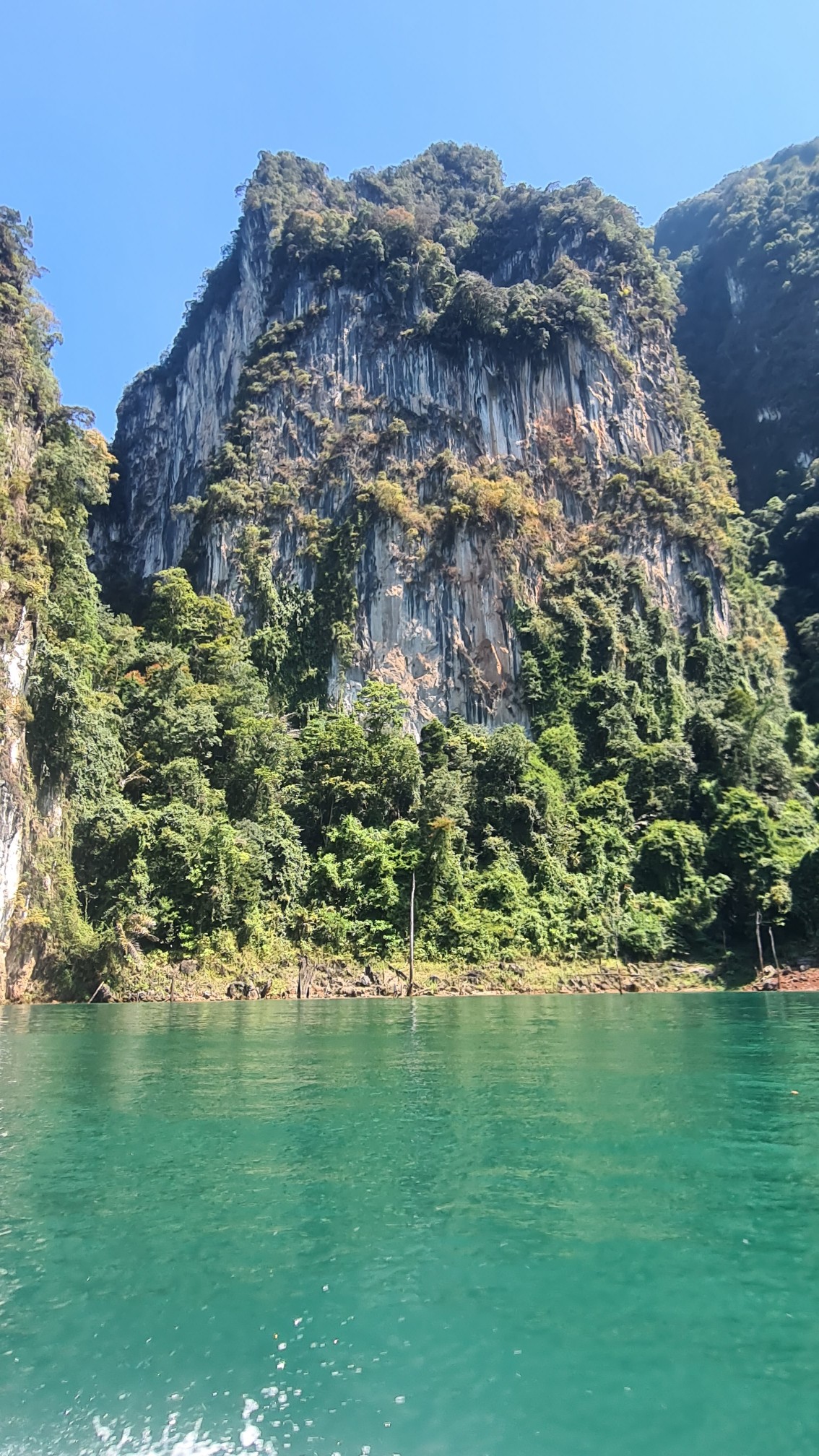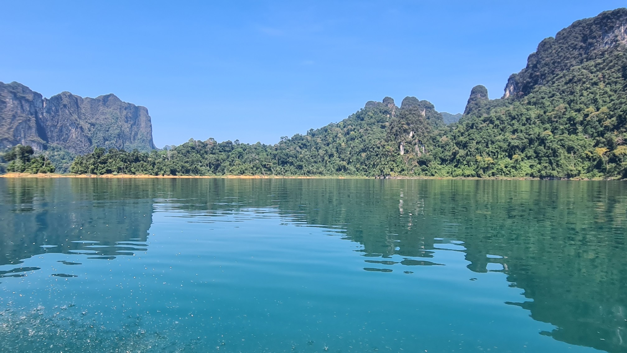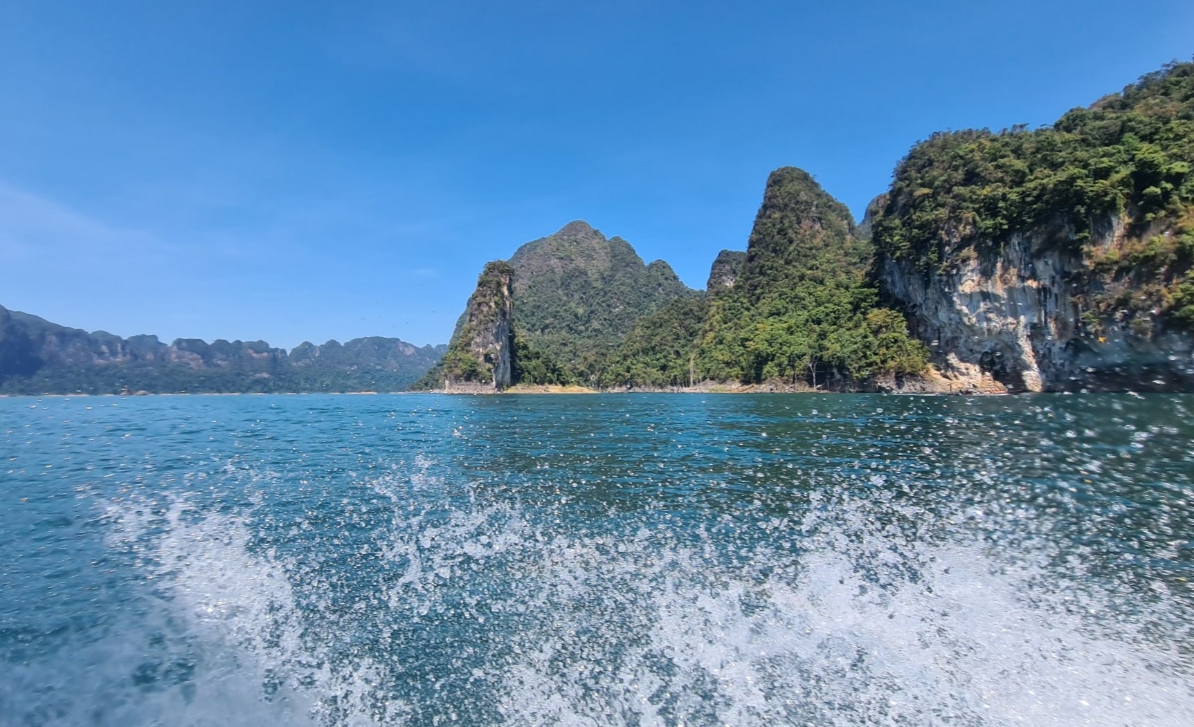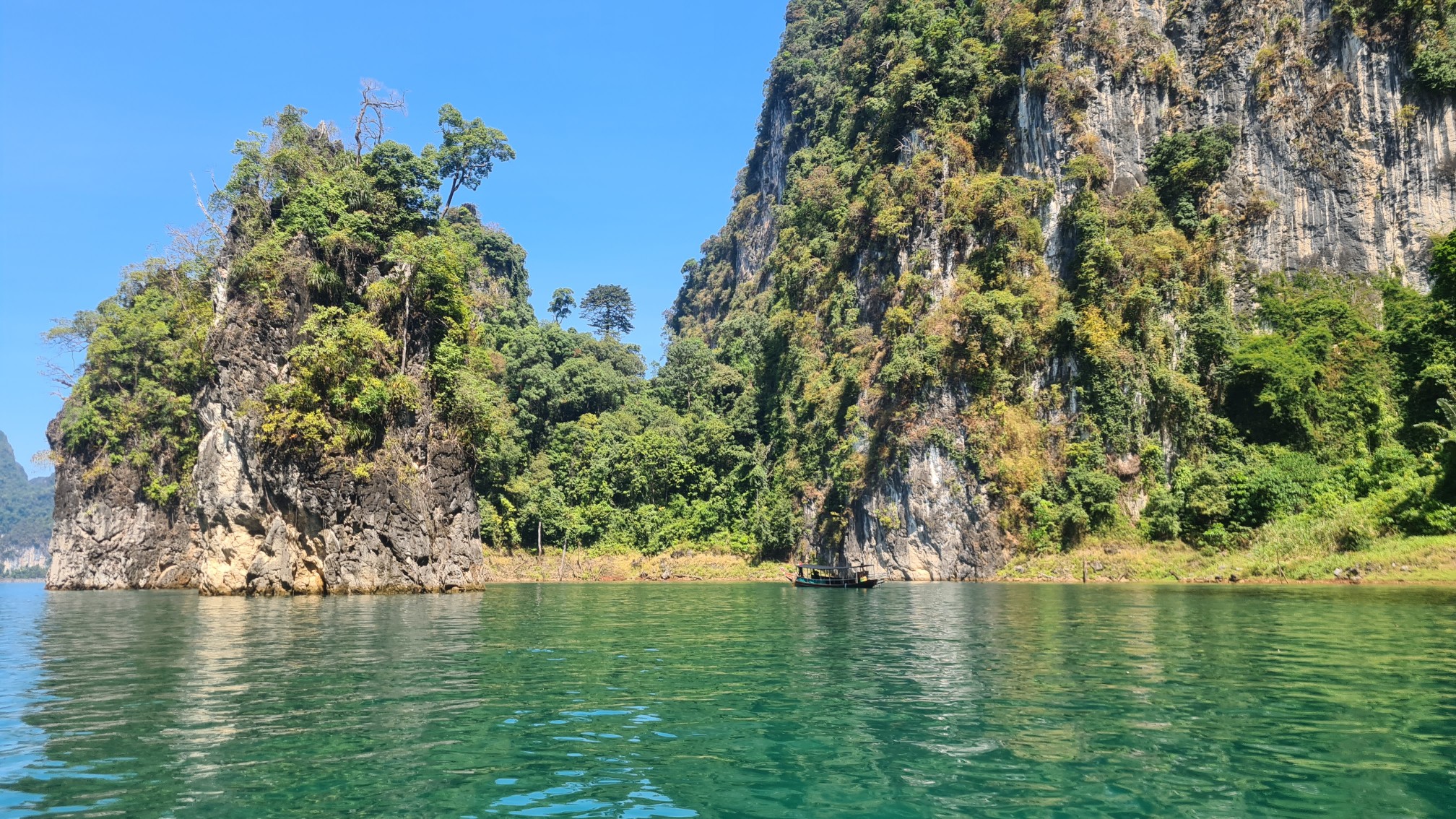 Aber der Reihe nach: Vorschriftsmäßig mit Schwimmwesten ausstaffiert starten wir mit unserem voll besetzten Longtailboot zu unserer ersten Ausfahrt auf dem 165 km² großen Cheow Lan Lake, der durch den Bau des Rajjabrapha Staudammes 1982 entstanden und von einem der ältesten Regenwälder der Welt umgeben ist. Auch wenn unser Guide meint, er müsse sich als Gallionsfigur in Szene setzen, sind die Ausblicke über die riesige Wasserfläche zu den rundum liegenden Karstbergen ein Traum. Nichts als Natur, Wasser, bizarre Kalksteinfelsen und Dschungel so weit das Auge reicht.