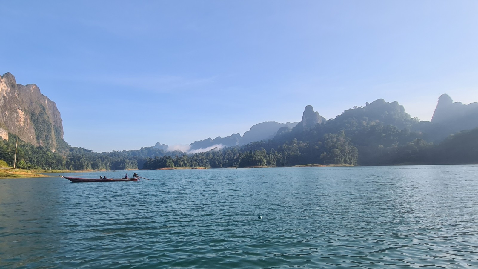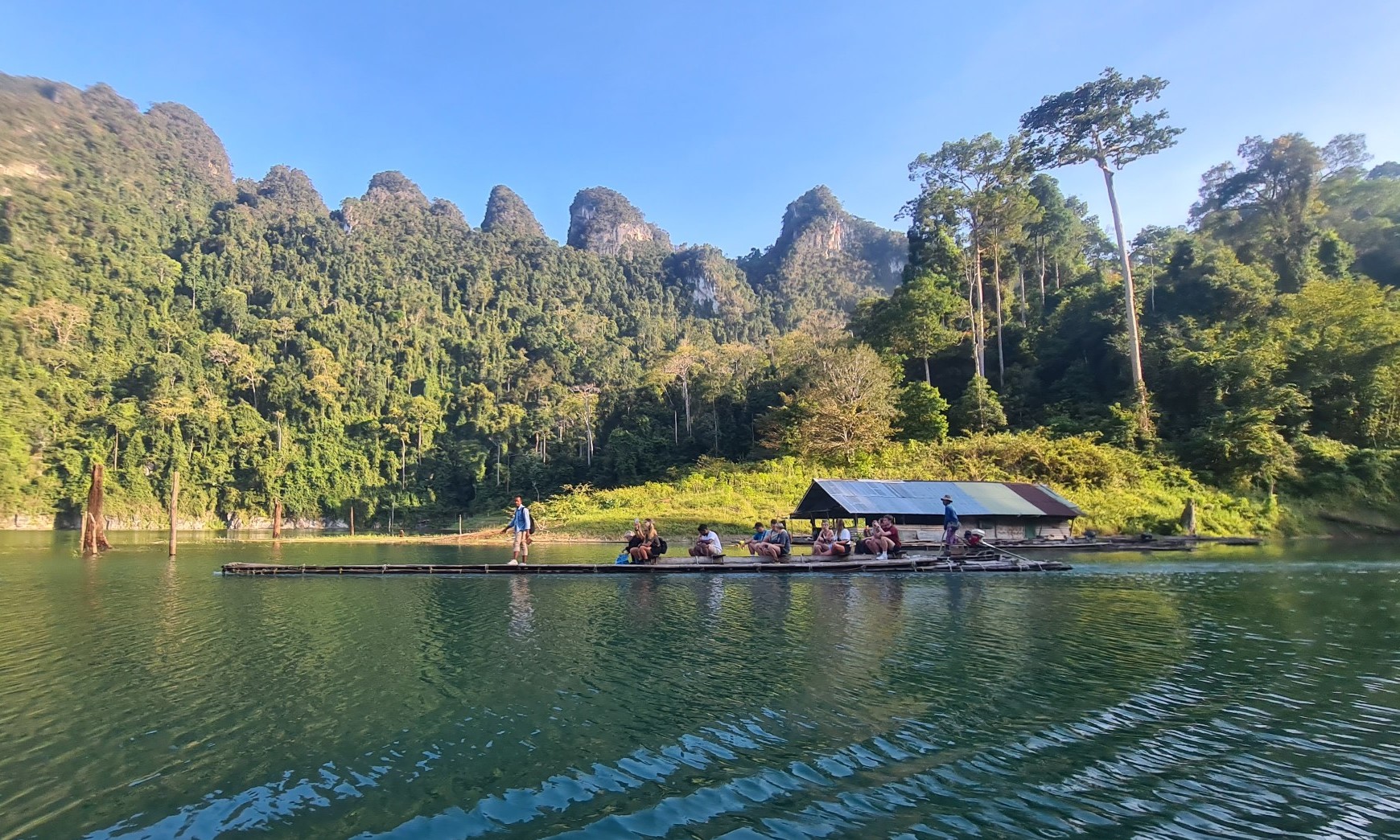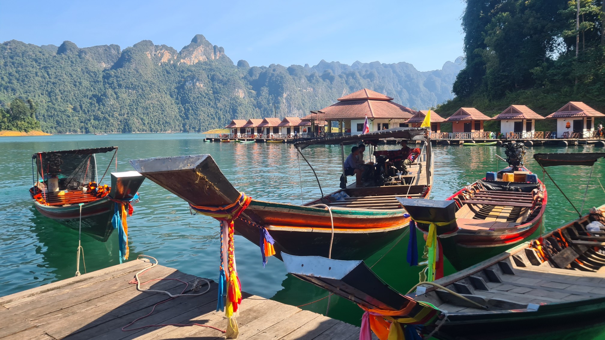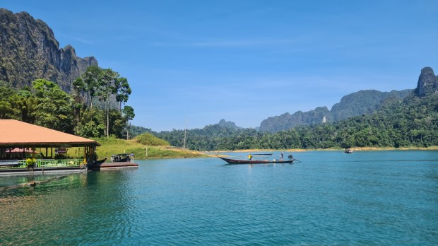 Nach knappen zwei Stunden steuern wir dann mit leuchtenden Augen auf unser schwimmendes Zuhause zu. Das schaut phantastisch aus! Ein kleines, einsames Paradies in einem der weit verzweigten Seitenäste des Cheow Lan Sees und mit einer atemberaubenden 360° Kulisse.