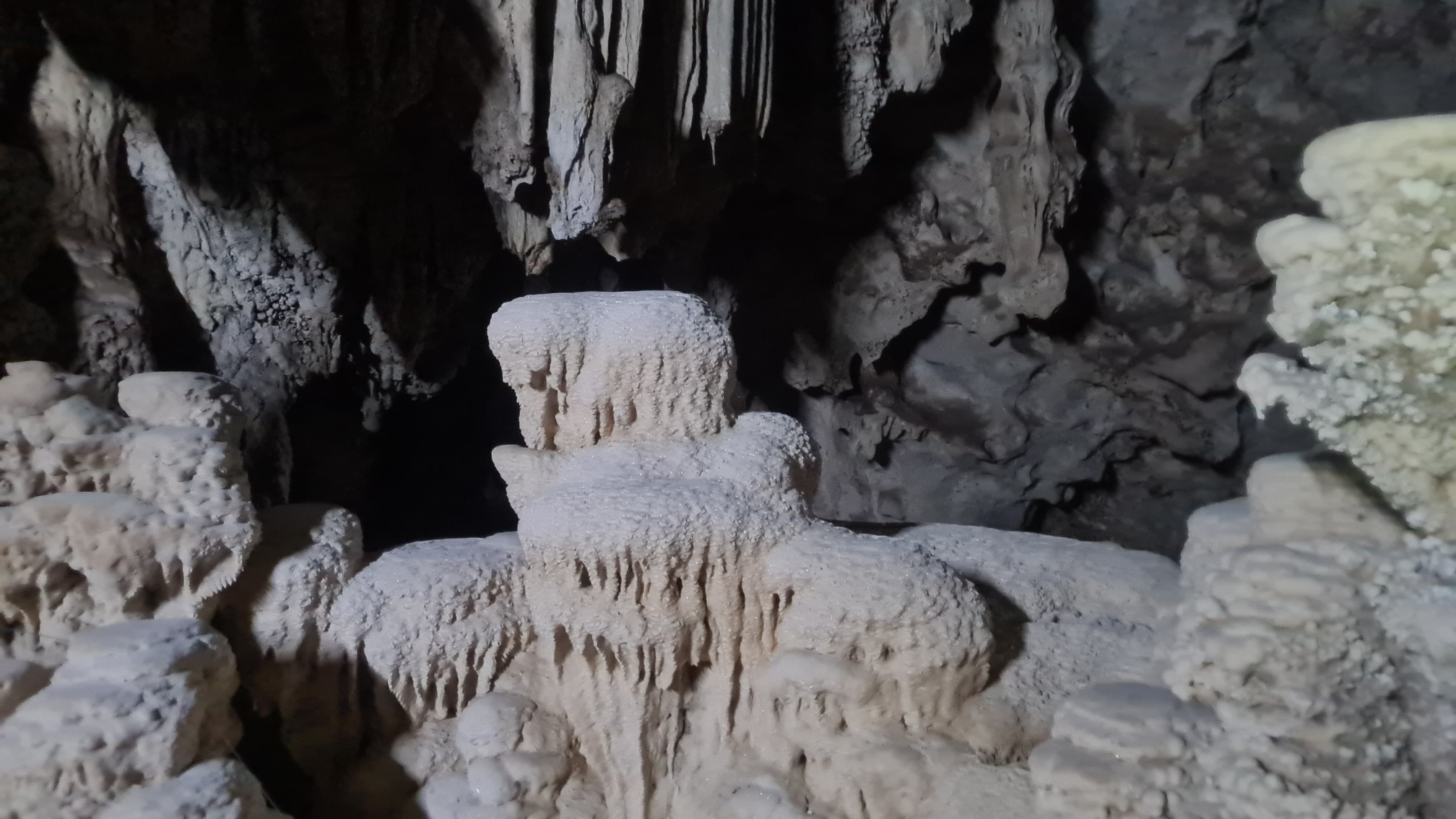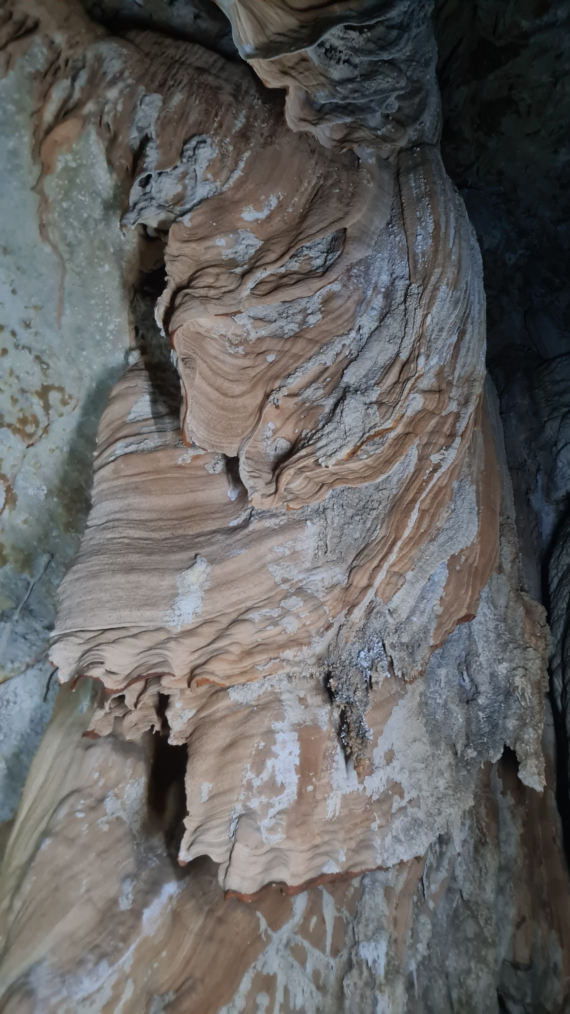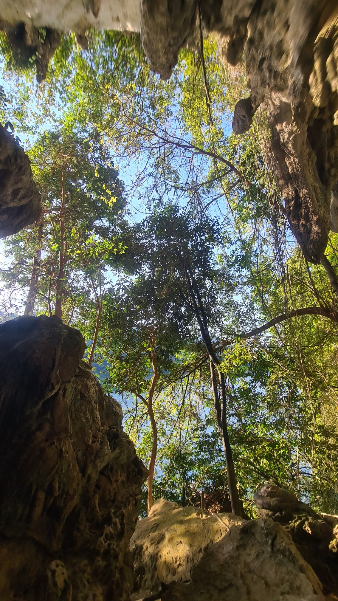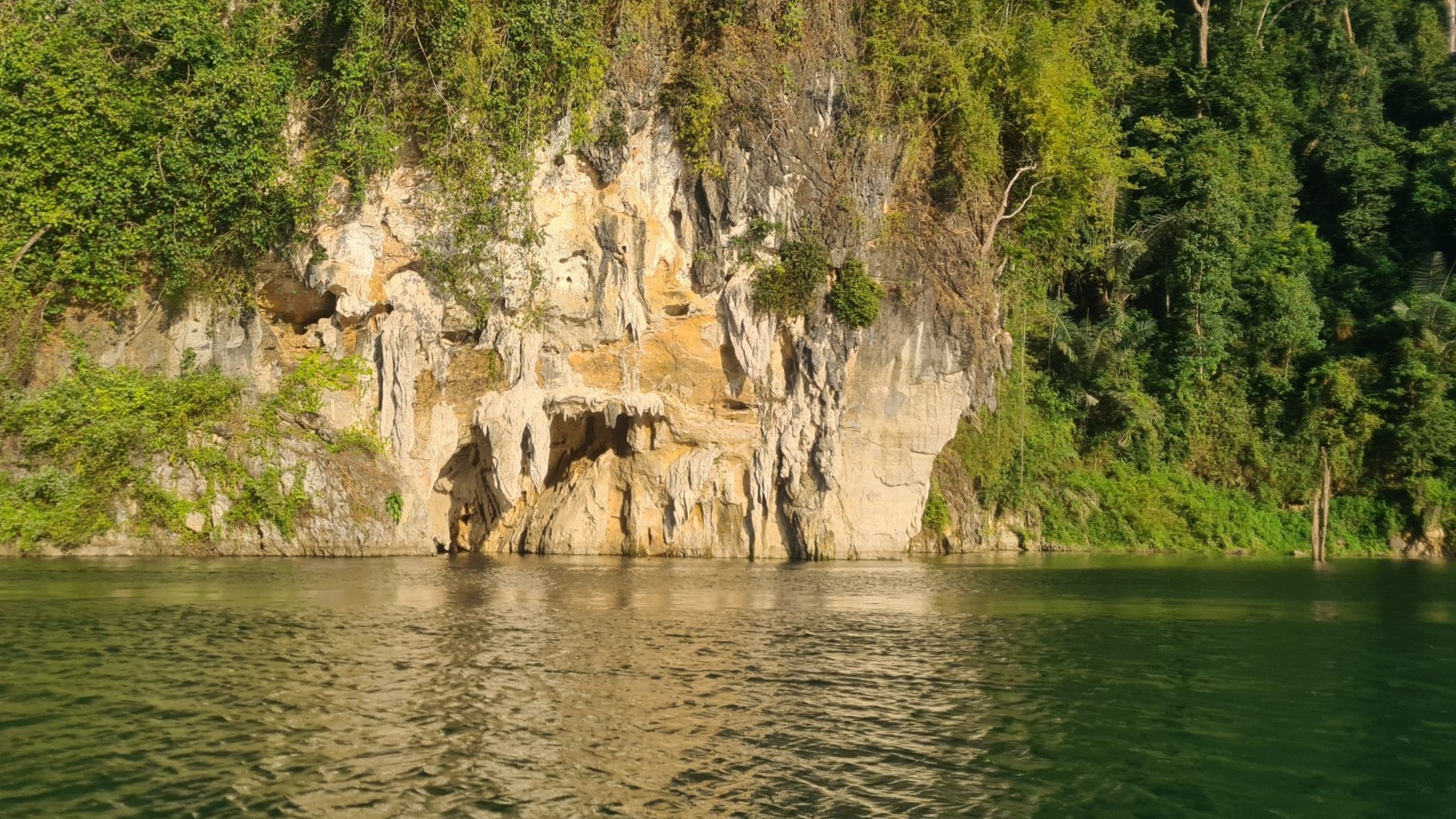So schippern wir also mit unserem Longtail wieder eine Weile über den so verzweigten See, genießen die Natur und ertragen den immens lauten Motor der thailändischen Boote. Von einem Anlegeplatz führt uns eine kleine Wanderung, bei der wir eigentlich auch Ausschau nach Tieren und Pflanzen halten wollen (siehe Anmerkung oben), zu einer weiteren Bucht, von wo uns ein Bamboo-Floß auf die andere Seite zu einer bergseitig gelegenen Karsthöhle bringen soll. Noch ist eine andere Gruppe vor uns und es sind nur zwei Bamboo-Rafts vor Ort, die eine Weile unterwegs sind. Aber nach einer Stunde Abhängen an dem nicht ganz hässlichen Ort setzen auch wir über und besichtigen die Höhle.