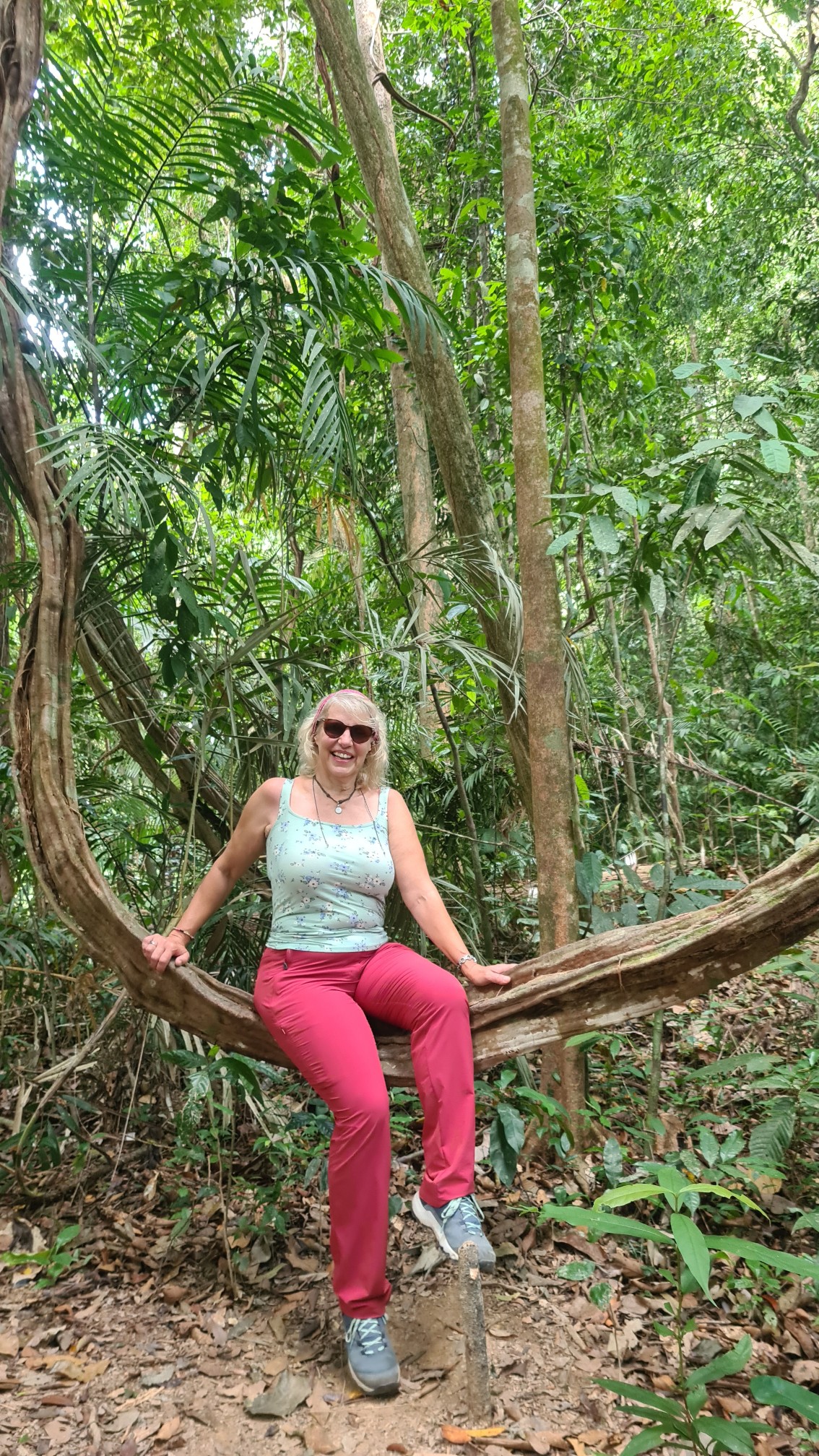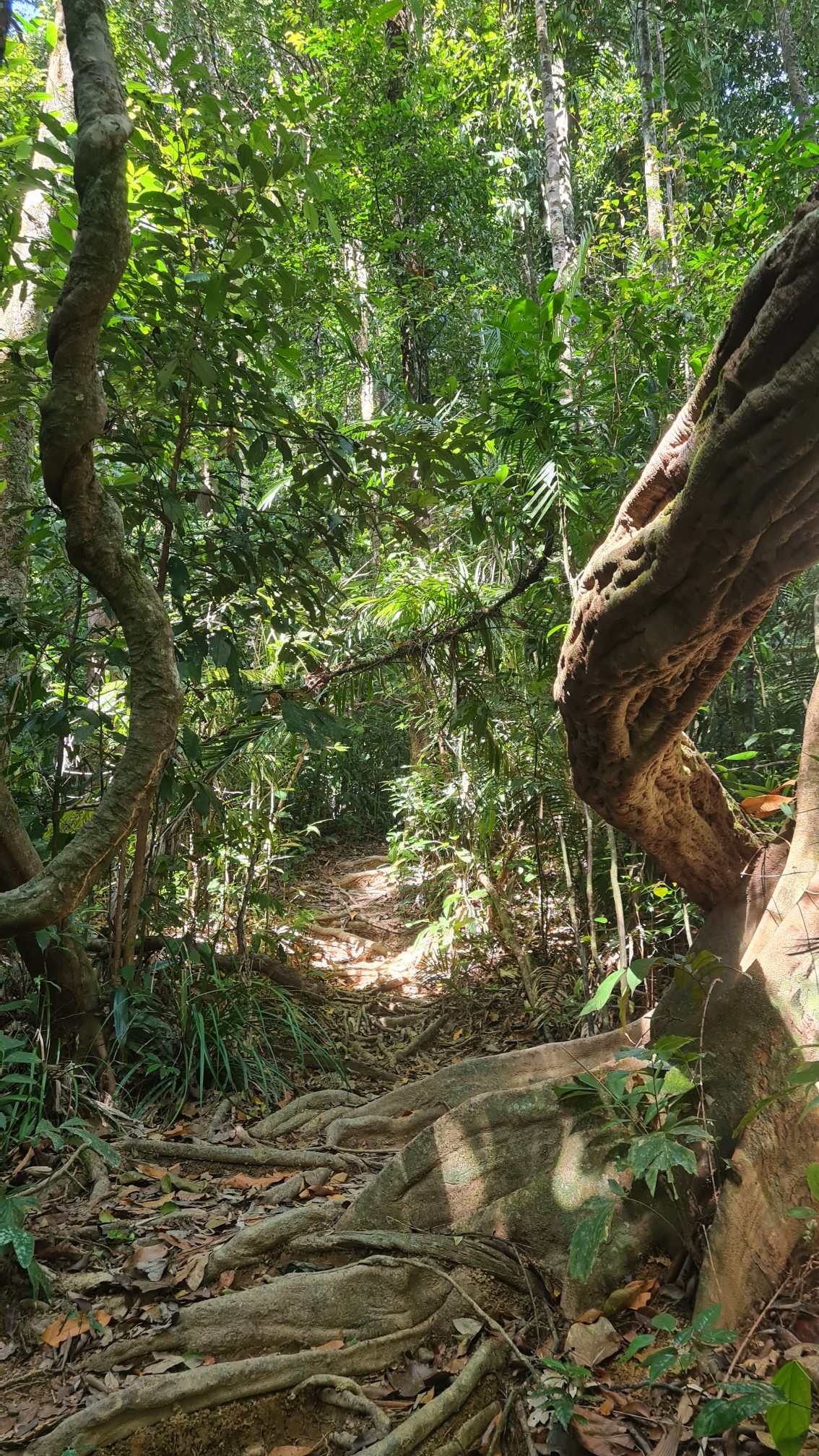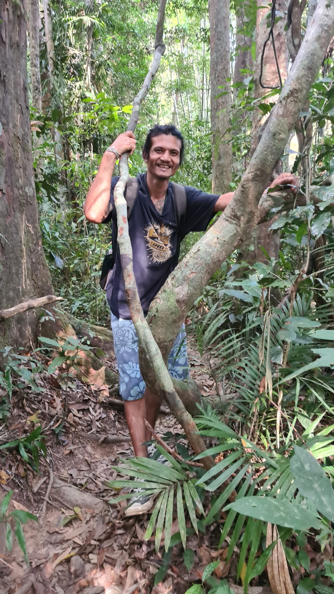Bom und ich verstehen uns blendend. Er ist ein offener, witziger und interessierter Typ. Redet nicht zu viel und nicht zu wenig und beantwortet mir alle Fragen, die mir auf der Zunge liegen. Kaum haben wir den Kontrollposten für den Aufstieg zu dem Lianenwald mit den Rafflesia passiert, treffen wir … Pom. Er hat doch tatsächlich nur ein englischsprachiges Pärchen um die 30 zu führen – da hätte er mich ja locker noch mitnehmen können. Aber auch in natura ist er mir nicht wirklich sympathisch, auch wenn er ob seiner rüden Absage an mich Reue zeigt. Bom und ich überholen die drei und klettern in bester Laune über den schmalen Pfad den Bergrücken hinauf, betrachten Insekten und Pflanzen, schwingen auf Lianen und haben viel zu lachen.
