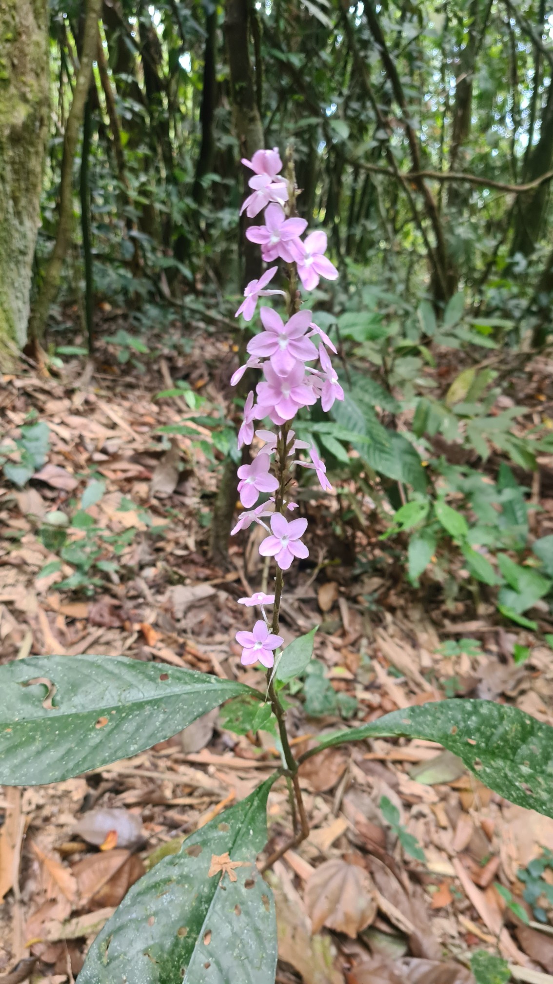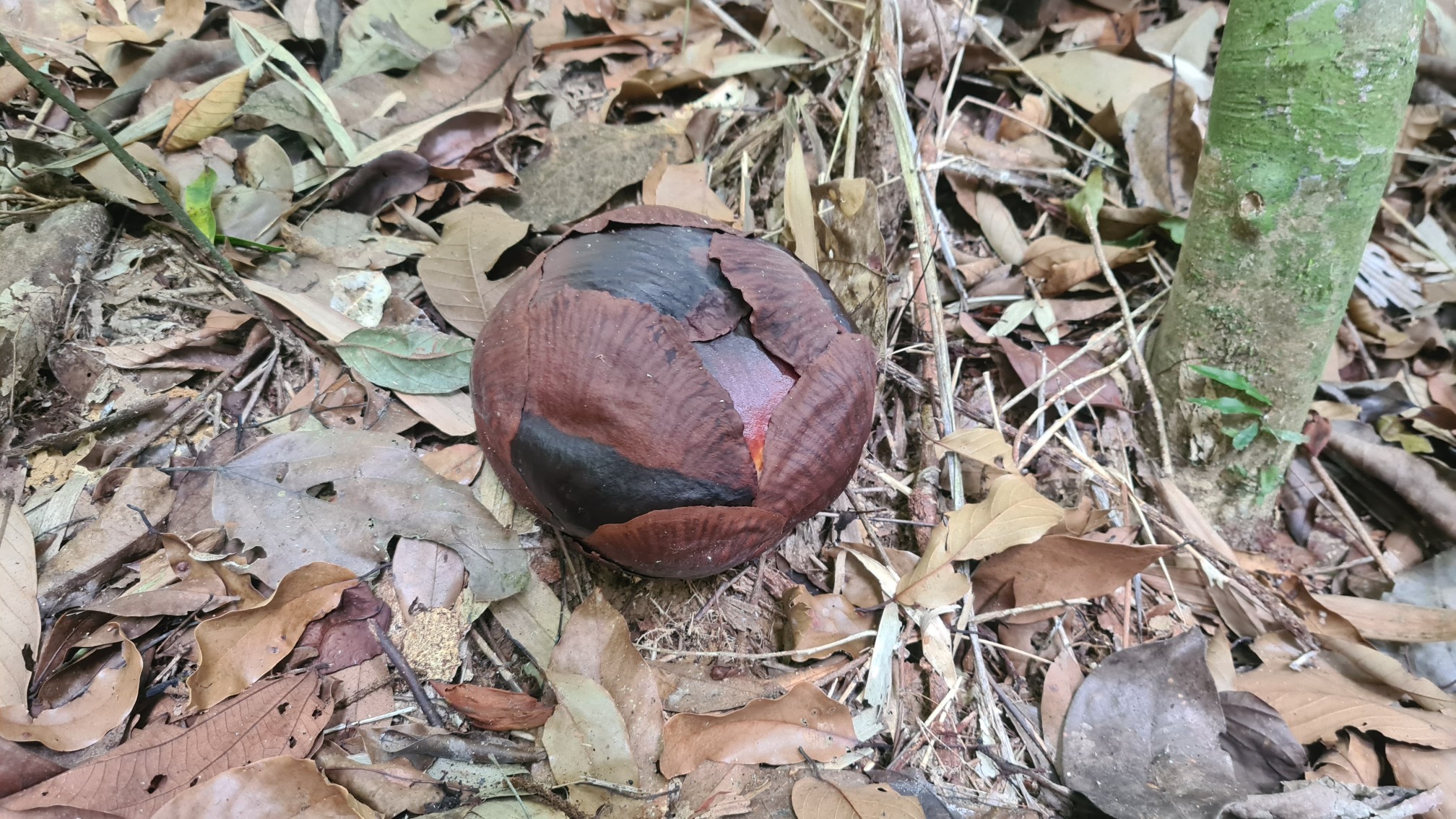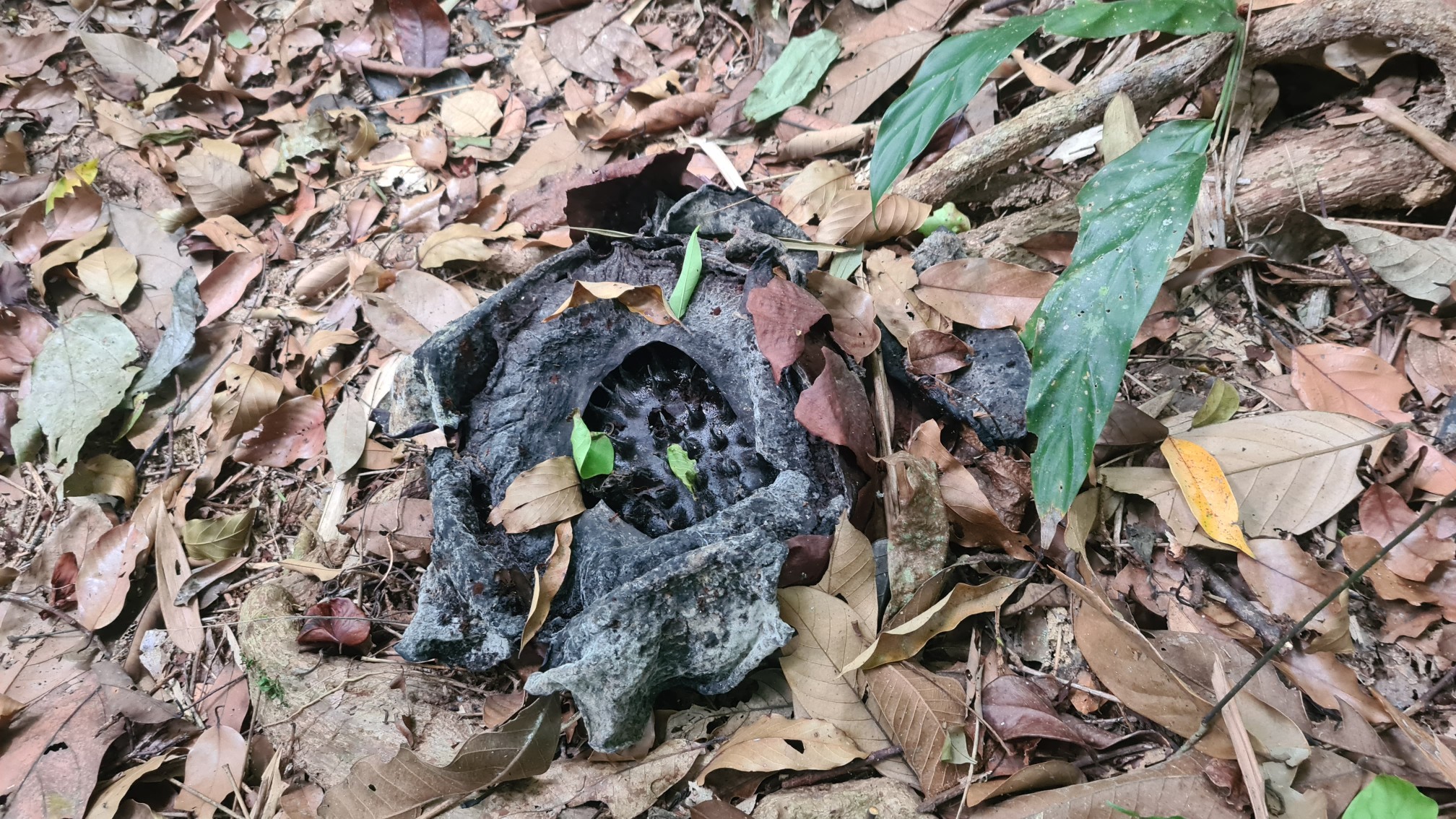 Nach zwei sehr kurzweiligen Stunden erreichen wir das kleine Waldgebiet, wo sich die Schmarotzer-Pflanze Rafflesia als Mycel in ihre Wirtspflanze, die Liane, eingenistet hat. Hier lebt und ernährt sie sich ausschließlich über ihren Wirt und treibt innerhalb der Liane Knospen, die allerdings zu 80-90% schon in der Wirtspflanze absterben. Die verbleibenden bilden nach ca. 9 Monaten eine Blüte aus, die zu Anfang auf dem Waldboden liegt wie ein großer, dunkelroter Kohlkopf.
