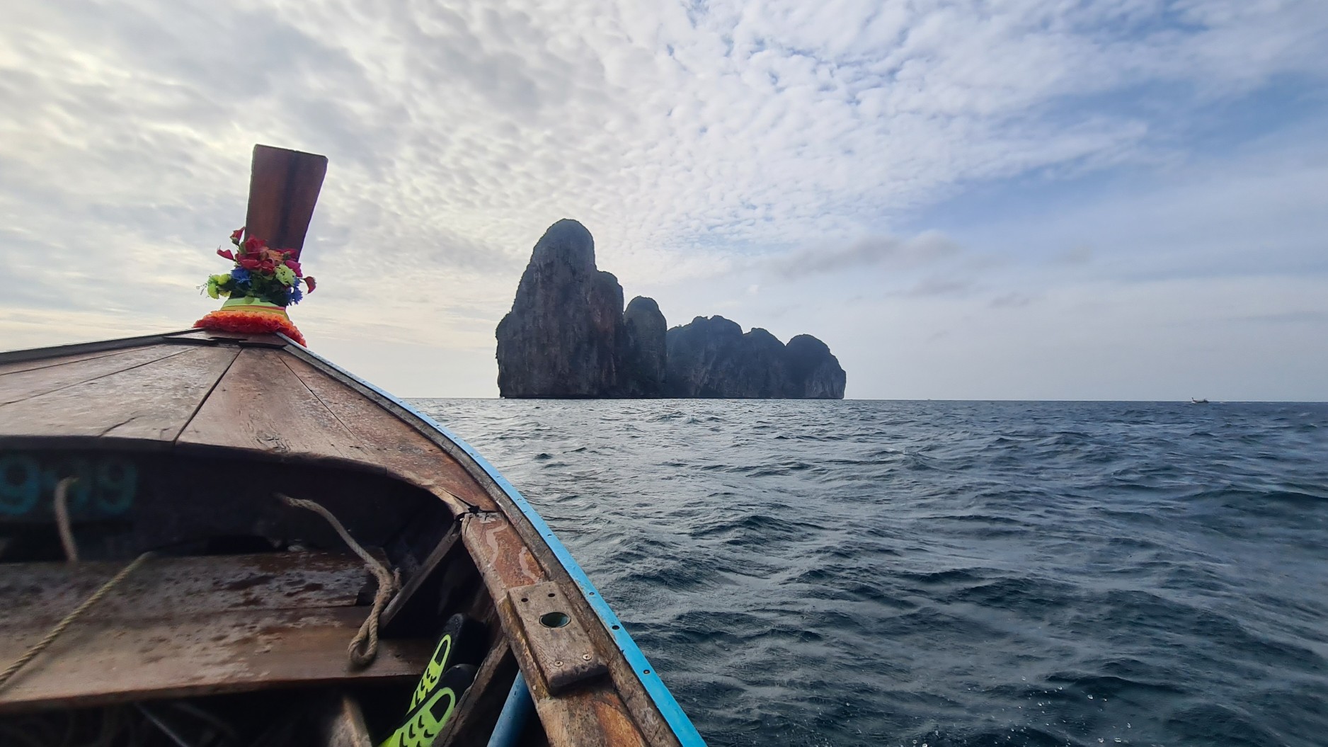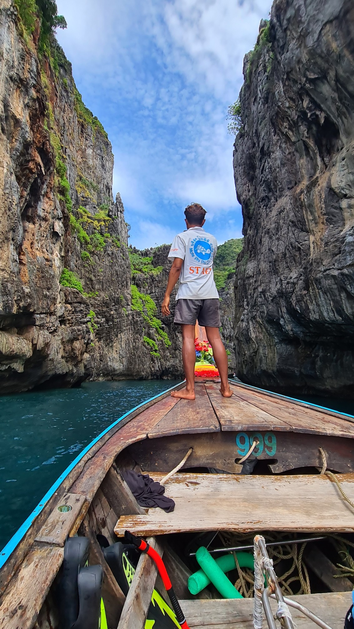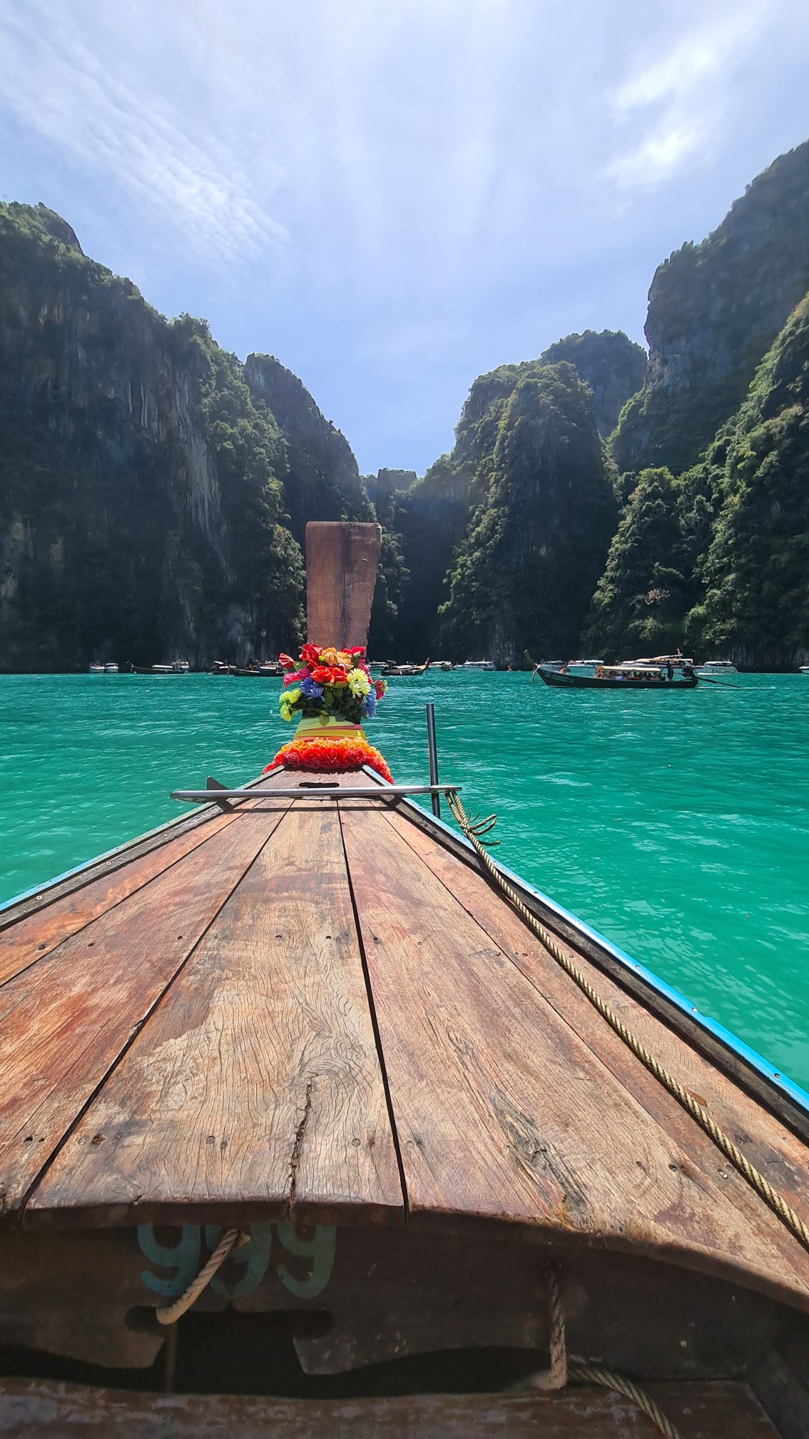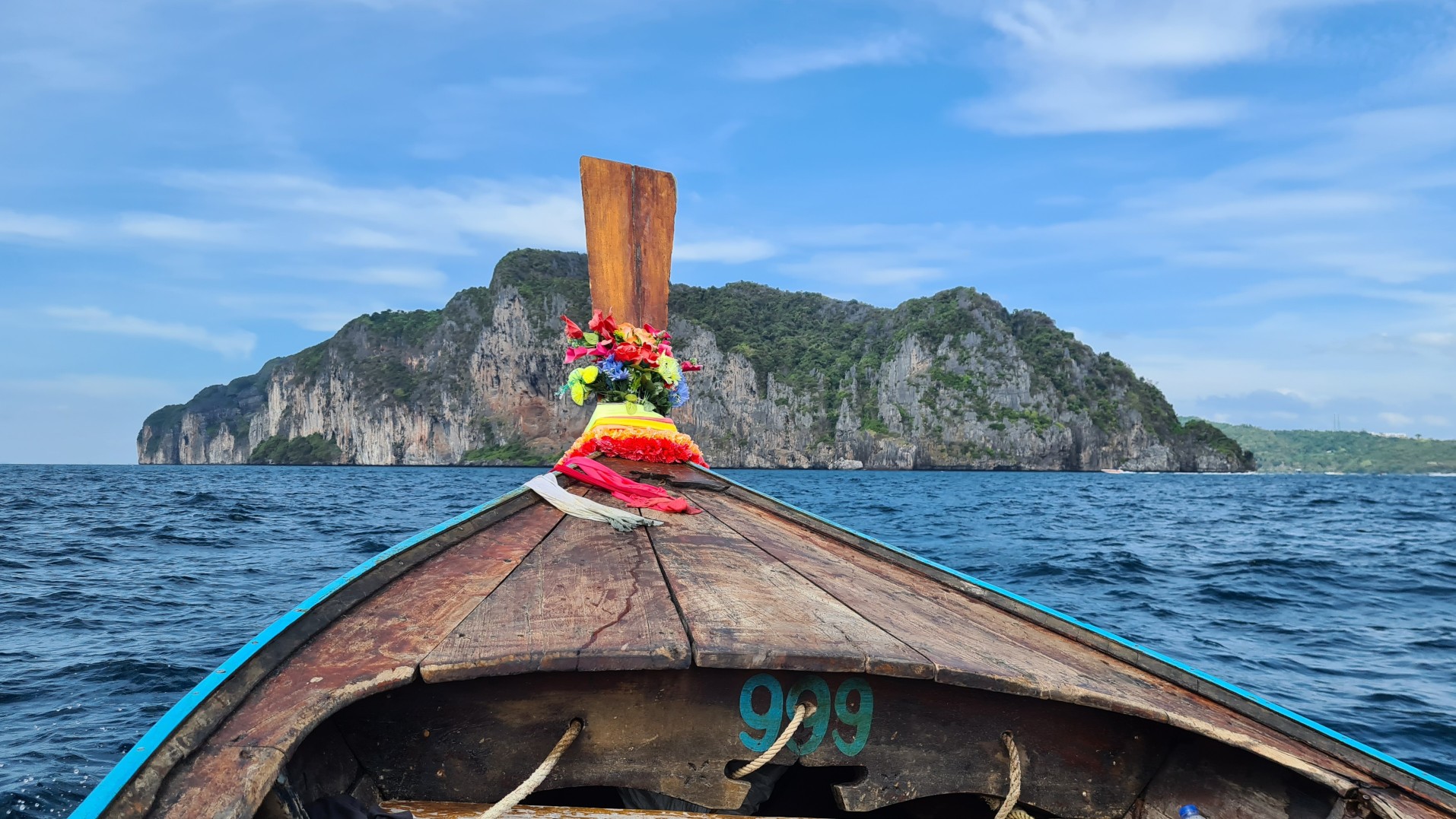 Anschließend steige ich zum Dorf hinab, schleiche mal rechts, mal links durch die verwinkelten Gassen, um mich um 8.40 Uhr bei Mac Donald einzufinden. Der von Mr. Mote angekündigte Cousin namens „S“ sammelt mich und weitere vier Passagiere ein: Ein junges Paar aus England und das andere aus dem Kosovo, alle super nett und entspannt, ganz ohne Instagram-Neurosen. Gemeinsam queren wir die Insel und besteigen unser Longtail-Boot 999 in der Loh Dalum Bay, auf dem uns „S“ von 9-15 Uhr für 2.000 Baht pro Person durch die Andamanen-See und rund um Koh Phi Phi Leh schippern wird.