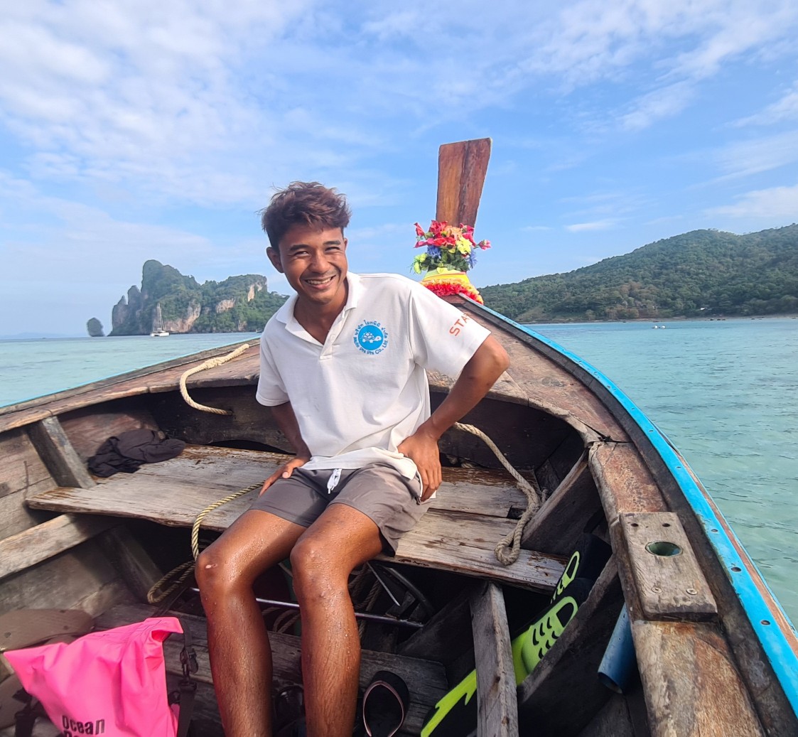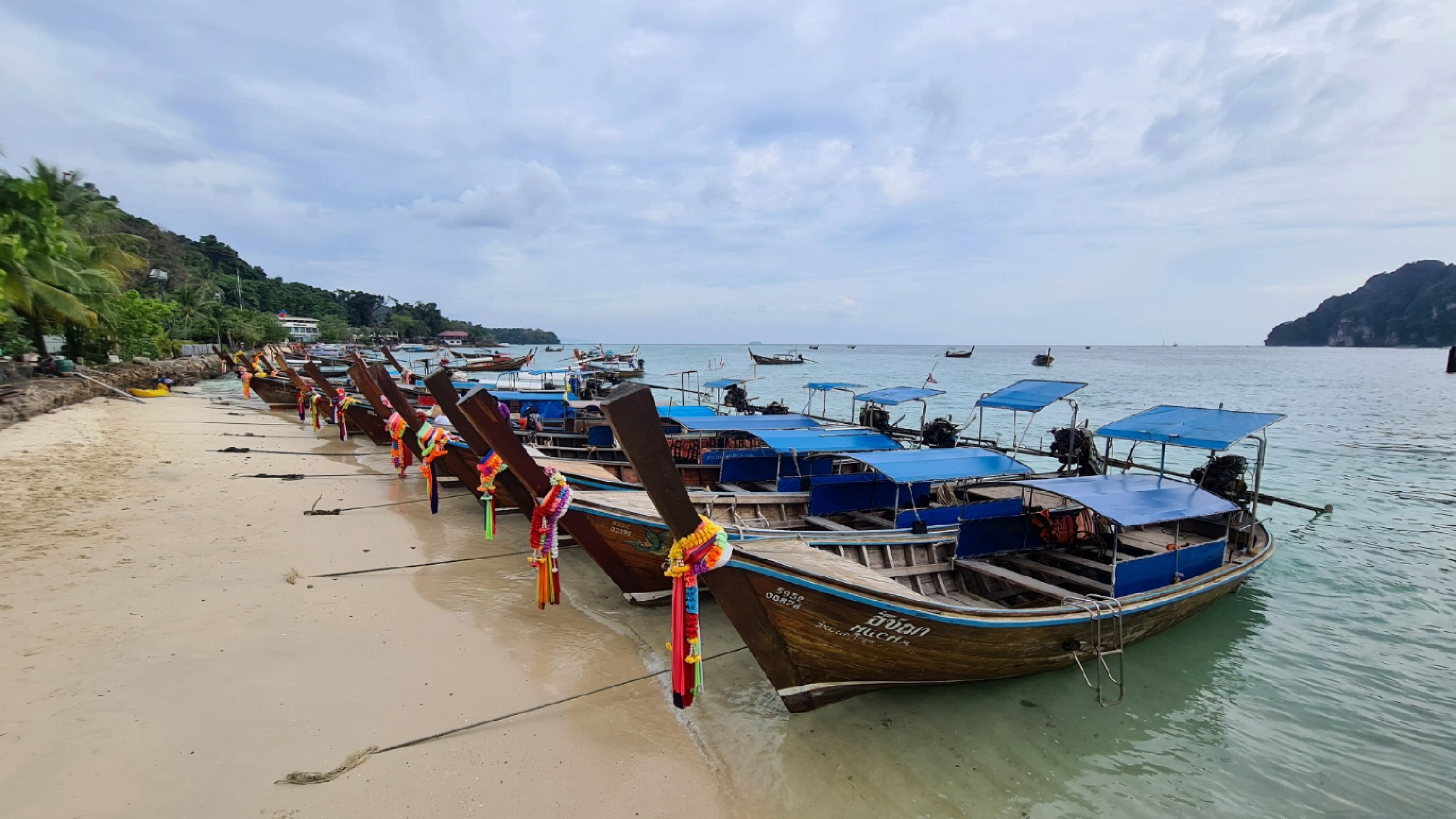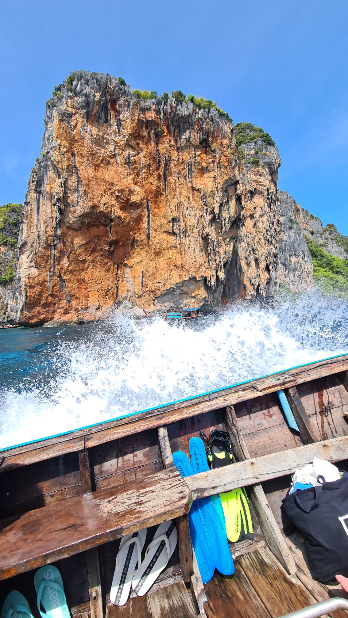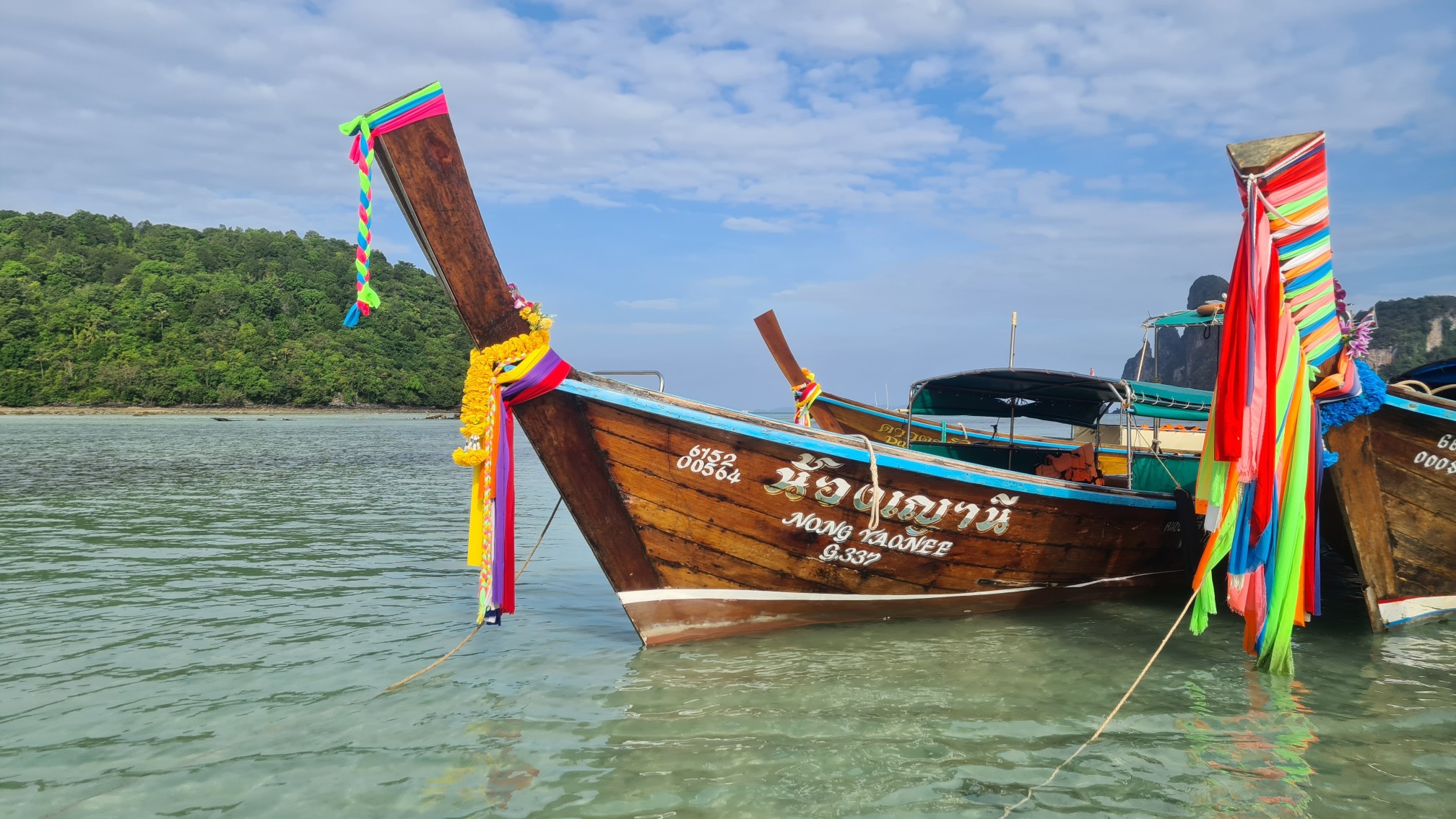 Anschließend steige ich zum Dorf hinab, schleiche mal rechts, mal links durch die verwinkelten Gassen, um mich um 8.40 Uhr bei Mac Donald einzufinden. Der von Mr. Mote angekündigte Cousin namens „S“ sammelt mich und weitere vier Passagiere ein: Ein junges Paar aus England und das andere aus dem Kosovo, alle super nett und entspannt, ganz ohne Instagram-Neurosen. Gemeinsam queren wir die Insel und besteigen unser Longtail-Boot 999 in der Loh Dalum Bay, auf dem uns „S“ von 9-15 Uhr für 2.000 Baht pro Person durch die Andamanen-See und rund um Koh Phi Phi Leh schippern wird.