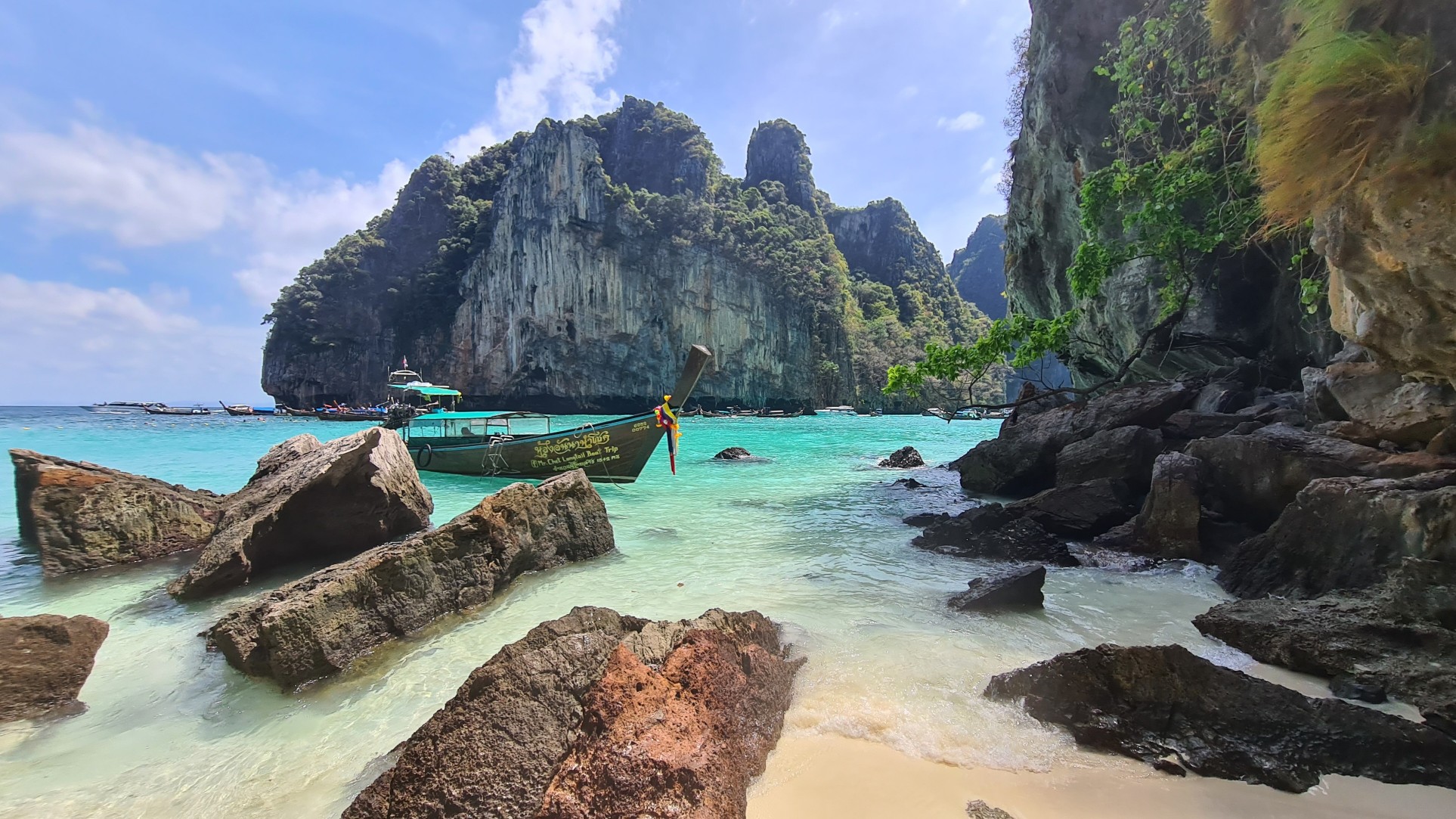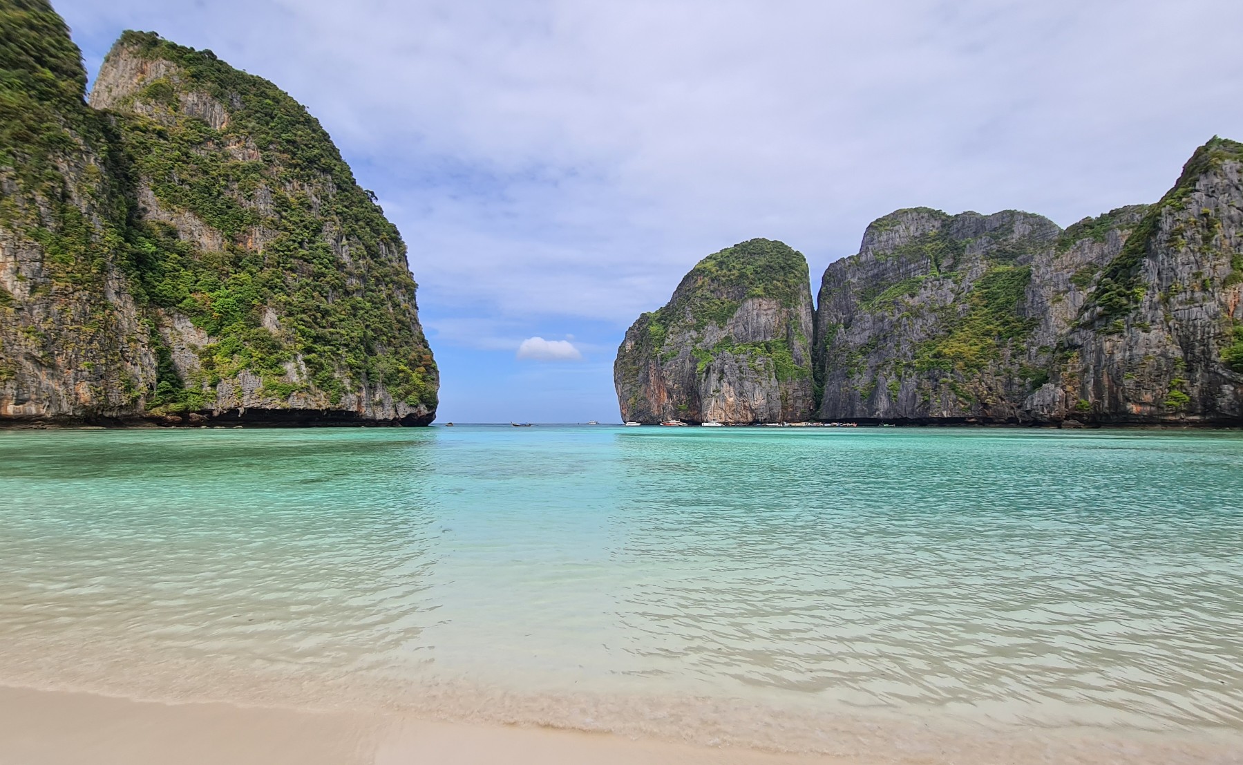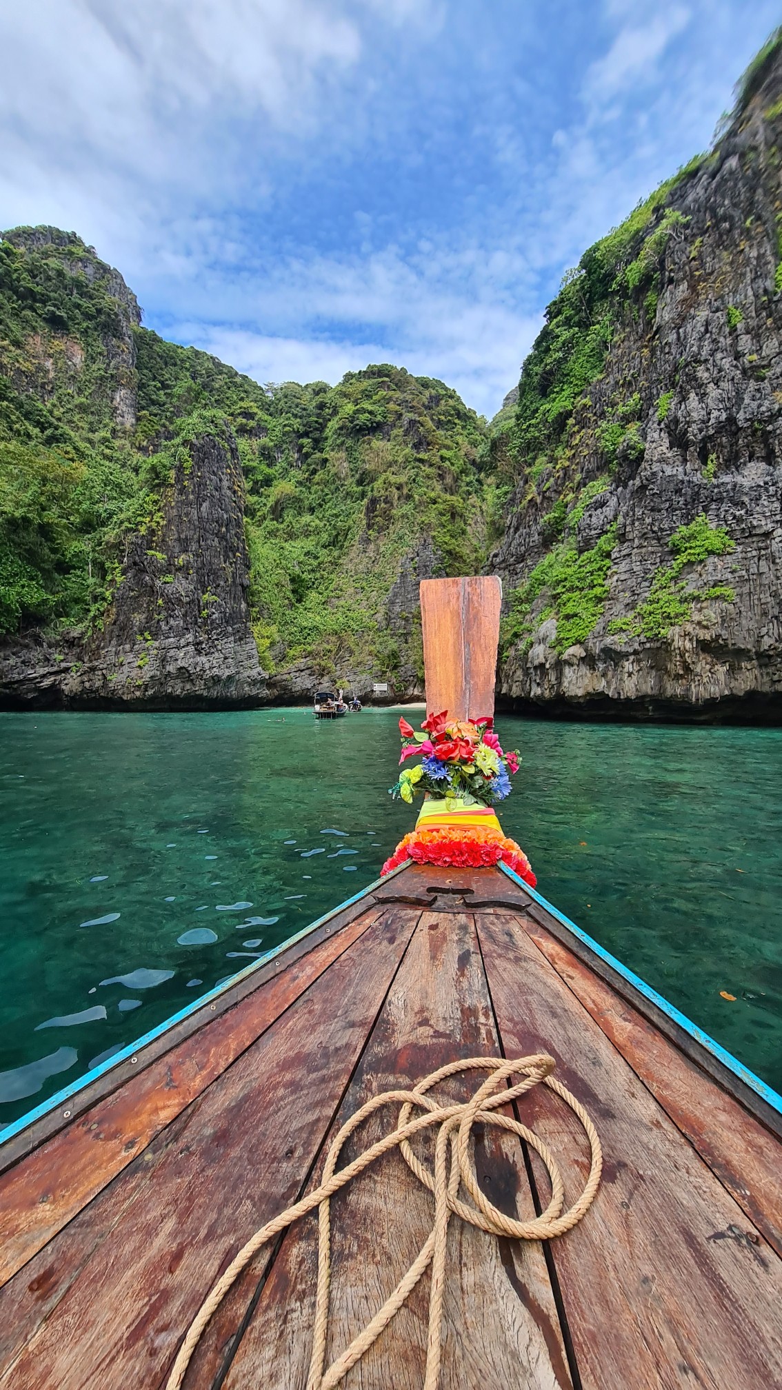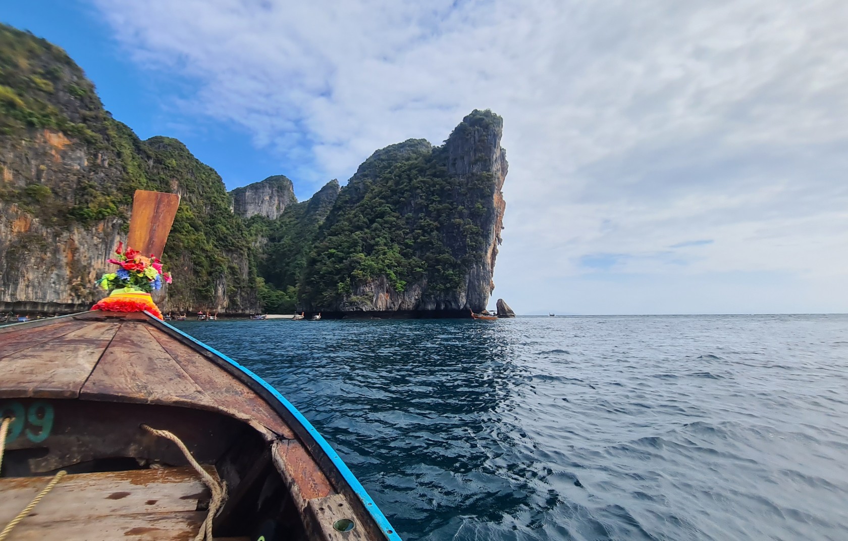 Unser nächstes Ziel ist die weltberühmte Maya Bay. Vermutlich eine von unzähligen traumhaften Buchten weltweit, aber eben ein Besuchermagnet durch den Kinofilm „The Beach“ (2000) mit Leonardo DiCaprio. Die Maya Bay hatte sehr unter dem immensen Ansturm gelitten und wurde deshalb von 2018 bis Ende 2021 für Besucher komplett geschlossen. Eine wunderbare Entscheidung! Die Natur konnte sich erholen, das Wasser ist klar, der puderfeine Sand sauber und auch die Babys der Schwarzspitzenriffhaie tummeln sich wieder im flachen Wasser der schützenden Bucht. Zusätzlich zu den regelmäßigen Ruhephasen für Kho Phi Phi Leh und die Maya Bucht wurde auch ein Befahr- und Schwimmverbot erlassen. Alle Boote müssen an der anderen Seite der Insel anlanden und es wird streng darauf geachtet, dass niemand tiefer als bis zu den Knien ins Wasser geht.