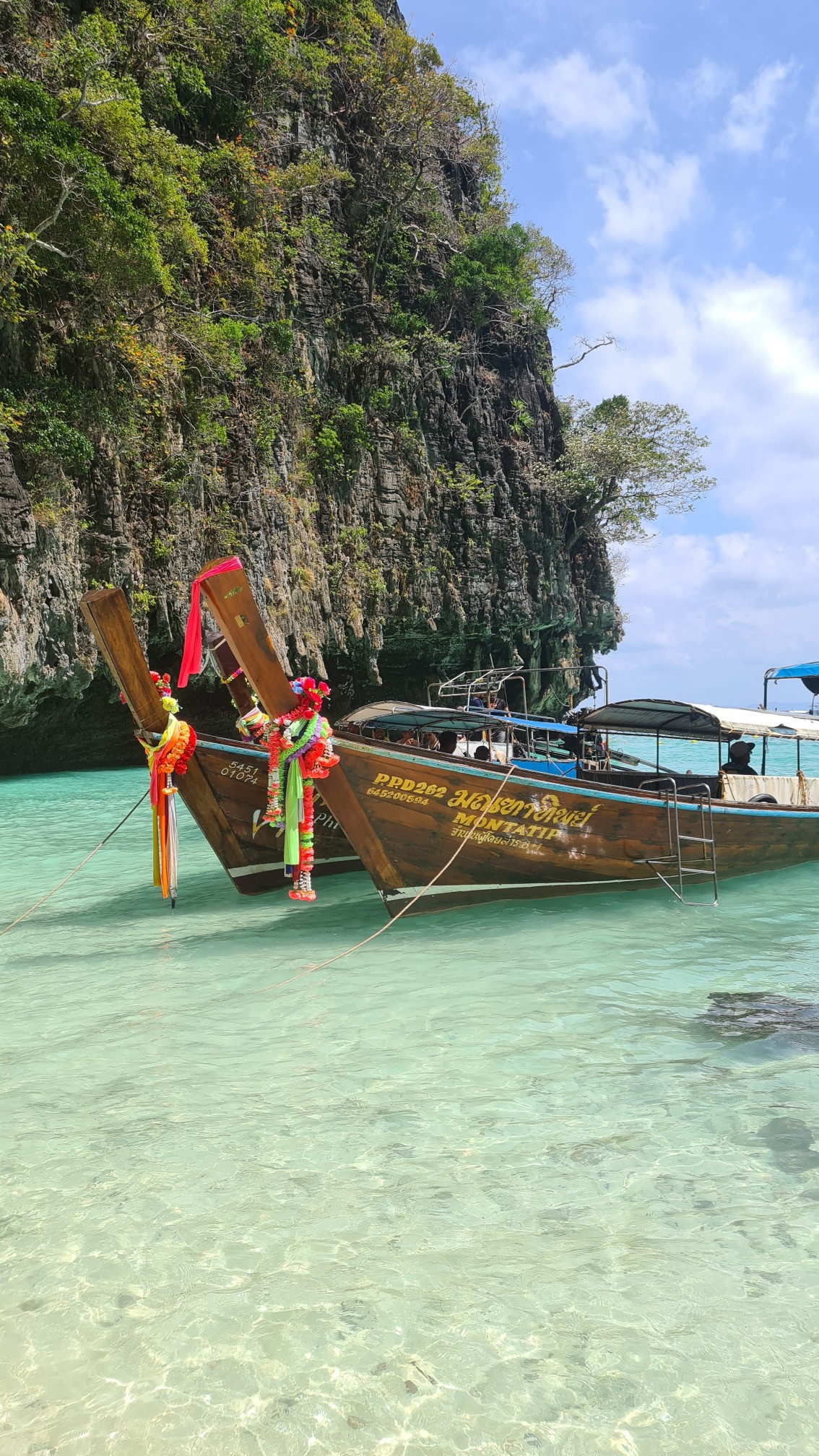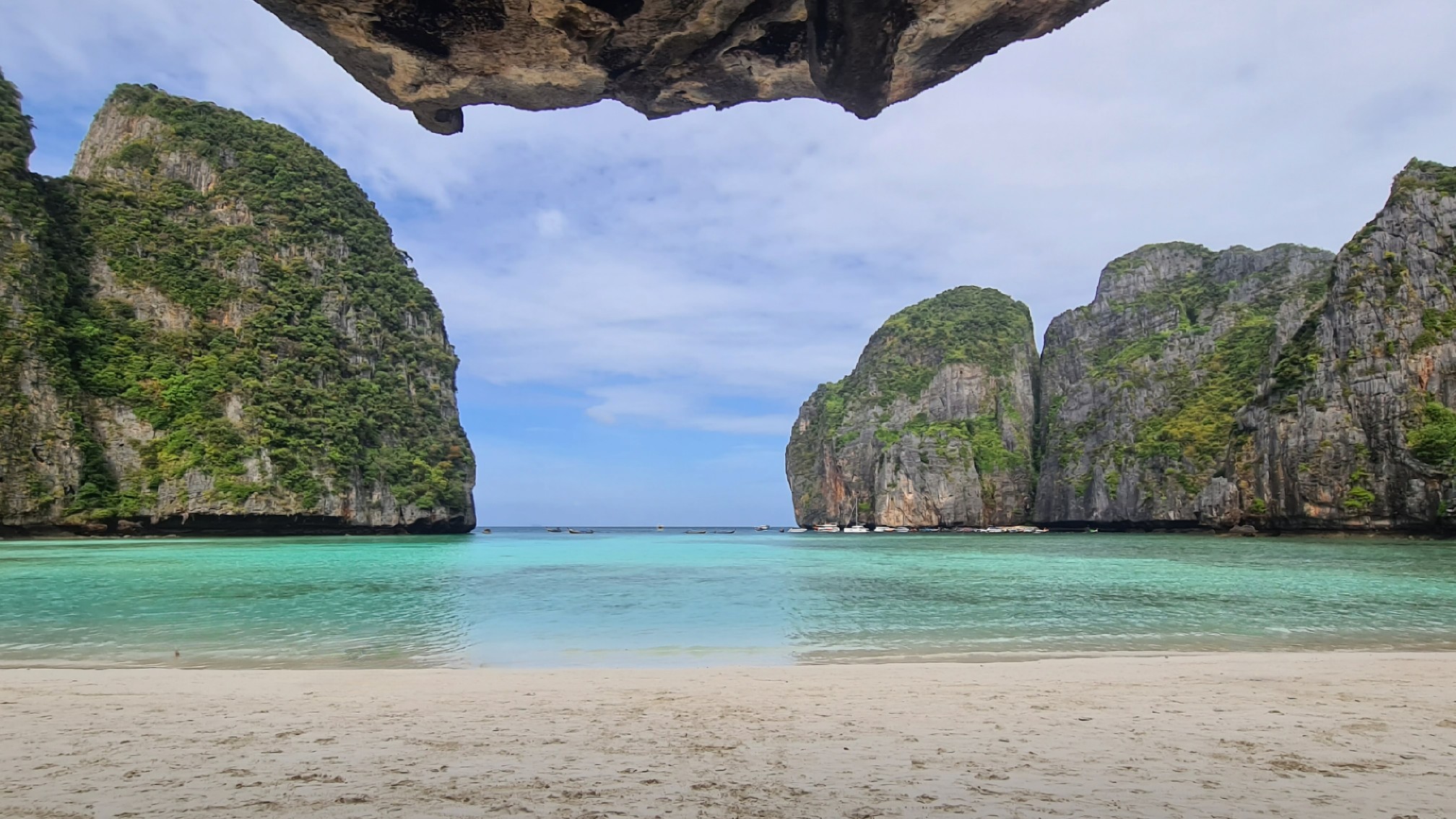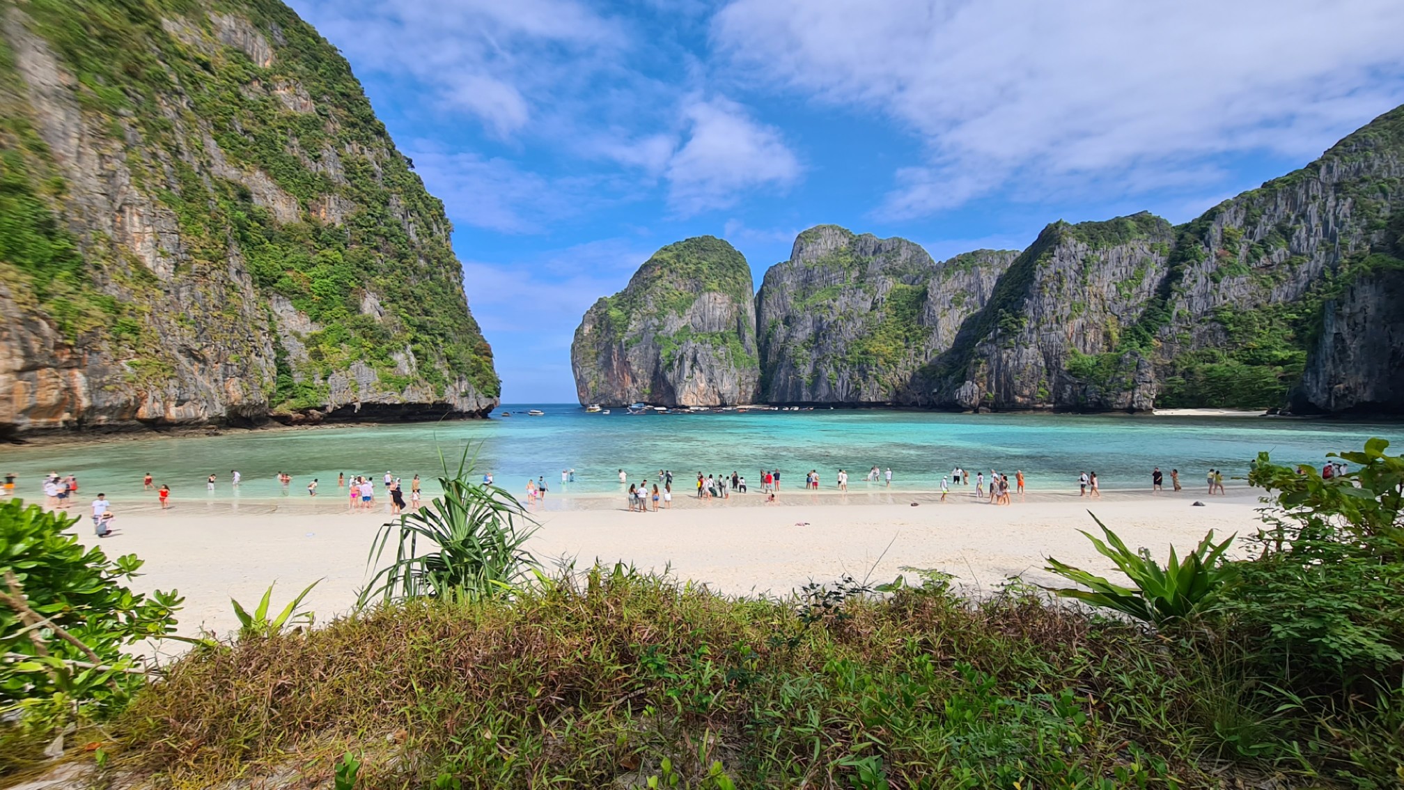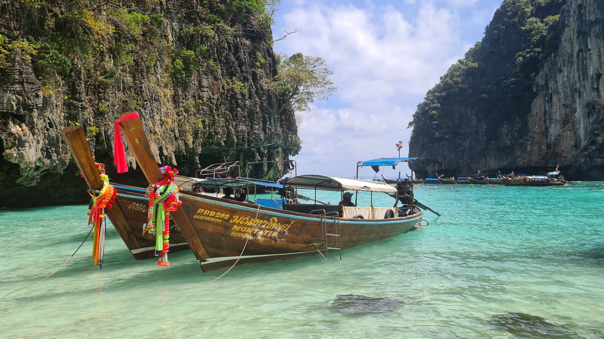 Unser nächstes Ziel ist die weltberühmte Maya Bay. Vermutlich eine von unzähligen traumhaften Buchten weltweit, aber eben ein Besuchermagnet durch den Kinofilm „The Beach“ (2000) mit Leonardo DiCaprio. Die Maya Bay hatte sehr unter dem immensen Ansturm gelitten und wurde deshalb von 2018 bis Ende 2021 für Besucher komplett geschlossen. Eine wunderbare Entscheidung! Die Natur konnte sich erholen, das Wasser ist klar, der puderfeine Sand sauber und auch die Babys der Schwarzspitzenriffhaie tummeln sich wieder im flachen Wasser der schützenden Bucht. Zusätzlich zu den regelmäßigen Ruhephasen für Kho Phi Phi Leh und die Maya Bucht wurde auch ein Befahr- und Schwimmverbot erlassen. Alle Boote müssen an der anderen Seite der Insel anlanden und es wird streng darauf geachtet, dass niemand tiefer als bis zu den Knien ins Wasser geht.