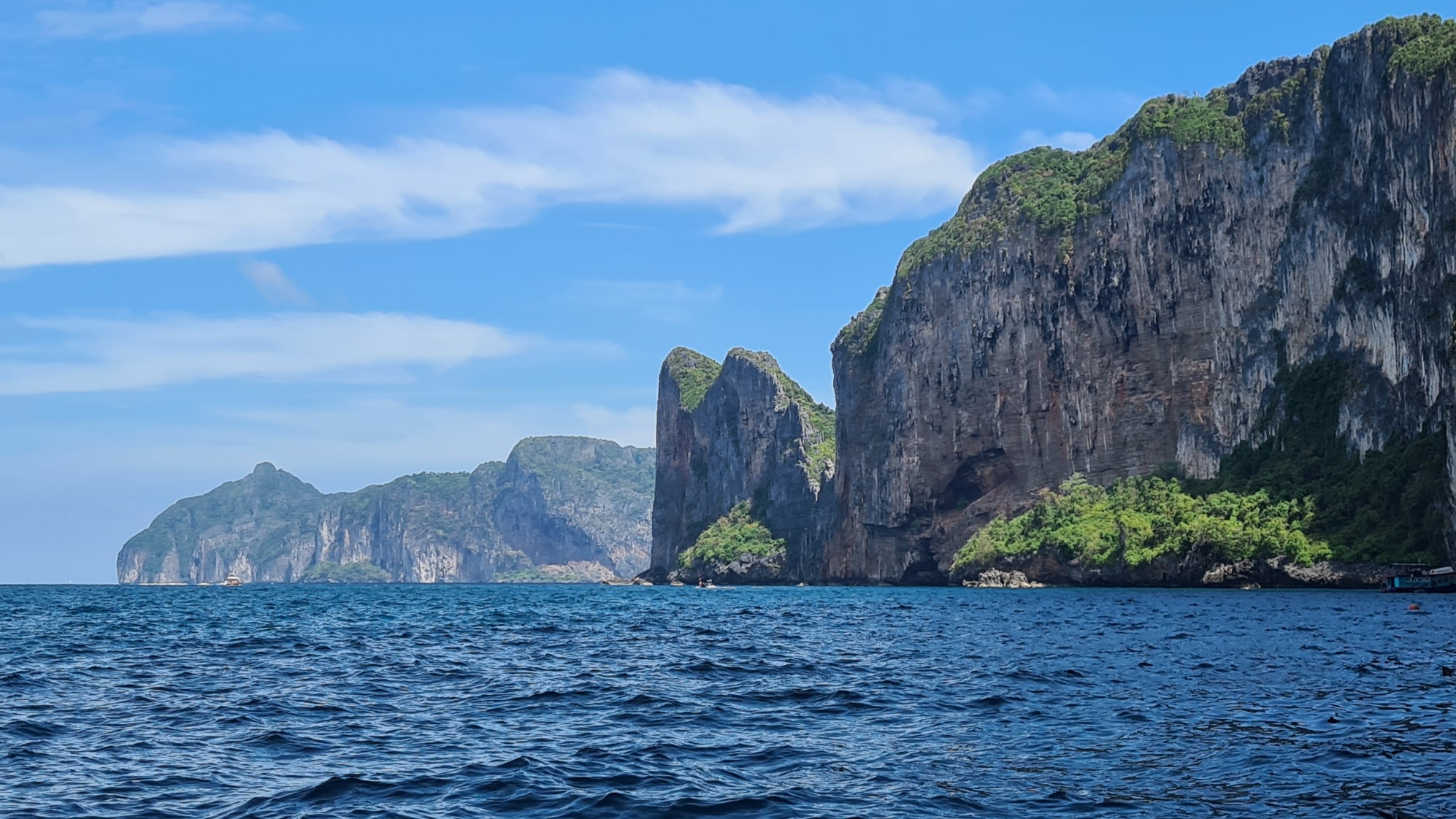 Nach der kurzen Überfahrt nach Koh Phi Phi Leh, stoppen wir an einer der Steilwände zum Schnorcheln nach Schildkröten. Bei dem Wellengang, der hier knapp vor der Felskante herrscht, bin ich froh, die angebotene Schwimmweste angezogen zu haben. Zu schnell kühlt man aus, wenn man nur auf dem Wasser dümpelt. Tief unter uns entdecken wir zwei Schildkröten beim Weiden am Meeresboden, aber bis sie zum Luftholen auftauchen, müssen wir uns ziemlich lange gedulden. Aber schließlich werden wir belohnt.