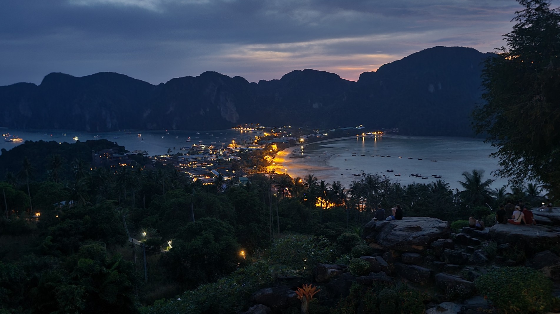 Es ist herrlich hier. Okay, es gibt immer unzählig viele Treppen und Stufen empor zu steigen. Aber die Mühe lohnt. Hier oben ist es relativ ruhig, die Aussicht ist phantastisch und meine etwa gleichaltrigen Balkon-Nachbarn, Andrea und Andi aus Oxford, überaus sympathisch. Die beiden haben „straight-away“ neun Tage auf Koh Phi Phi gebucht und auf meine Empfehlung hin, gleich bei Mr. Mote eingecheckt. Bei einem Flascherl Wein genieße ich den ersten Abend auf Koh Phi Phi Don. Die Discoklänge vom Ton Sai Bay dringen nur ganz schwach zu mir empor und von der anderen Seite ruft lautsprecherverstärkt der Muezzin.