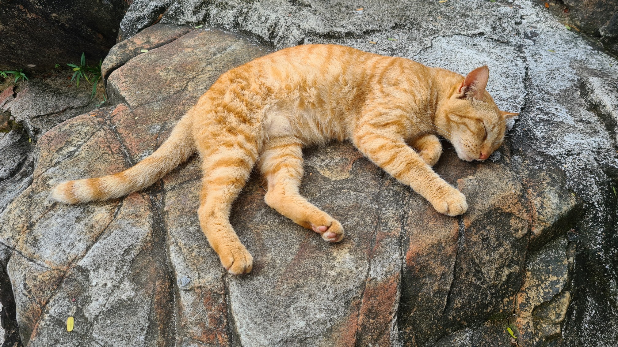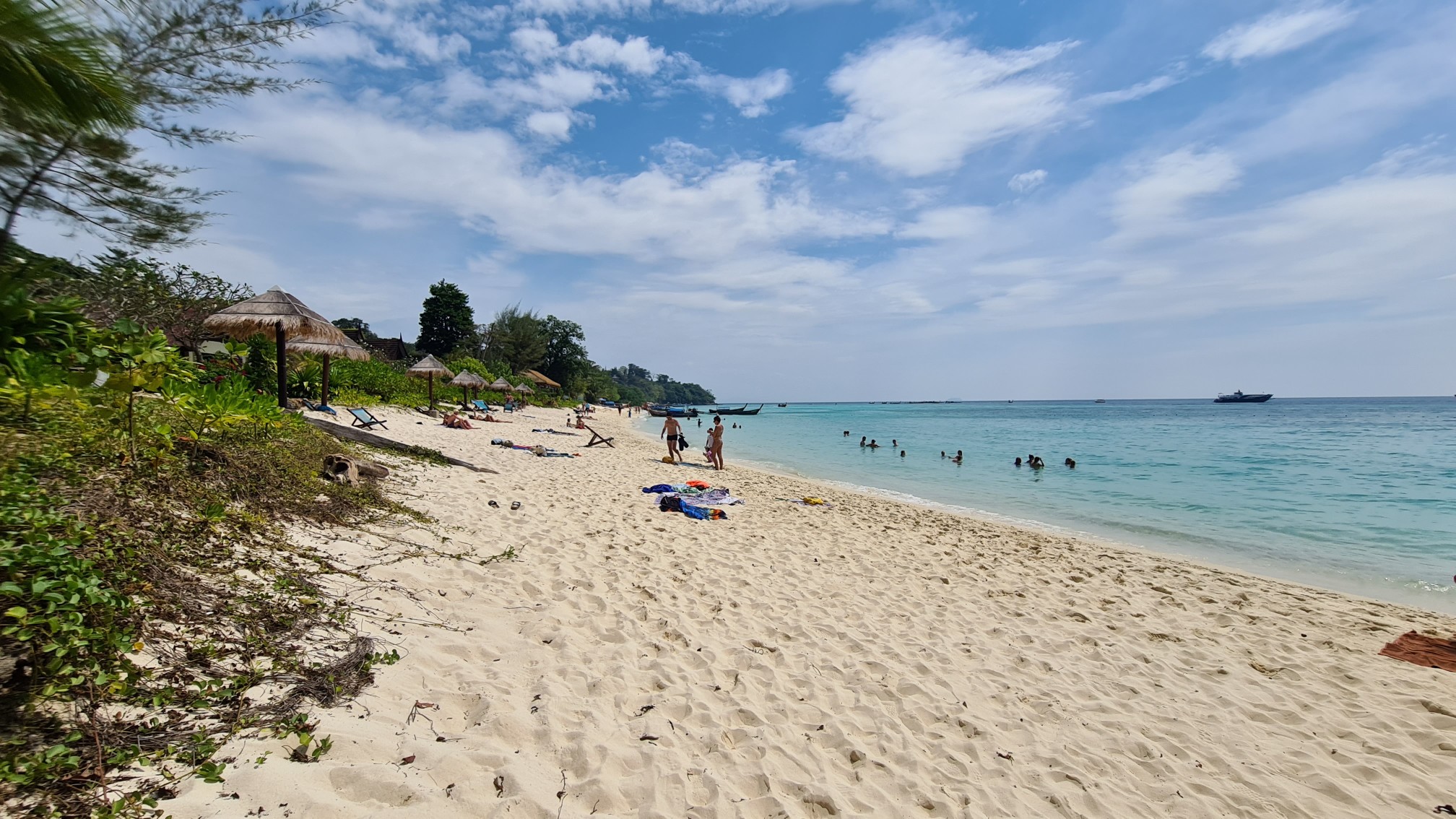 Die Long Beach selbst ist dann wieder nicht so mein Ding: ewig lang, die Bungalow-Anlagen liegen direkt hinter den Strandpalmen und der Lärm der vorbeibrausenden oder an-/abfahrenden Longtail-Boote ist schon nervig. Ich suche mir einen der sehr spärlichen Schatten und tauche zweimal ins erfrischende und hier wirklich schwimmtiefe Wasser. Am südlichen Ende der Long Beach könnte man zum Shark Point schnorcheln oder tauchen, mit ziemlich großer Wahrscheinlichkeit, dort die namensgebende Tiergattung zu sichten. Ich drehe aber ab und gehe, nachdem mir die kleinen Pfade auf maps.me nicht wirklich vertrauenserweckend ausschauen, doch lieber auf dem geteerten Hauptweg wieder Richtung Norden. Es ist brütend heiß, geht bergauf und irgendwann bemerke ich, dass ich seit dem Frühstück fast nichts mehr getrunken habe.