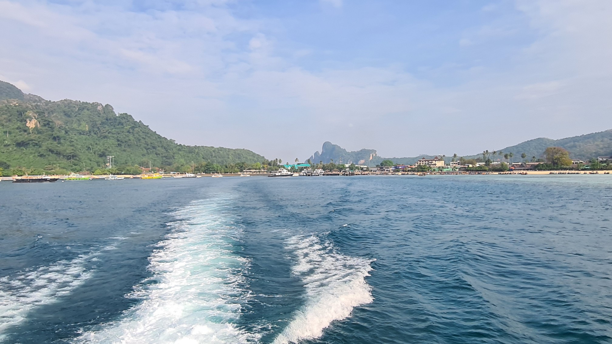 Jetzt aber zurück zum Pier, wo ich mein Backpack nur an einem der offenen Schalter abstellen konnte. Zusammen mit dem in die Jahre gekommenen Holzkahn, der meine Fähre ist, landen auch dunkle Wolken am Pier an. Vorsichtshalber wähle ich einen Fensterplatz im muffigen Innenraum der Barkasse, eine Entscheidung, die sich alsbald als „gut getroffen“ herausstellt. Kaum schippern wir aus den ruhigen Gewässern der Hafenzufahrt hinaus, nimmt die Windstärke gewaltig zu und dann setzt der Regen ein. Wie aus dem Hochdruckreiniger trommelt das Nass von oben und von der Seite drücken Wind und Wellen das Wasser an die maroden Fenster. Ganz trocken bleibe ich auch im Schiffsbauch nicht, aber da draußen schaut es noch viel garstiger aus. Besonders wohl ist mir auf dieser Nussschale nicht und die zwei Stunden Überfahrt durchs graue Nichts, ziehen sich. Ganz abgesehen davon, hatte ich mir natürlich zu meinem 60. Geburtstag auf Koh Phi Phi Sonnenschein und blauen Himmel erhofft.