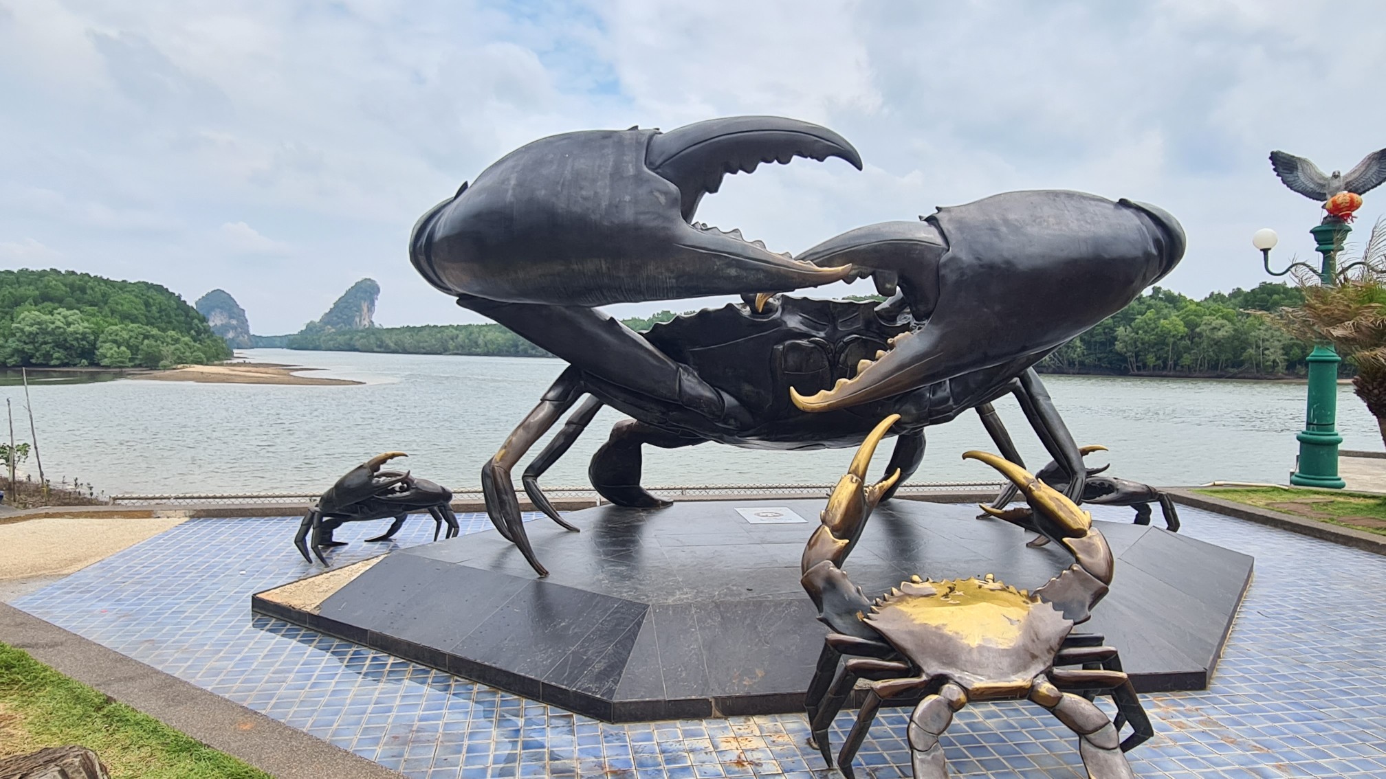 Tja, wo soll ich oder will ich hin? Eine gute Frage der geschäftstüchtigen Taxidriver am Pier in Krabi. Bei schönem Wetter hätte ich einen Bootsausflug nach Rai Leh oder zu den Mangroven gemacht, so lasse ich mich beim Wahrzeichen „The Crab“ absetzen – in der Hoffnung, dass das einigermaßen zentral liegt und belebt ist. Doch um diese Zeit ist hier buchstäblich die Krabbe begraben.