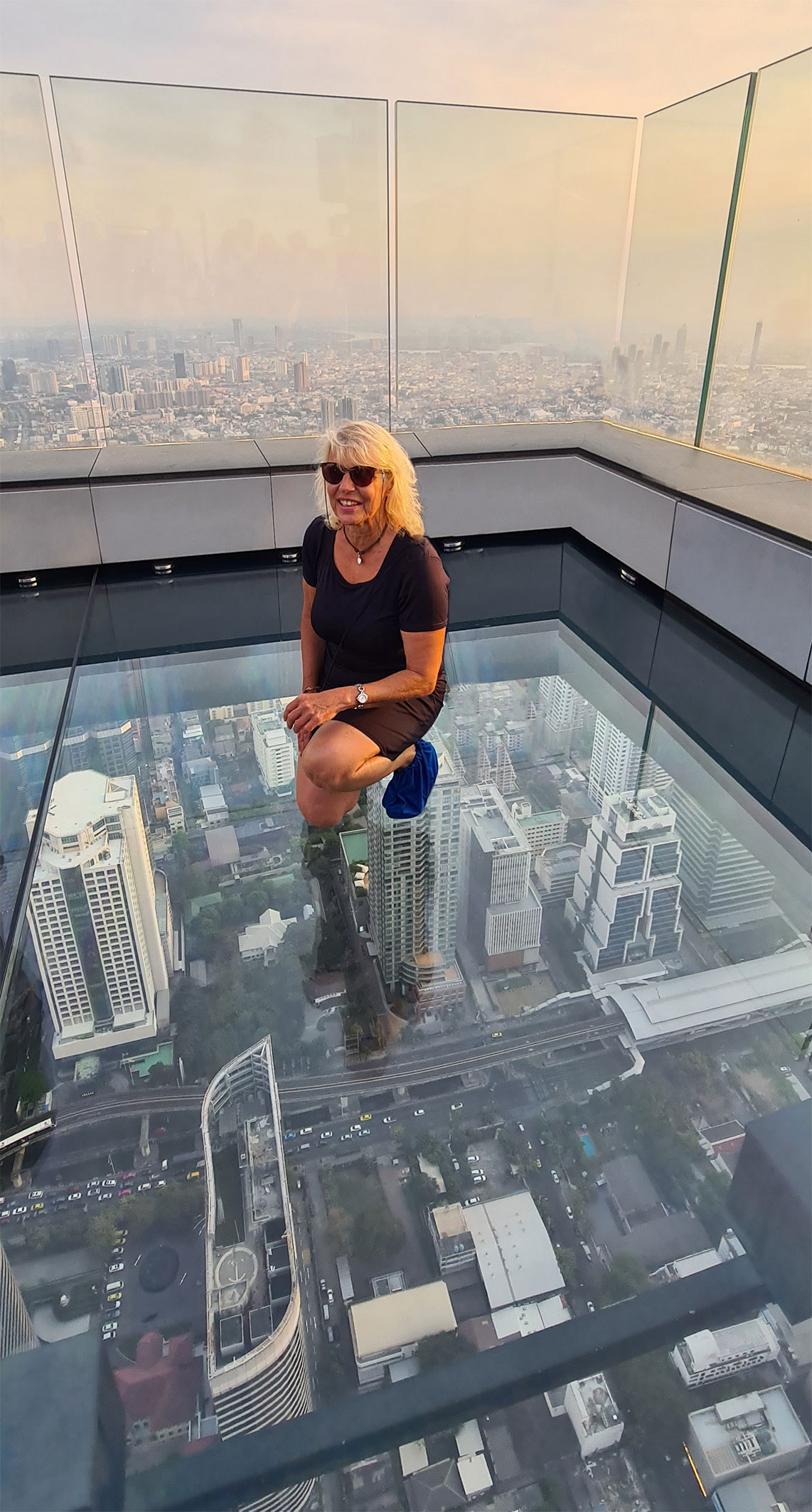 Mit dem Hochgeschwindigkeitsaufzug – mit Rundum-Video-Wänden – geht es nahezu lautlos hinauf in den 74. Stock und mit einem Glasaufzug die letzten vier Stockwerke zur spektakulären Aussichtsplattform mit Rooftop-Bar. Da ist sie also nun, die Glasterrasse mit Tiefblick! Der Andrang ist groß, Taschen, Handys und Selfies sind auf dem Glasboden nicht erlaubt. Da bleibt nicht viel Zeit zum Zaudern und Fürchten. Kurzerhand spreche ich zwei deutsche Traveller an und frage, ob wir gegeneinander Fotos machen könnten. Und schon stehe ich auf dem Glas – um ehrlich zu sein, ohne Runtergucken. Aber erstaunlicherweise empfinde ich hier auf dem Tower weit weniger Höhenangst als in vielen anderen Situationen.