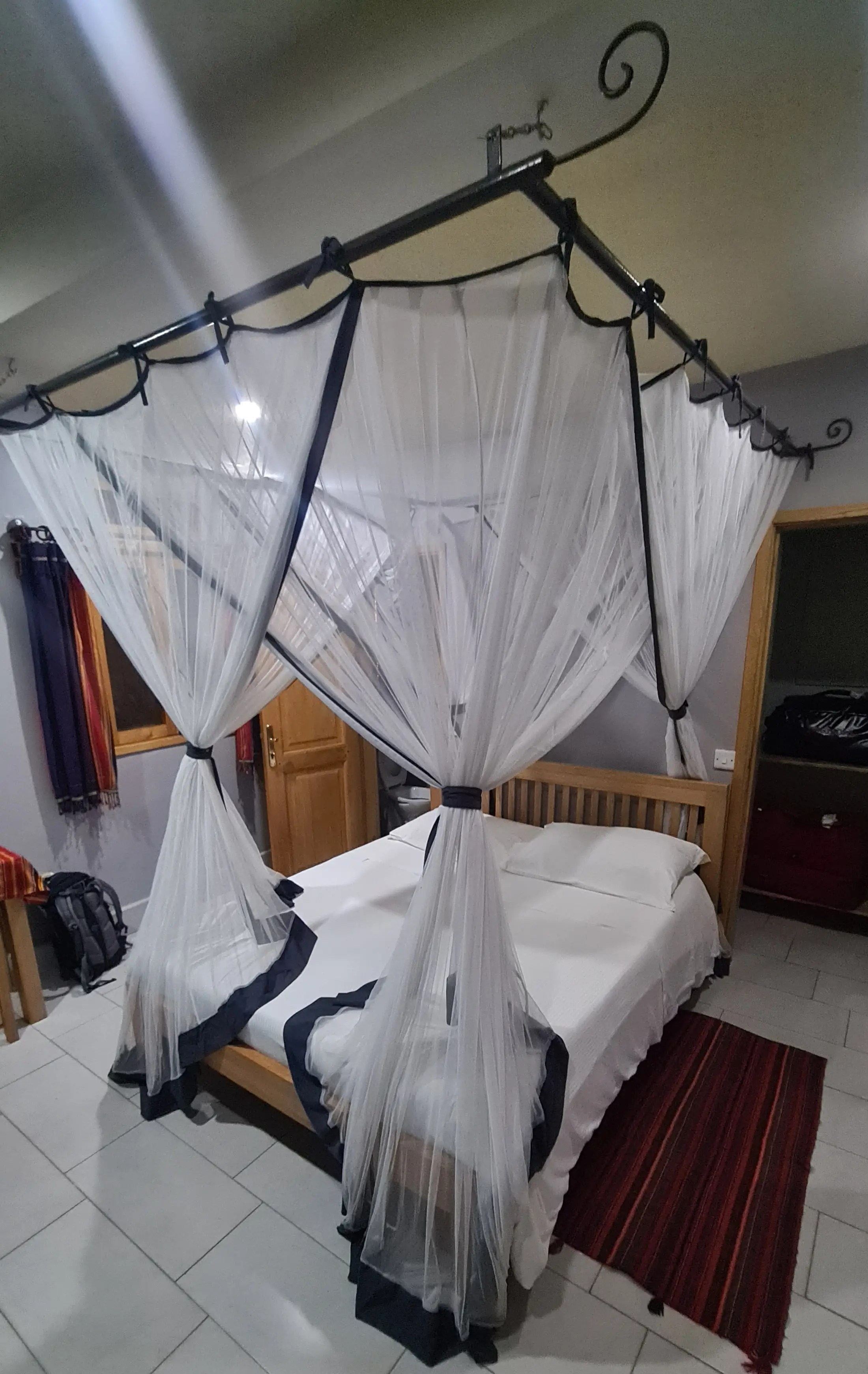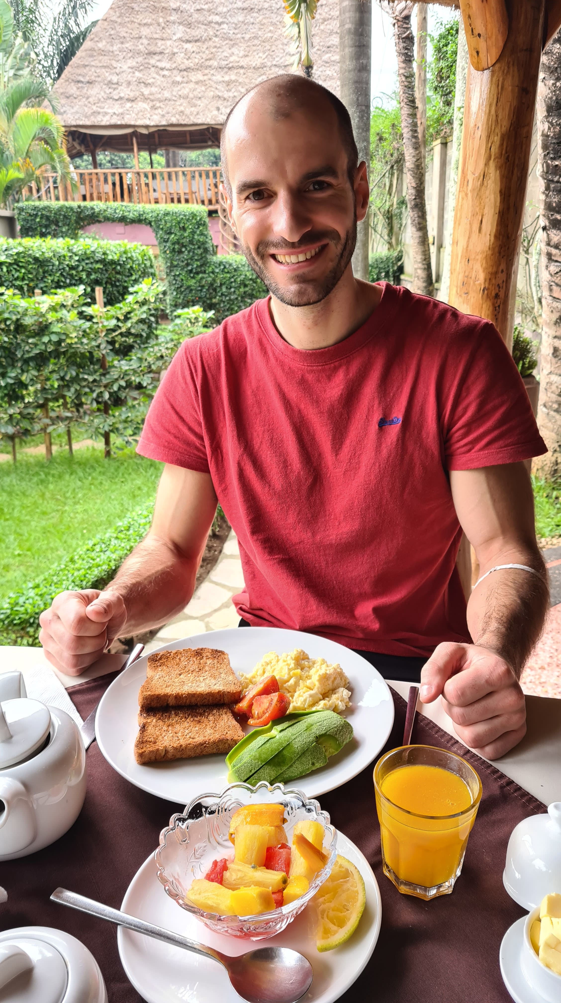 Und dann geht es auch schon mit Vollkorn-Früchte-Müsli und Reisetaschen zum Ausgang, wo uns trotz der unverschämt frühen Ankunftszeit schon ein geduldiger Fahrer erwartet. Unsere erste Nacht im Precious Guesthouse in Entebbe ist eigentlich schon fast vorbei, als dieser uns um 5 Uhr dort an das Hotel-Empfangskomitee übergibt. Dezent und fürsorglich werden wir mitsamt Gepäck in unser kleines Appartement geführt, kurz eingeführt in Schlösser und Schalter, das W-LAN-Passwort übergeben und uns freundlichst die Option eröffnet, auch nach 10 Uhr noch zum Frühstück kommen zu können. Wir fühlen wir uns rundum sehr herzlich willkommen in dieser kleinen, ruhigen Oase nahe des Botanischen Gartens von Entebbe.