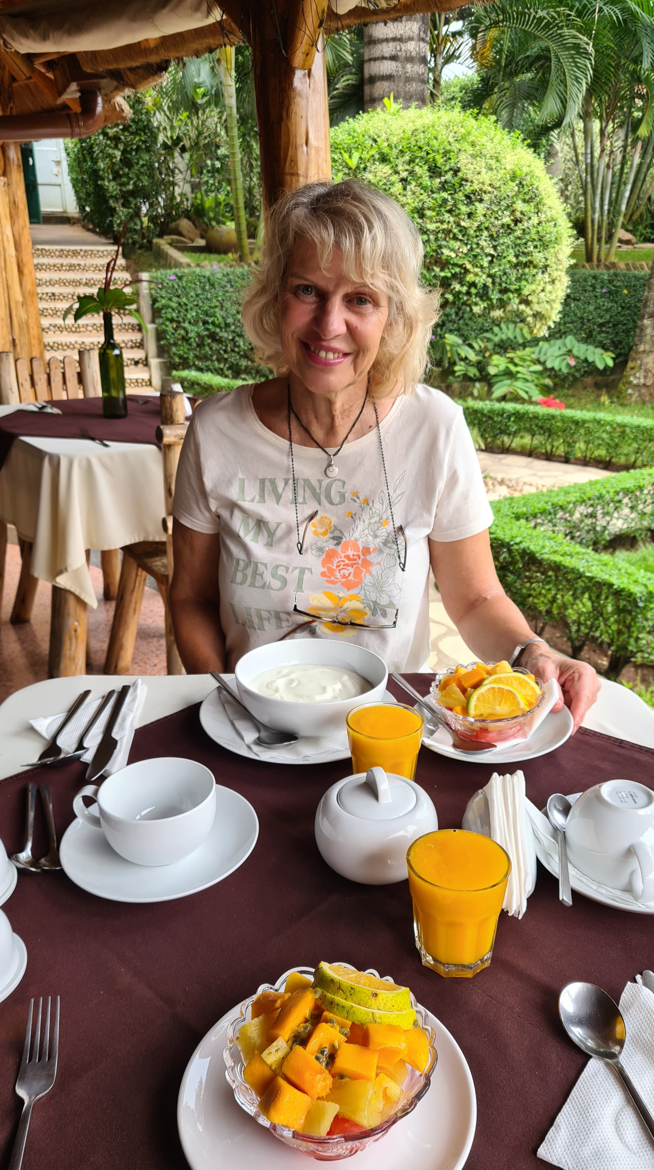 So, nun aber ab zum Frühstück. Die kleine Anlage des Precious Guesthouses ist super süß und wir genießen in einem Garten-Pavillon ein wunderbares erstes Frühstück mit allem, was wir von Herzen mögen. Das Obst und der Mango-Saft schmecken köstlich intensiv, es gibt nach Wahl Eierspeisen, Pancakes oder French Toast und dazu richtig guten Tee mit Ingwer-Wasser und Kaffee.
