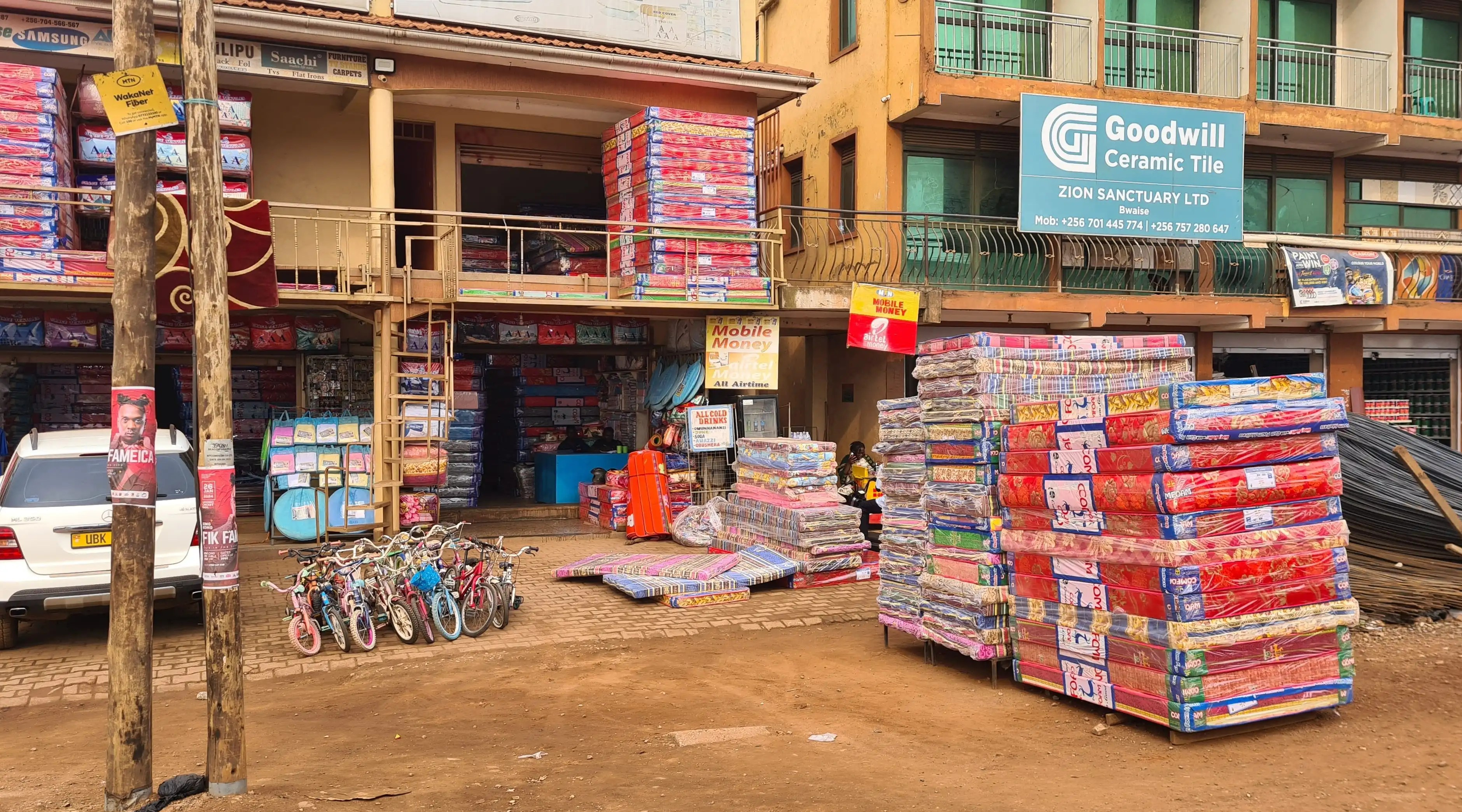 Doch zum Glück entscheiden wir uns für die dicken Matten. Zum einen passen sie wunderbar in das vorhandene 3-Mannszelt und wir haben dazwischen noch Platz für Klamotten, Handy, Taschenlampe. Zum anderen schlafen wir darauf wie im 5-Sterne-Luxus-Bett, kaum ein Gefühl von Campen und Schlafen am Boden. Schon nach der ersten Nacht sind wir überglücklich und würden sie nie mehr eintauschen. Gegen was auch?! Thermomatten scheint es in Uganda nicht zu geben, aber diese Schaumstoff-Matratzen gehören wohl zur Standard-Ausstattung jedes Hausstandes. Quer durchs Land liegen sie in Stapeln vor den Geschäften und werden von Händlern oder auf dem eigenen Motorrad bis in die entlegensten Dörfer angeliefert.