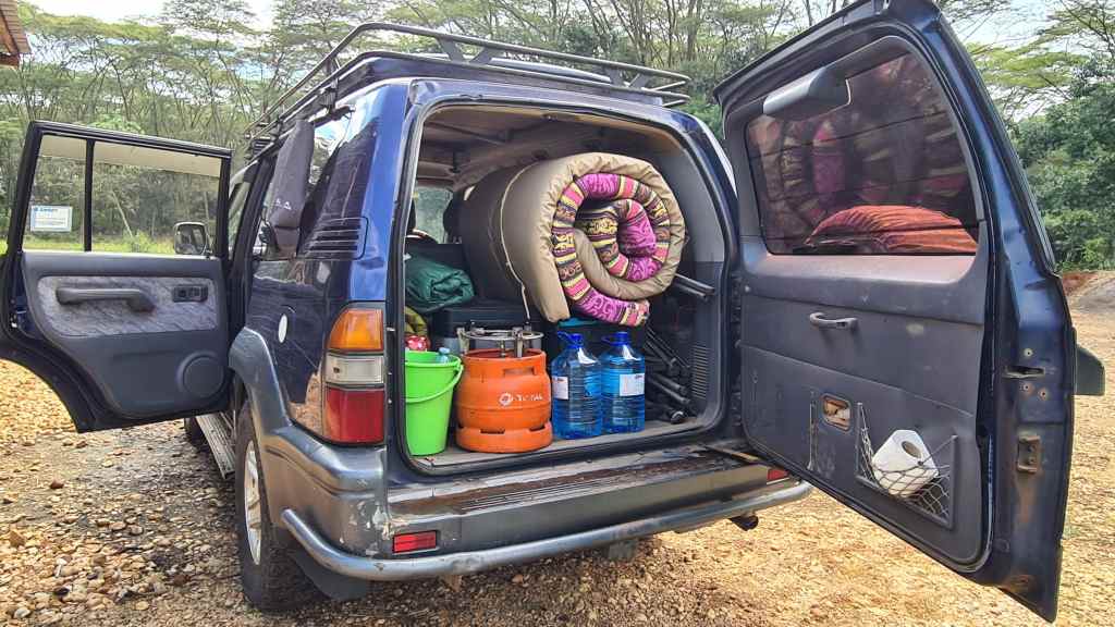 Nach drei Stunden im Park machen wir uns auf den Rückweg zum Guesthouse, denn um 18 Uhr kommt Henry mit Zelten, Permits, Router – und zwei fetten Schaumstoff-Matratzen. Die Zelte selbst haben ein mickrig kleines Packmaß, dafür sind die Matratzen umso monströser und nehmen ein Viertel des Kofferraums ein. Wir überlegen ernsthaft, ob wir sie überhaupt mitnehmen sollen.