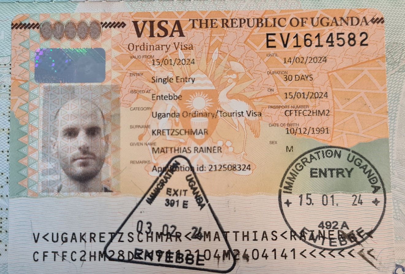 Der karge Service der Egypt Air setzt sich auch in den alten Boeing 737-800-Maschinen fort, dafür ist das Essen an Bord aber gar nicht so schlecht. Wir können auf dem Anschlussflug von Kairo nach Entebbe sogar noch Plätze tauschen und nebeneinander eine Mütze Schlaf nehmen, bevor wir um 4:10 Uhr Ortszeit in Entebbe landen. Bei der Immigration bekommen wir unser vorab schon online beantragtes und bezahltes Visum in den Reisepass. Das macht ja mal richtig was her!