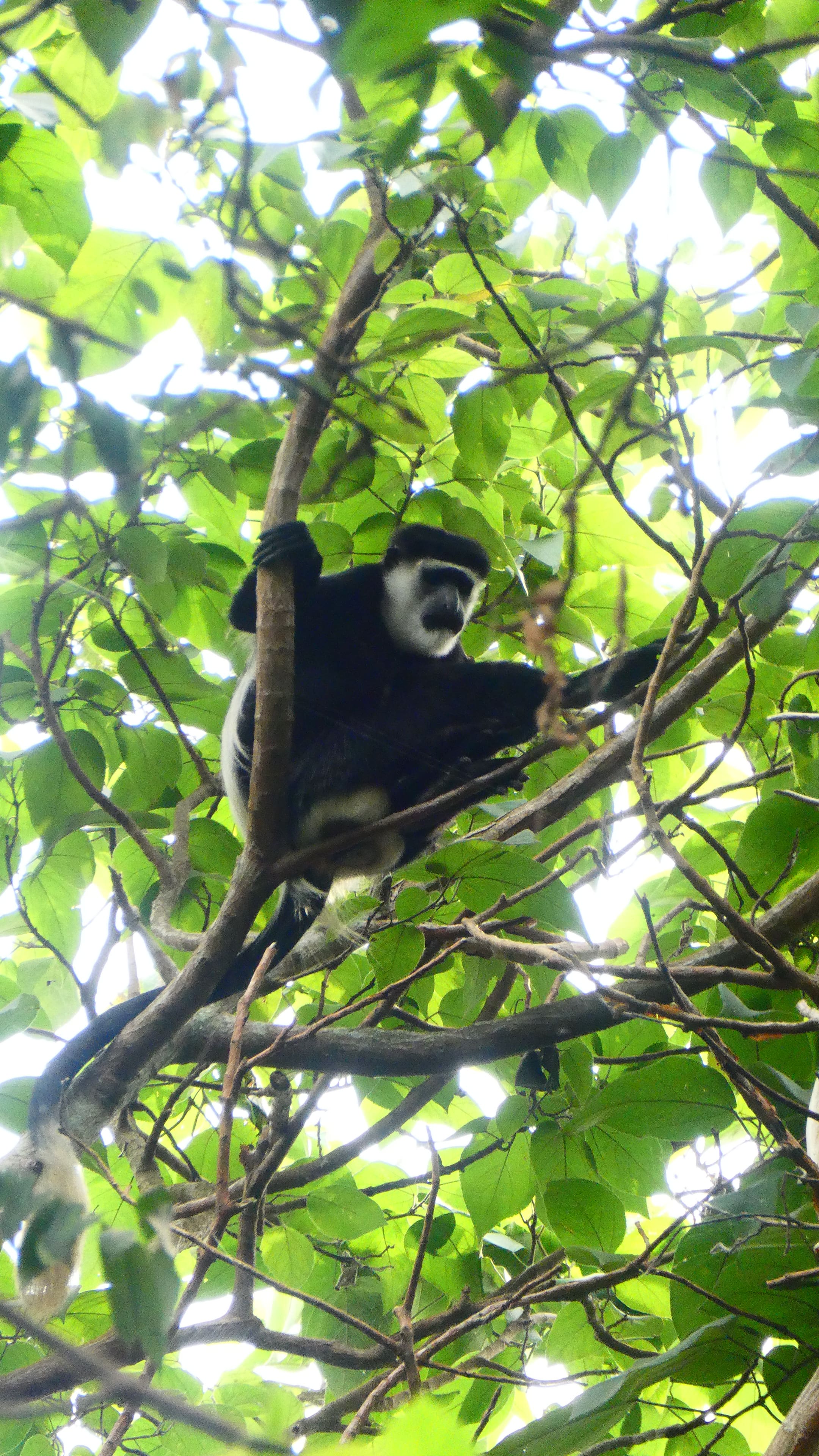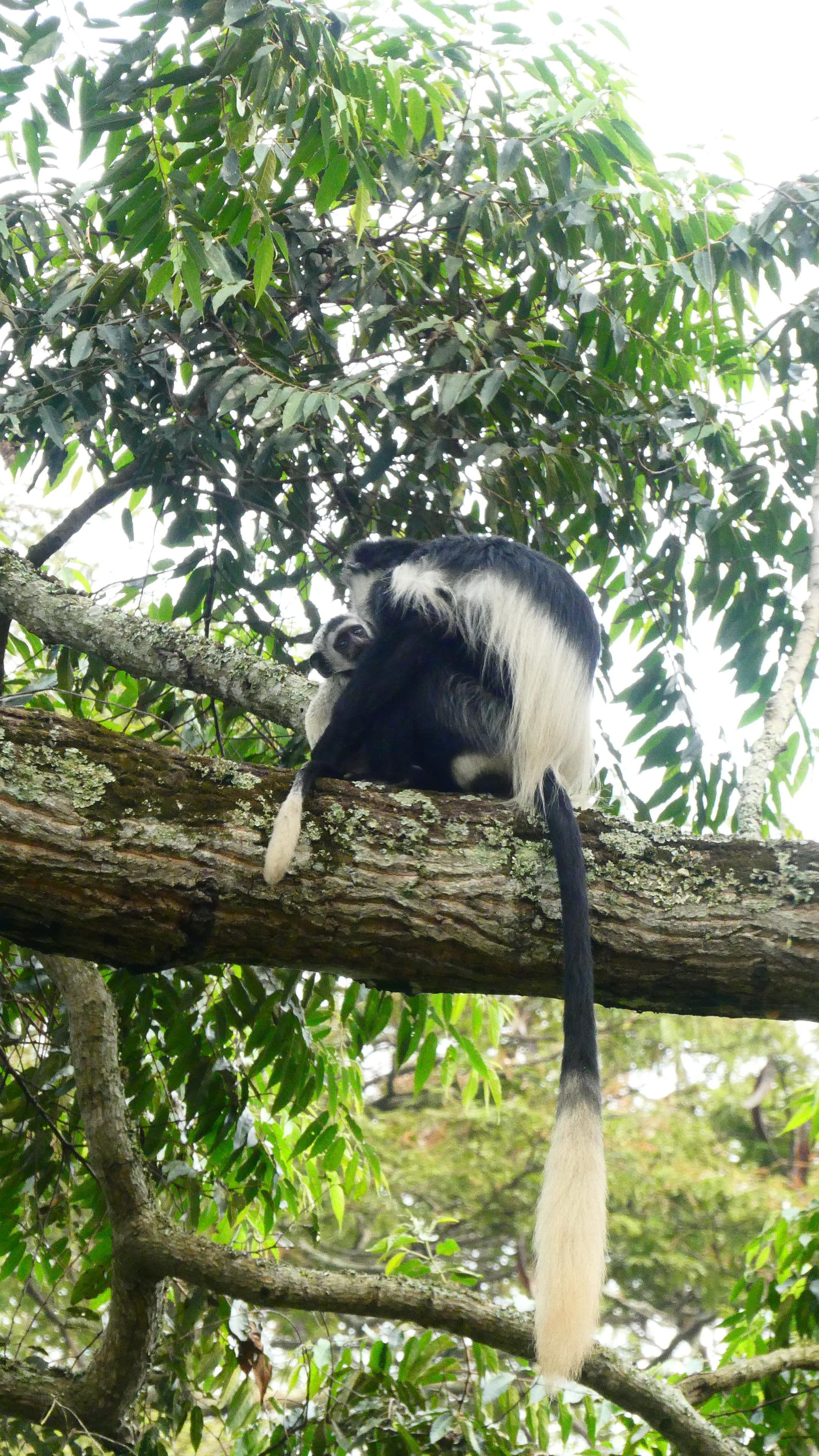 Neben vielen Vögeln wie den lustigen Hornbills und den Marabus sehen wir auch die ersten Colobus-Affen. Die Marabus scheinen hier, wie bei uns die Krähen, eher eine Allesfresser-Plage zu sein. Sie tauchen in Scharen überall auf, wo Menschen und Müll zuhause sind, und nisten zuhauf hoch oben in den Bäumen.
