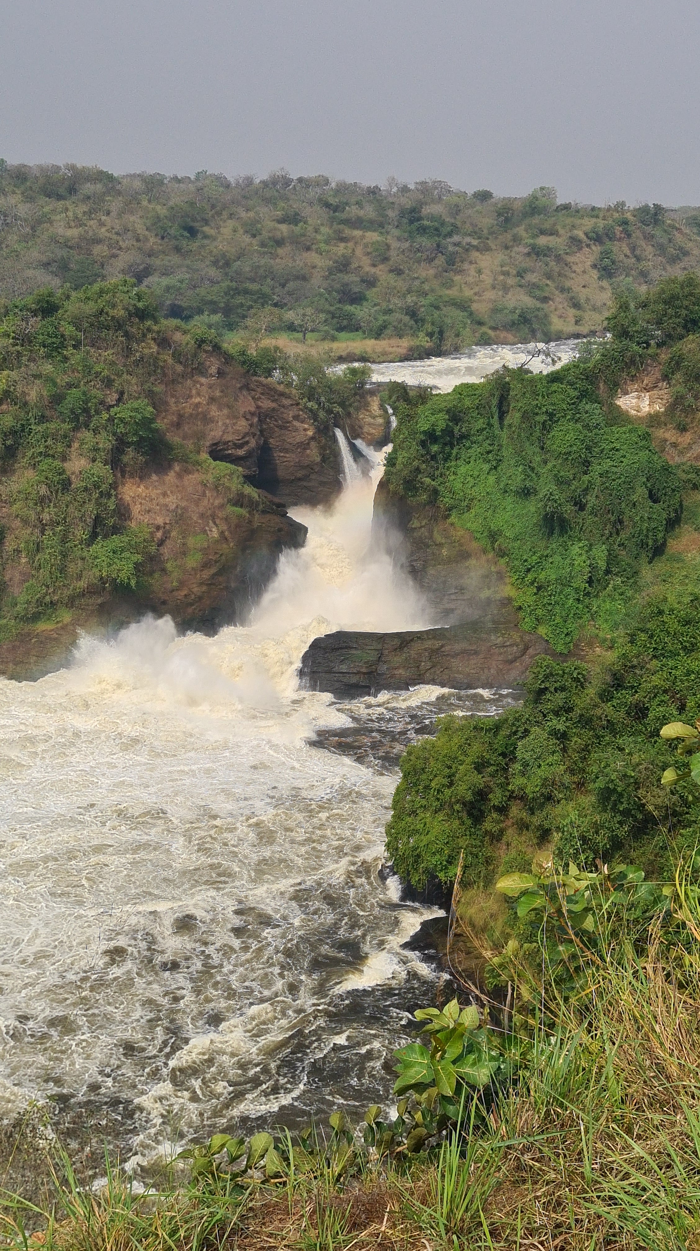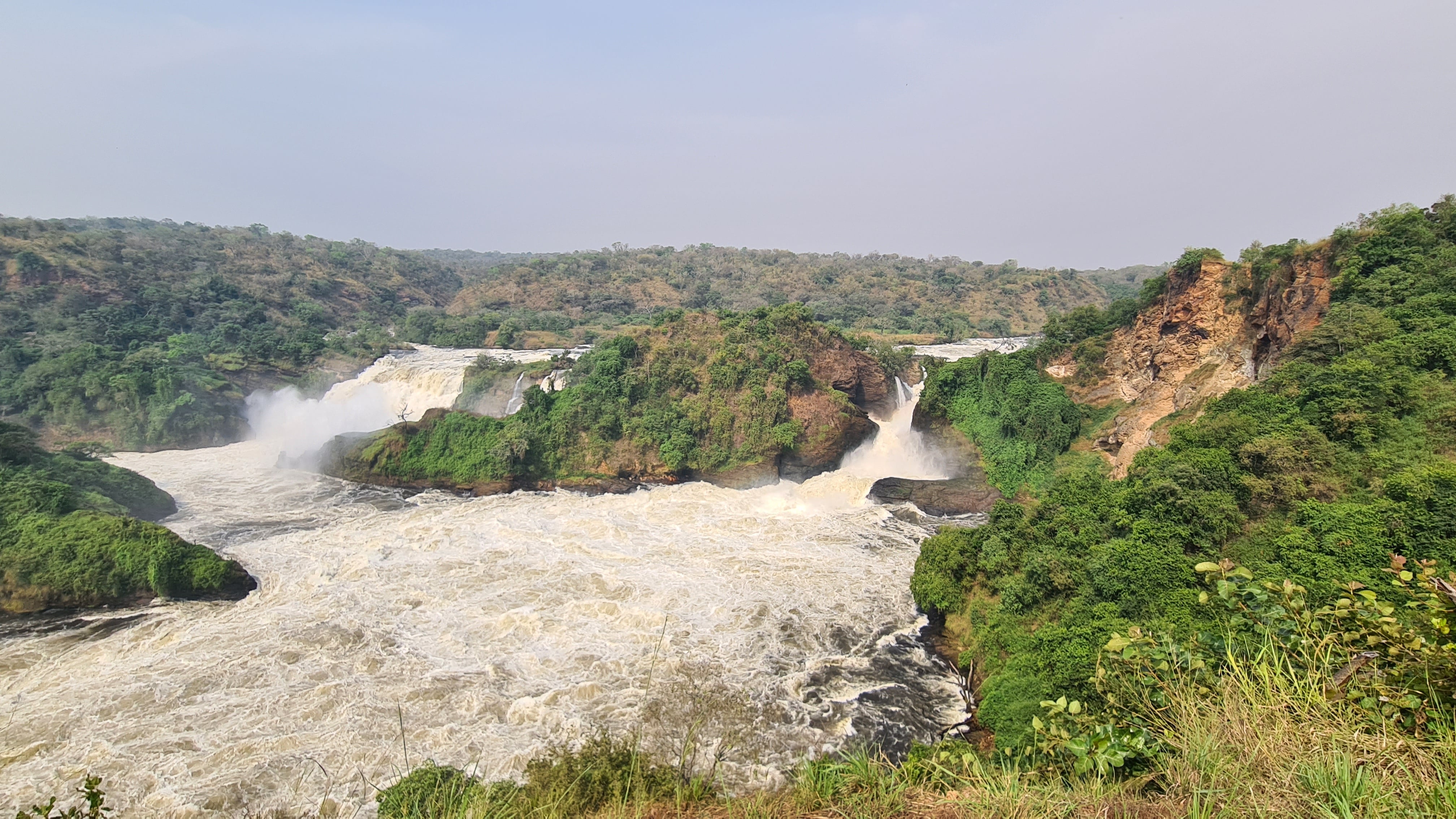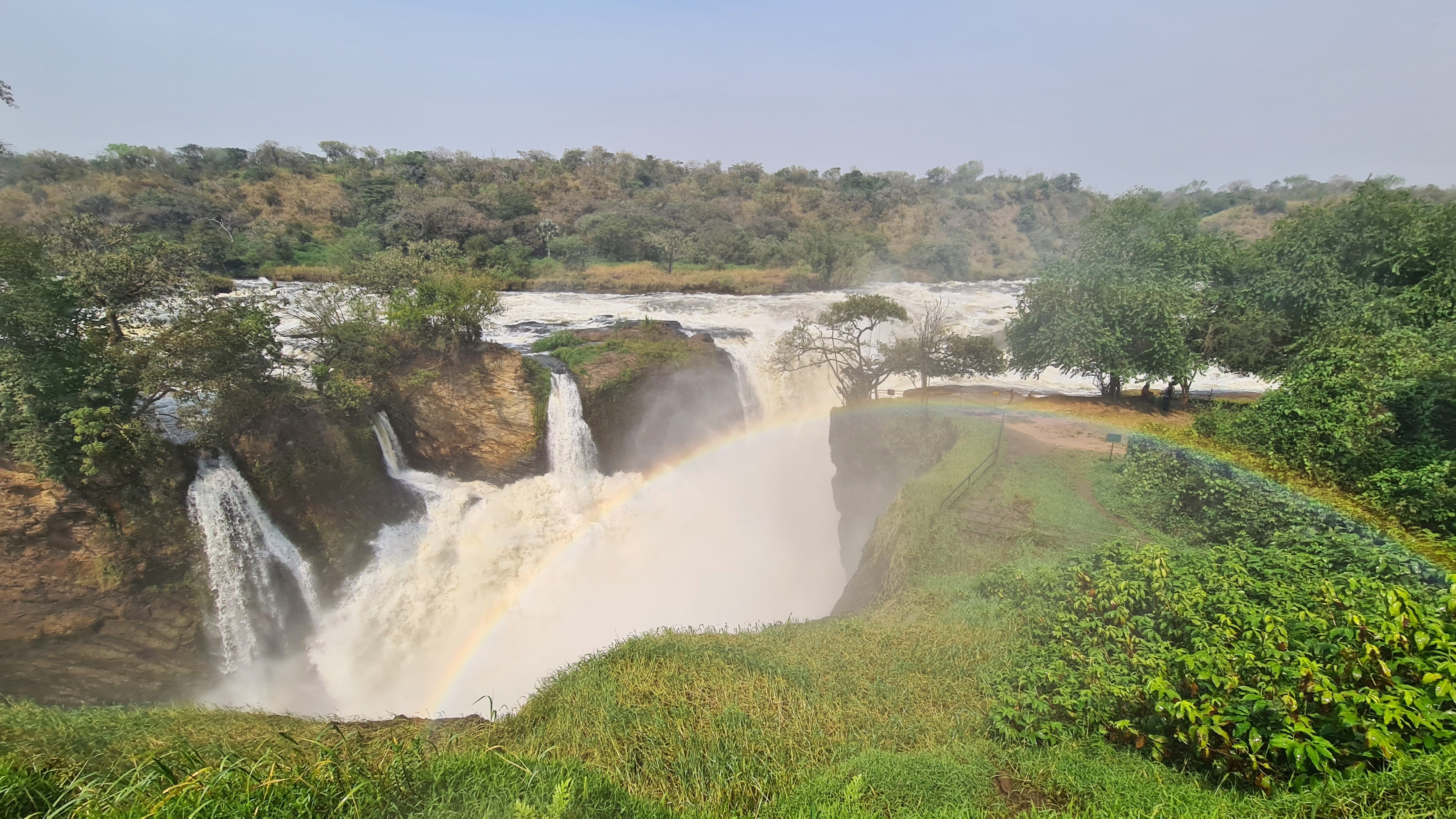 Doch die Investition lohnt sich auf jeden Fall. Auch wenn wir beiden nicht so sehr die Wasserfall-Enthusiasten sind, so sind wir doch ziemlich geplättet, als wir dem Spektakel näher kommen. Von Osten rauscht der Victoria Nile, wie der Name schon sagt entspringend aus dem Lake Victoria, mit brachialer Gewalt und krassen Stromschnellen heran, um sich an dieser Stelle im MFNP durch einen nur 7 m breiten Felsspalt 42 m in die Tiefe zu stürzen. Der Waschmaschineneffekt im höchsten Schleudergang ist zu hören, zu sehen und vor allem auch zu spüren. Innerhalb kürzester Zeit werden wir an den Aussichtspunkten pudelnass.