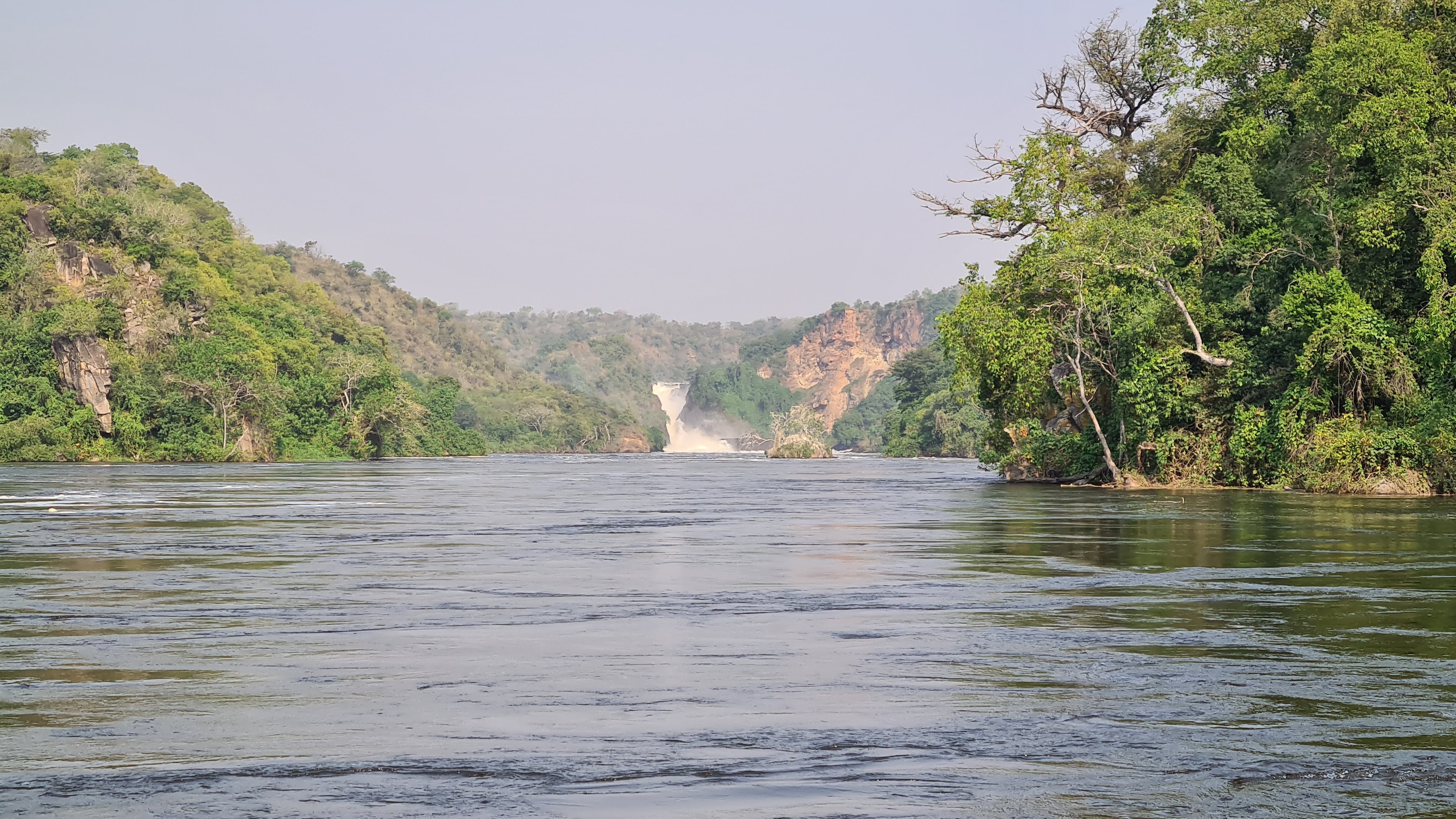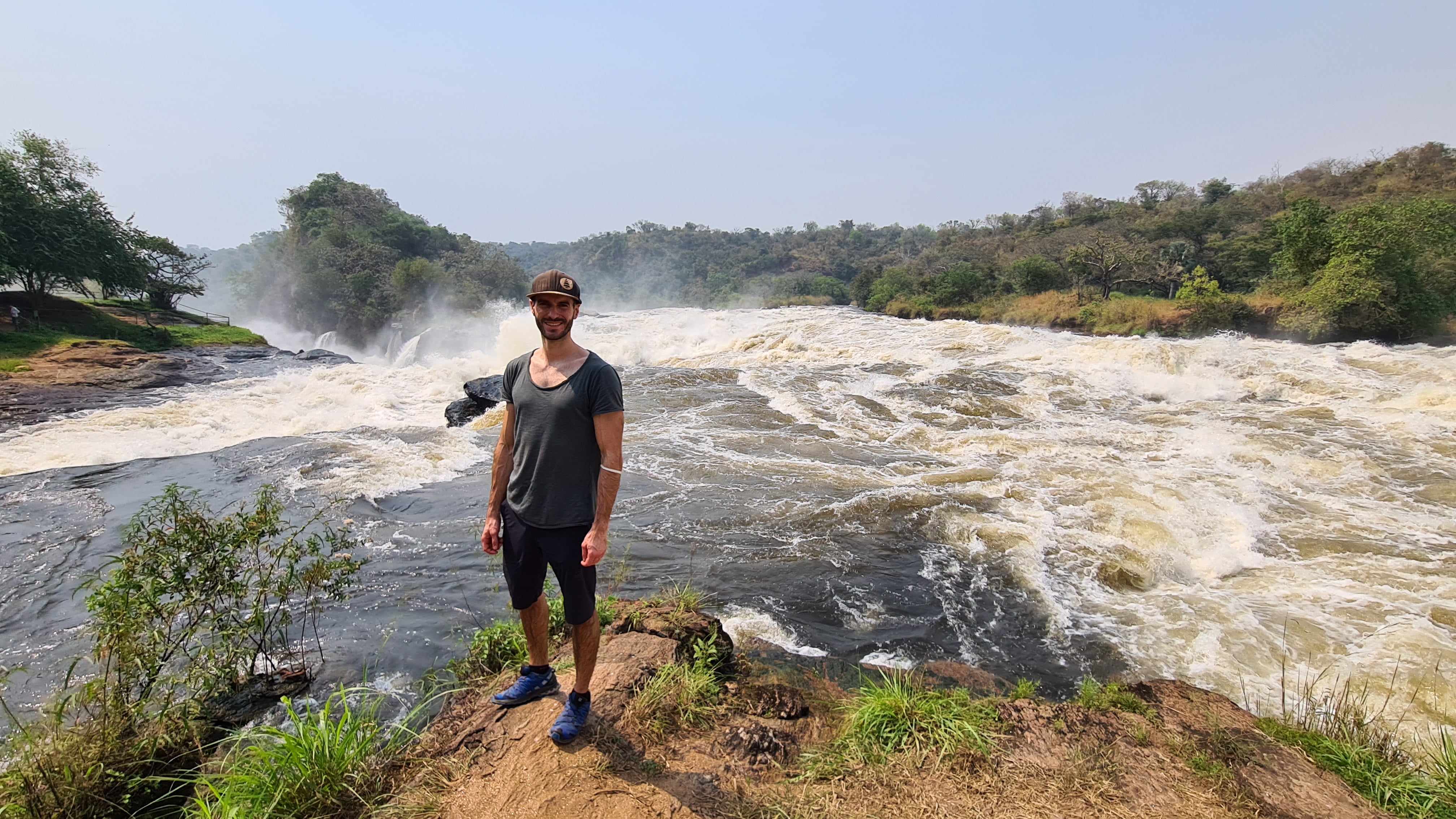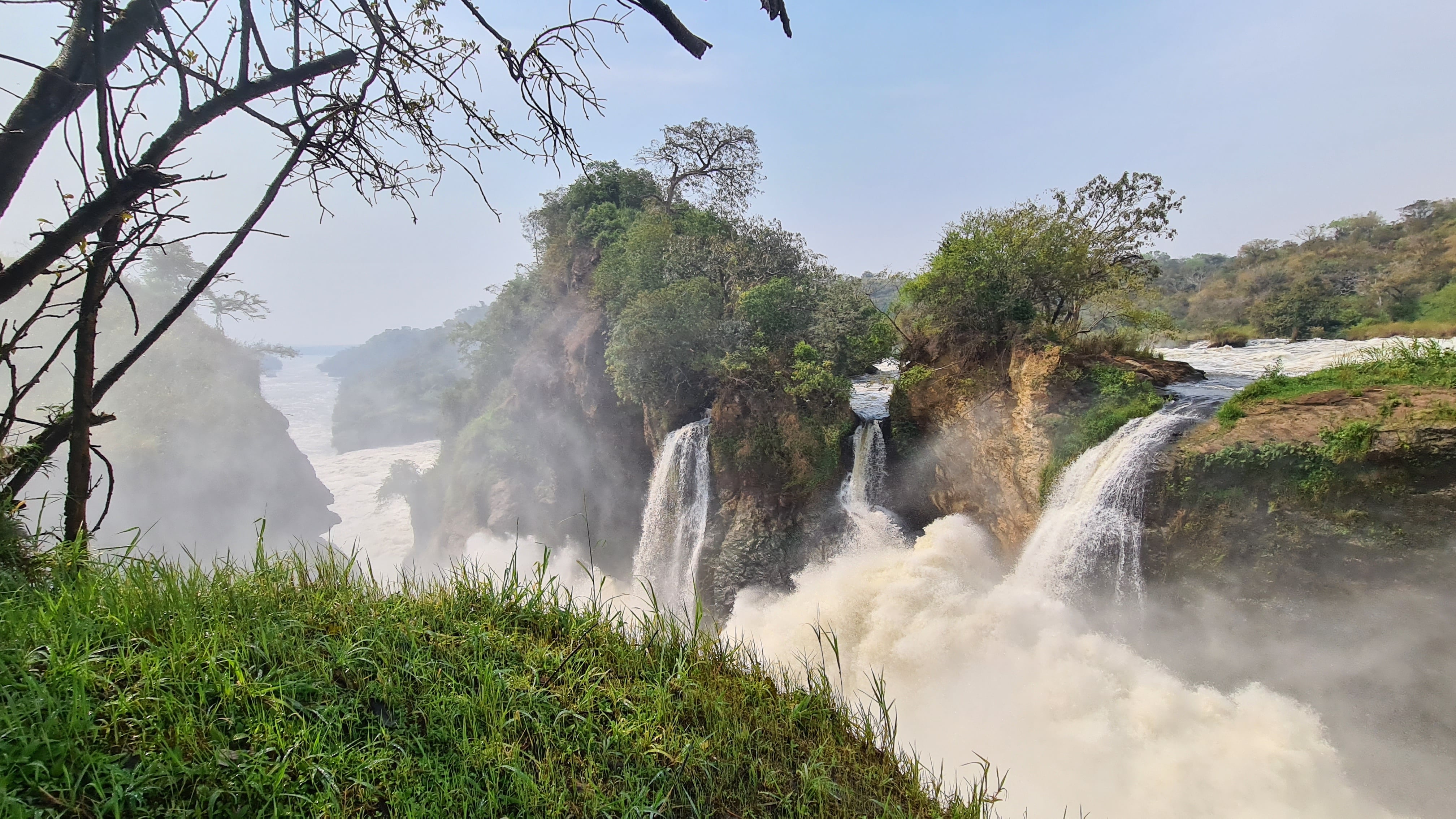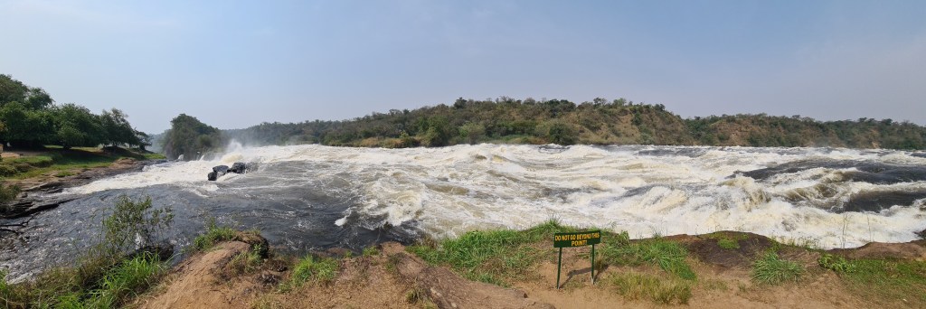 Doch die Investition lohnt sich auf jeden Fall. Auch wenn wir beiden nicht so sehr die Wasserfall-Enthusiasten sind, so sind wir doch ziemlich geplättet, als wir dem Spektakel näher kommen. Von Osten rauscht der Victoria Nile, wie der Name schon sagt entspringend aus dem Lake Victoria, mit brachialer Gewalt und krassen Stromschnellen heran, um sich an dieser Stelle im MFNP durch einen nur 7 m breiten Felsspalt 42 m in die Tiefe zu stürzen. Der Waschmaschineneffekt im höchsten Schleudergang ist zu hören, zu sehen und vor allem auch zu spüren. Innerhalb kürzester Zeit werden wir an den Aussichtspunkten pudelnass.
