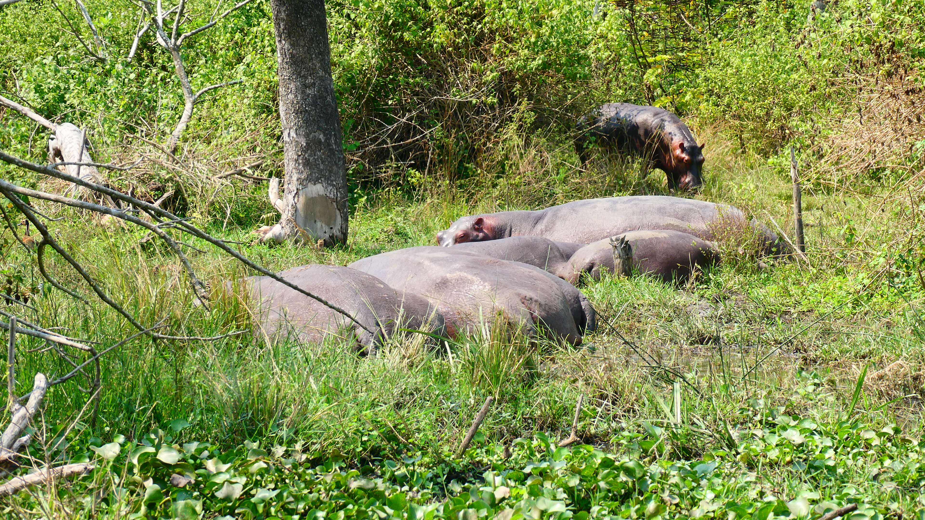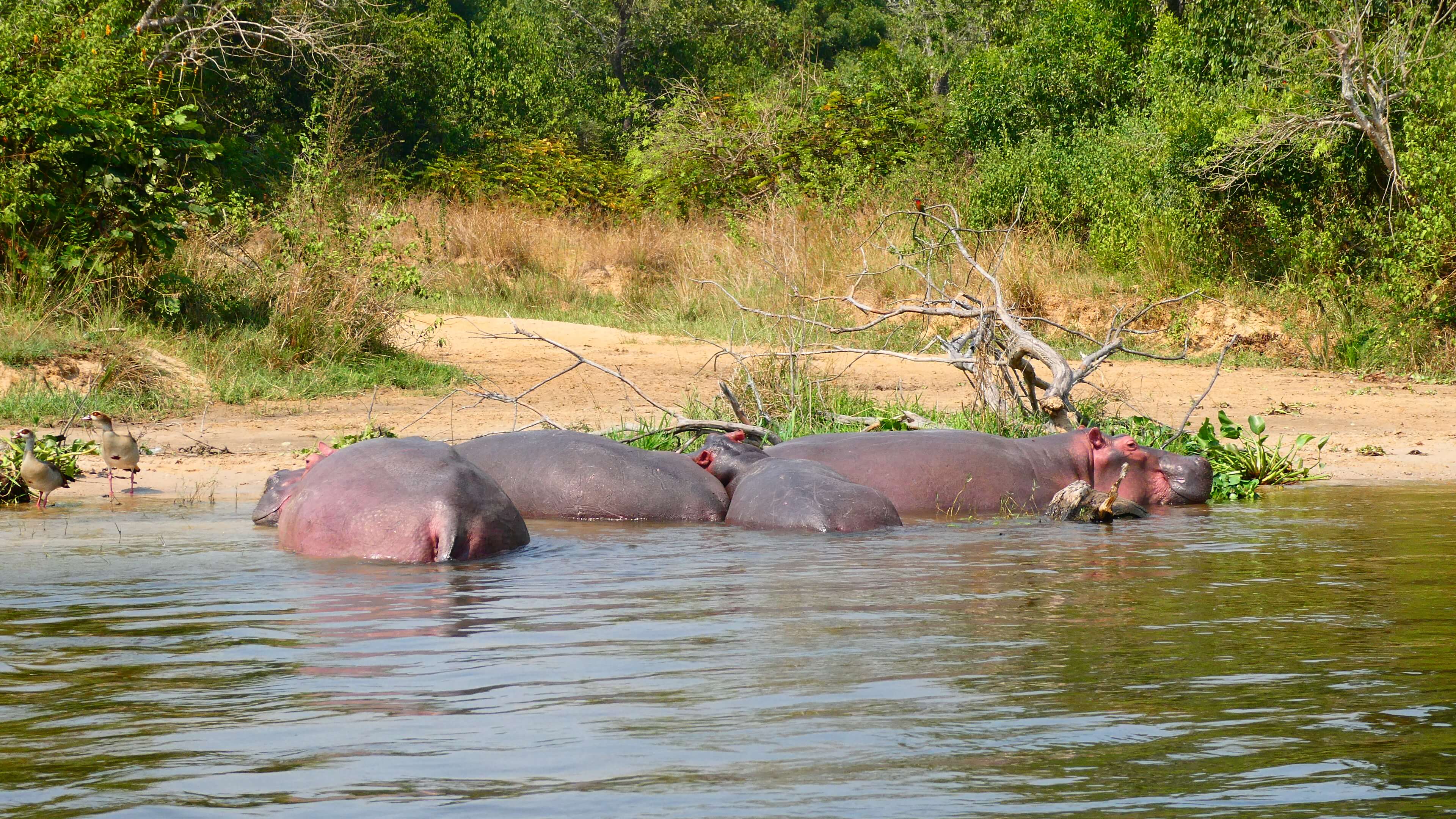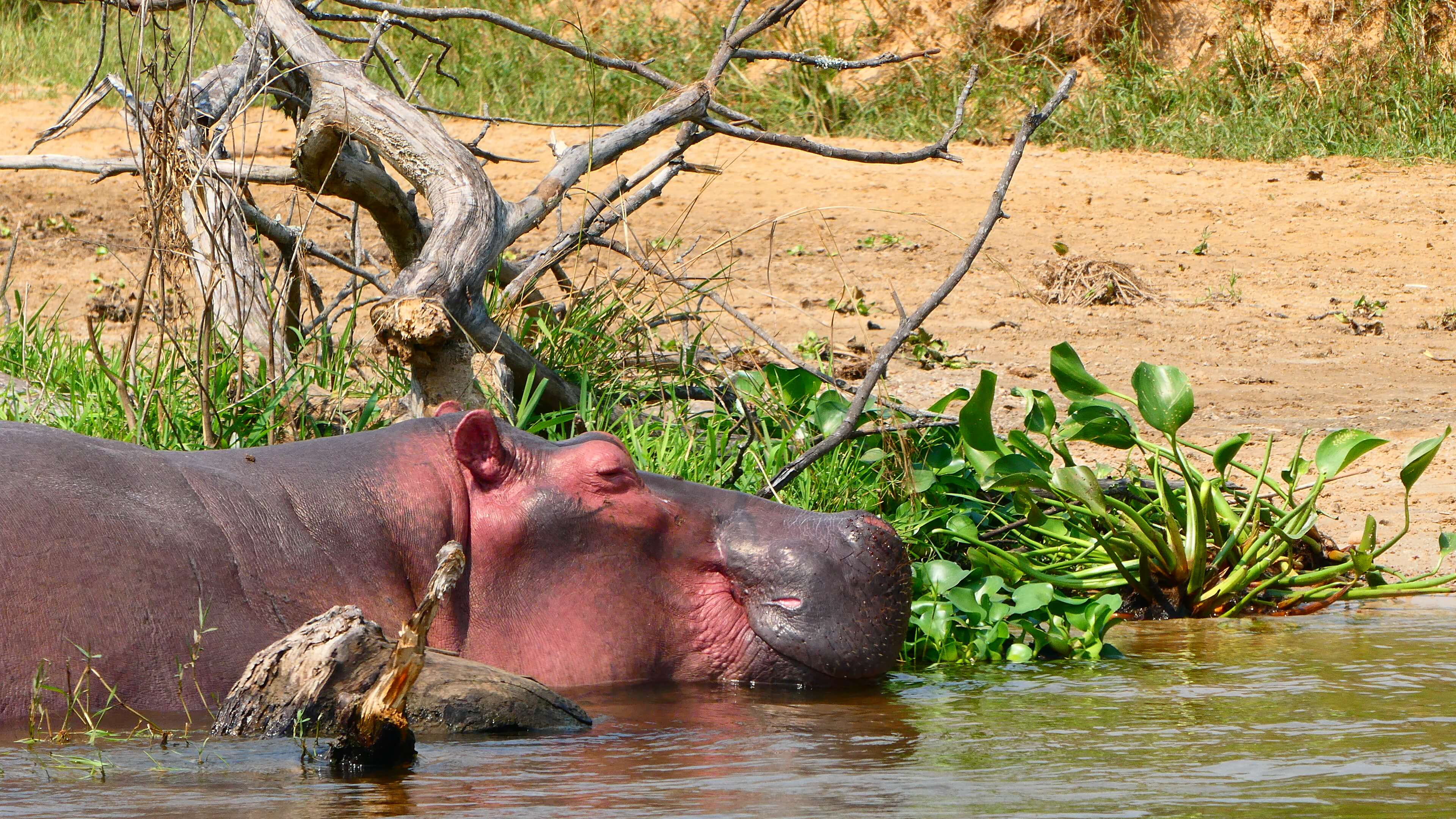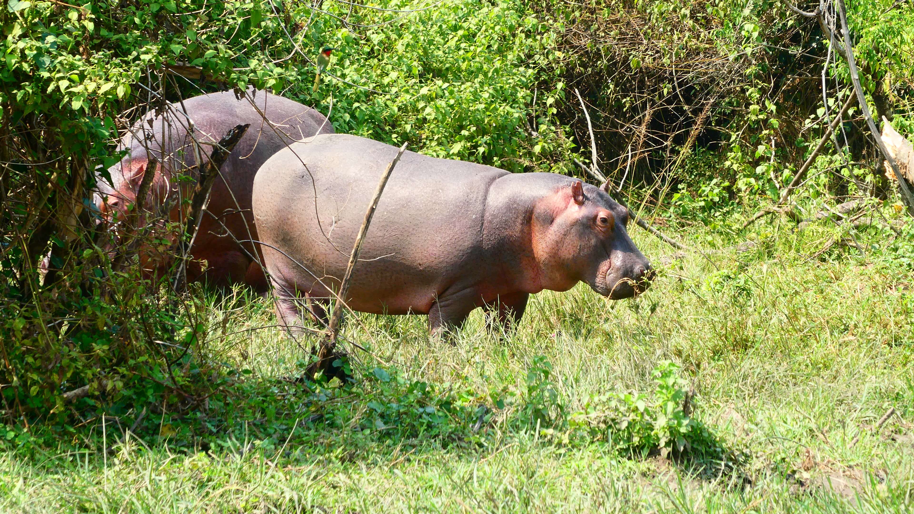 Um 4 Uhr weckt uns ein leichter Regen aus dem Schlaf in unserem Roofless-Tent. Also, schnell raus und doch lieber die Zeltplane drüberwerfen. Matthias schaut ungläubig dem Taschenlampenlicht hinterher: Hey, da steht ein Nilpferd! Tatsächlich nur wenige Meter hinterm Auto grast es seelenruhig unsere Campingwiese ab. Es bleibt nicht die einzige Begegnung mit den Speckbären. Am Morgen läuft Matthias fast in eines rein, als er aus dem Waschraum kommt. Wir lernen: Nilpferde verbringen den ganzen Tag im kühlen Wasser, kommen aber nachts an Land zum Grasen und Fressen und legen dabei mehrere Kilometer zurück – selbst in unwegsamem und steilem Gelände. Wer hätte das gedacht?!