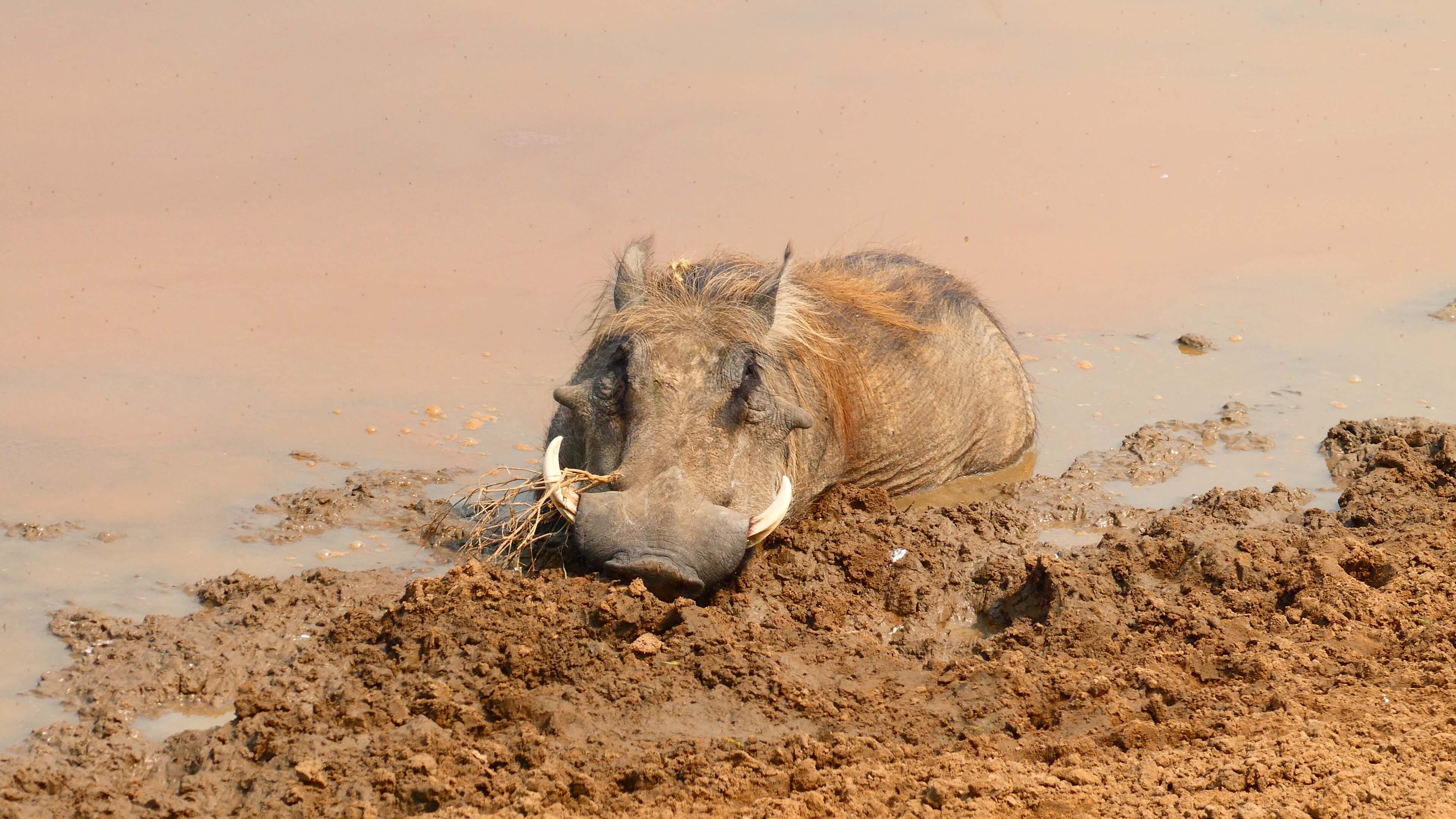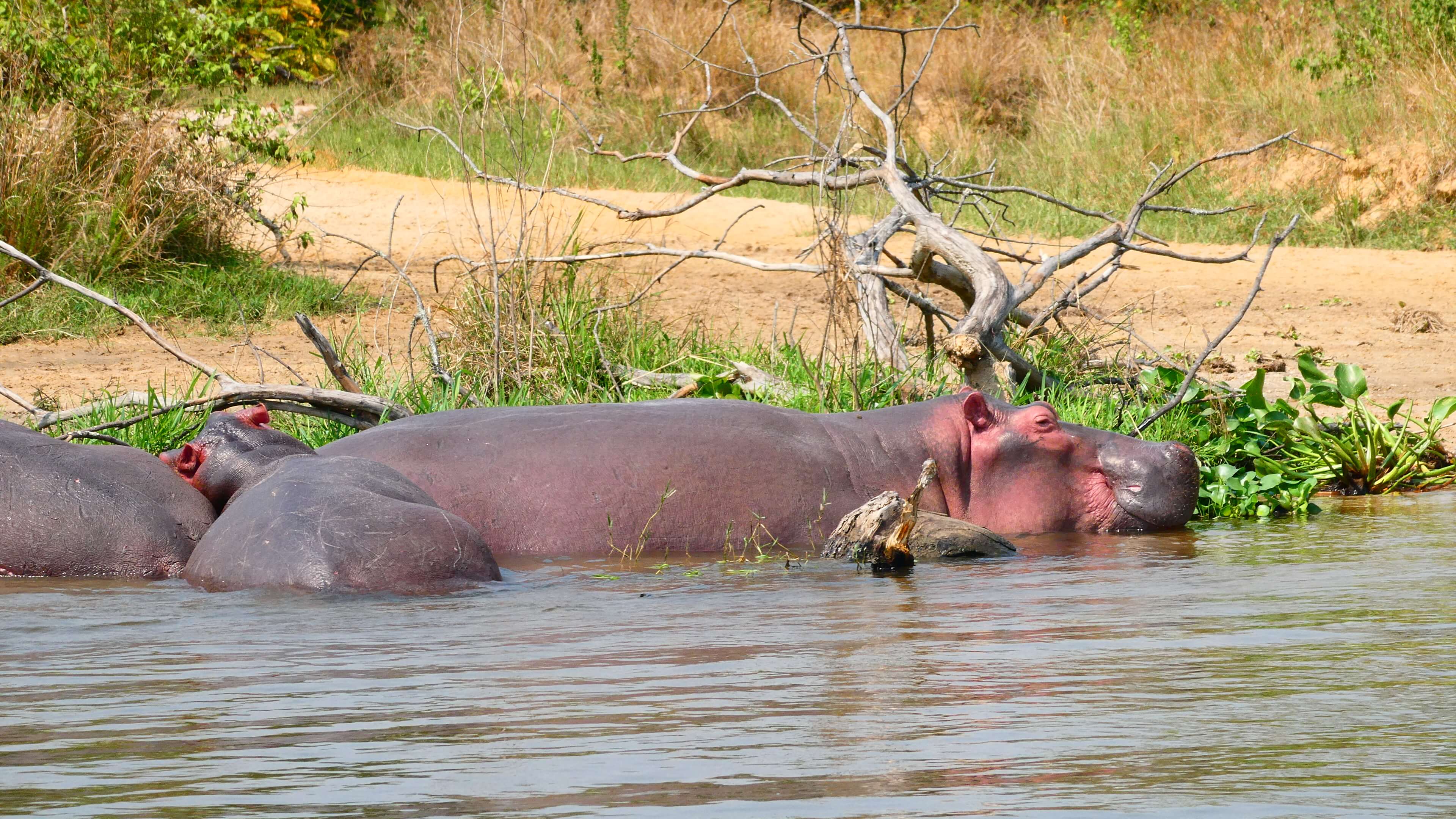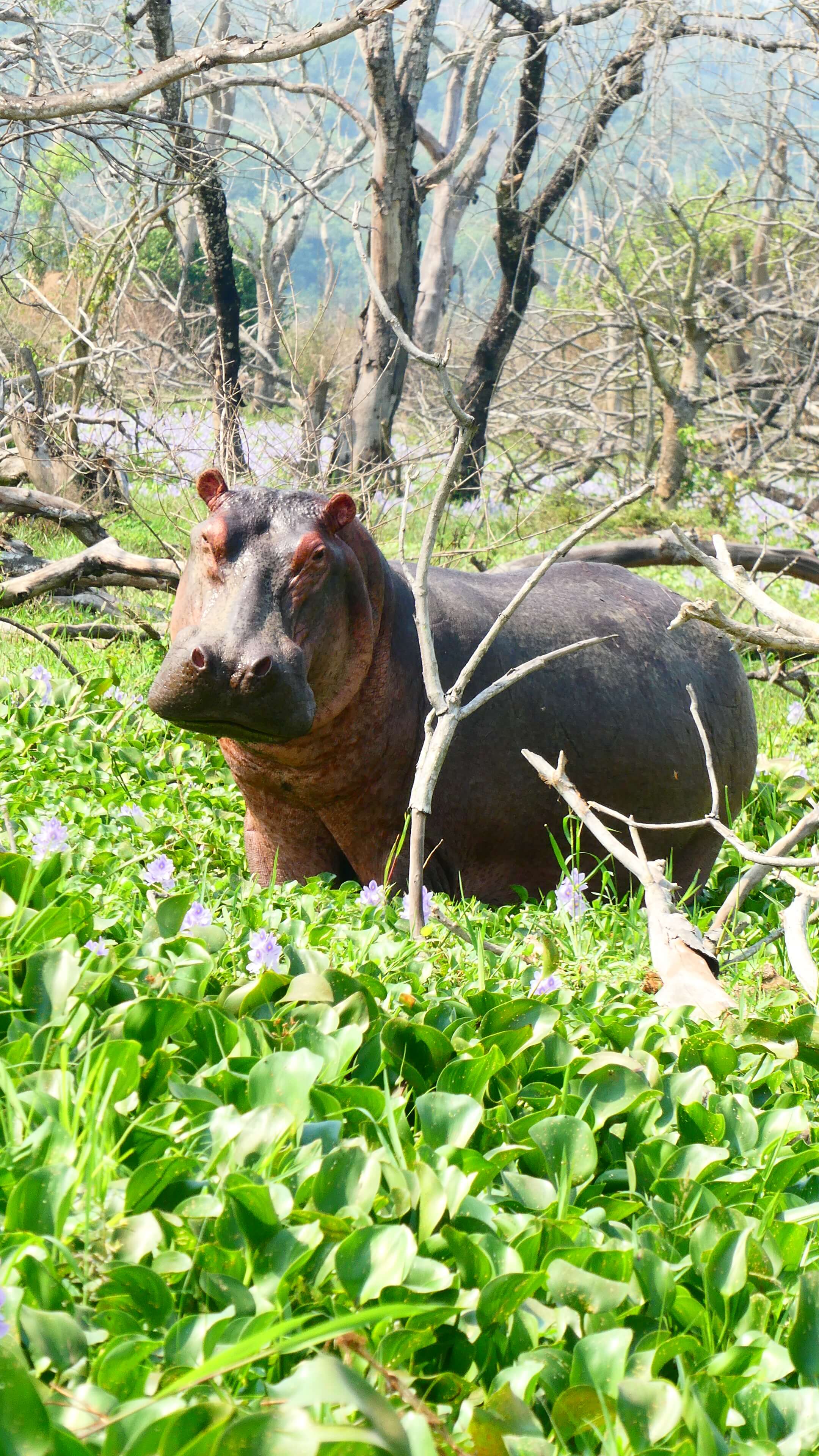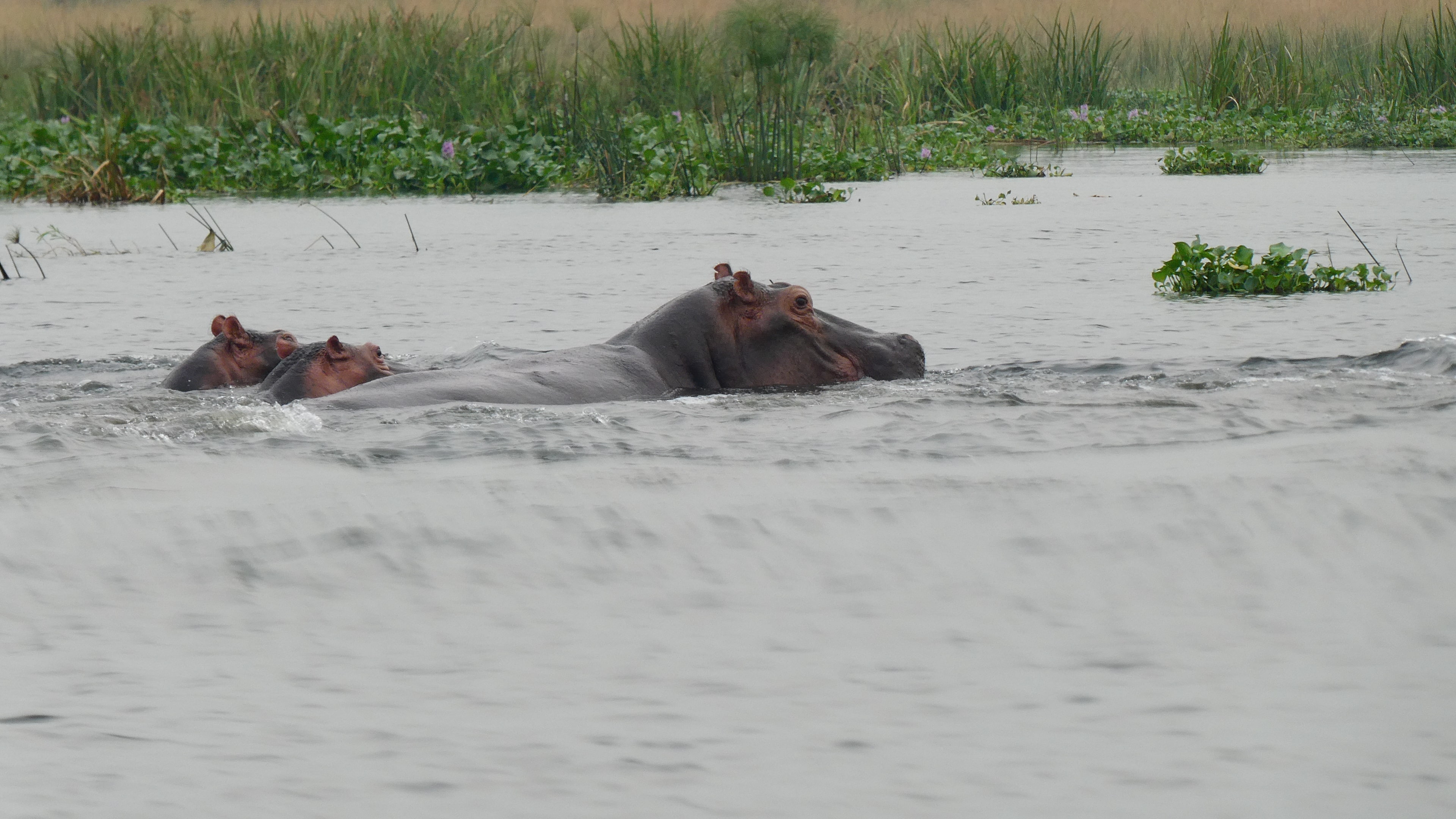 Um 4 Uhr weckt uns ein leichter Regen aus dem Schlaf in unserem Roofless-Tent. Also, schnell raus und doch lieber die Zeltplane drüberwerfen. Matthias schaut ungläubig dem Taschenlampenlicht hinterher: Hey, da steht ein Nilpferd! Tatsächlich nur wenige Meter hinterm Auto grast es seelenruhig unsere Campingwiese ab. Es bleibt nicht die einzige Begegnung mit den Speckbären. Am Morgen läuft Matthias fast in eines rein, als er aus dem Waschraum kommt. Wir lernen: Nilpferde verbringen den ganzen Tag im kühlen Wasser, kommen aber nachts an Land zum Grasen und Fressen und legen dabei mehrere Kilometer zurück – selbst in unwegsamem und steilem Gelände. Wer hätte das gedacht?!