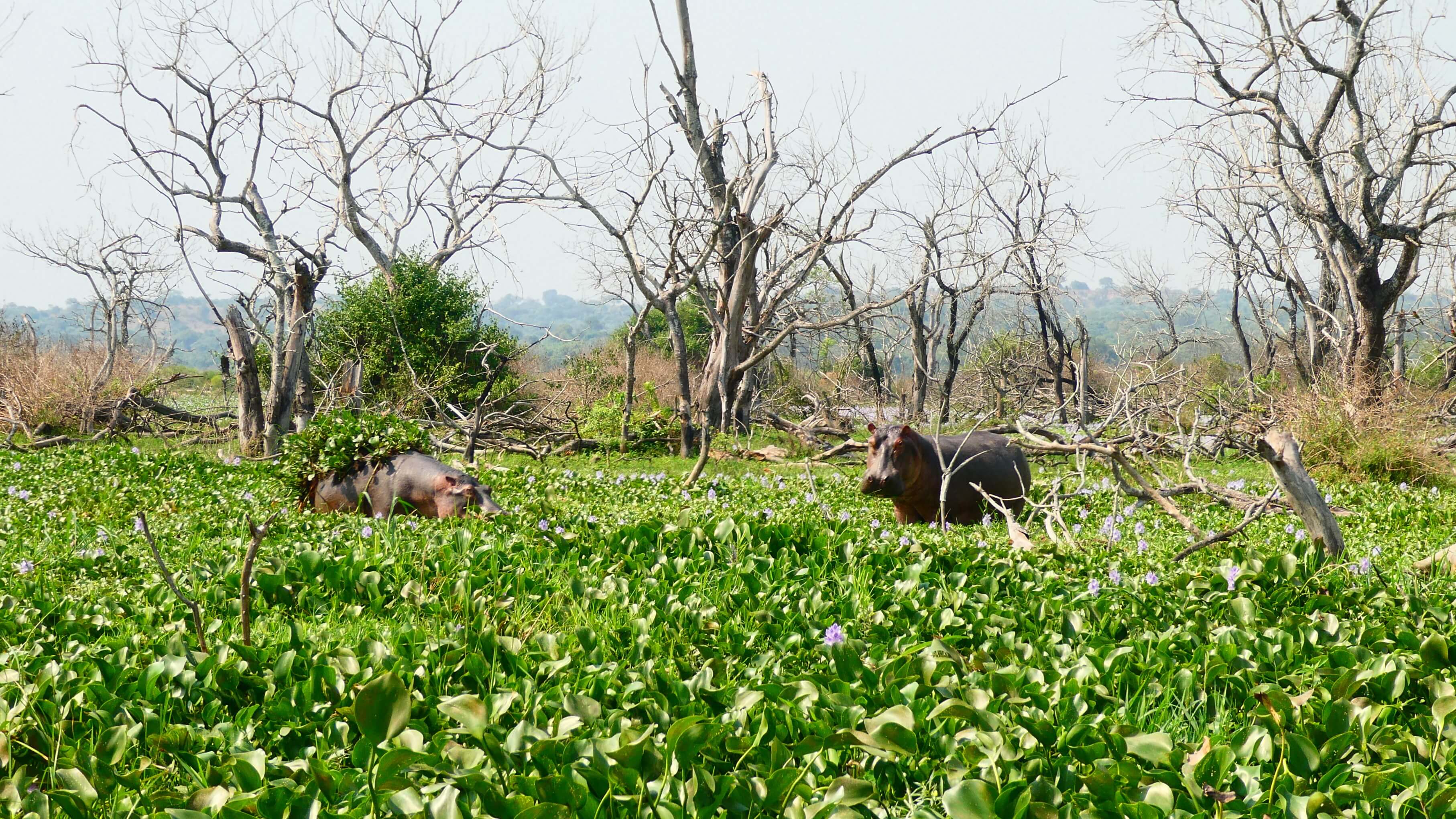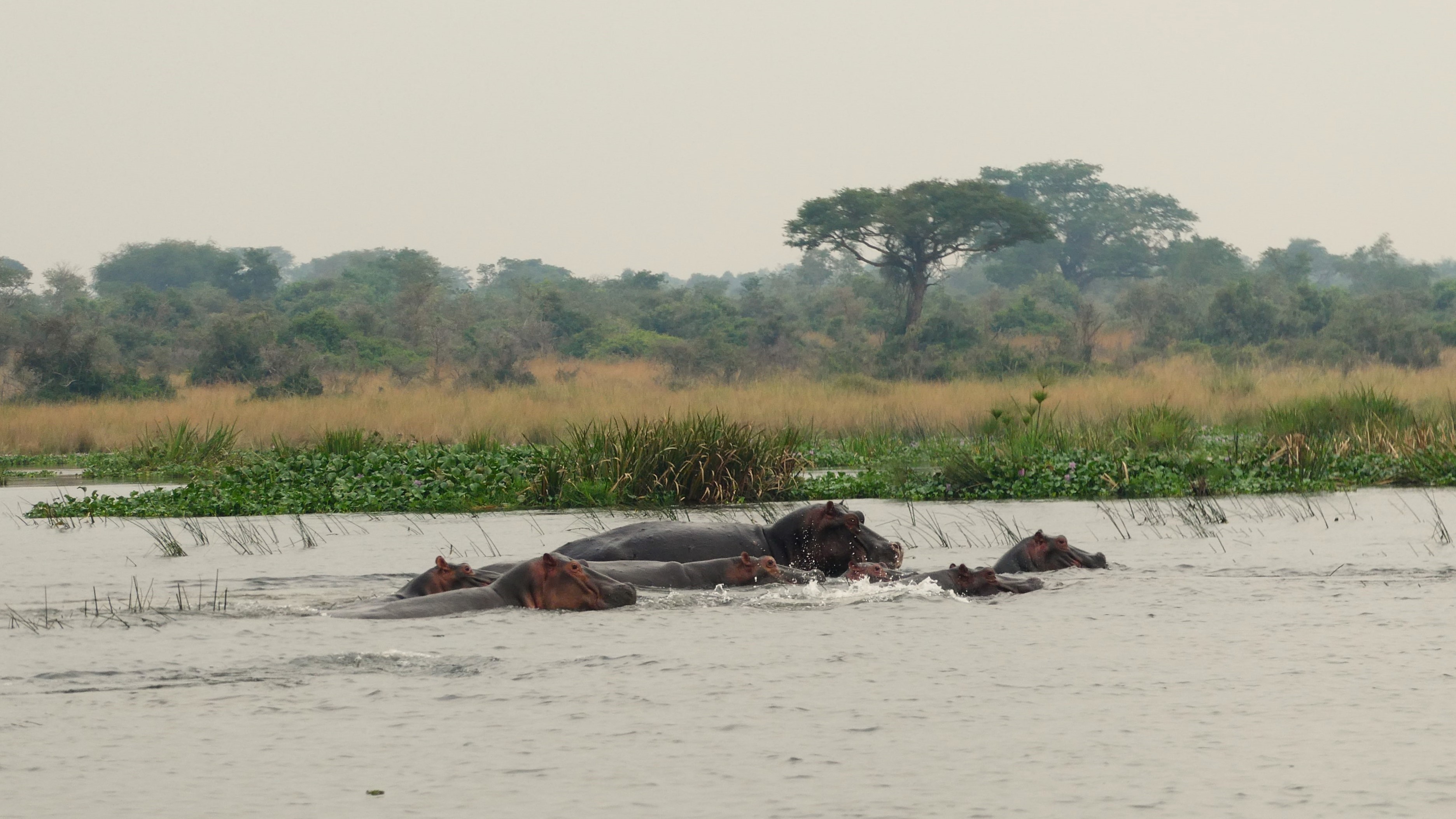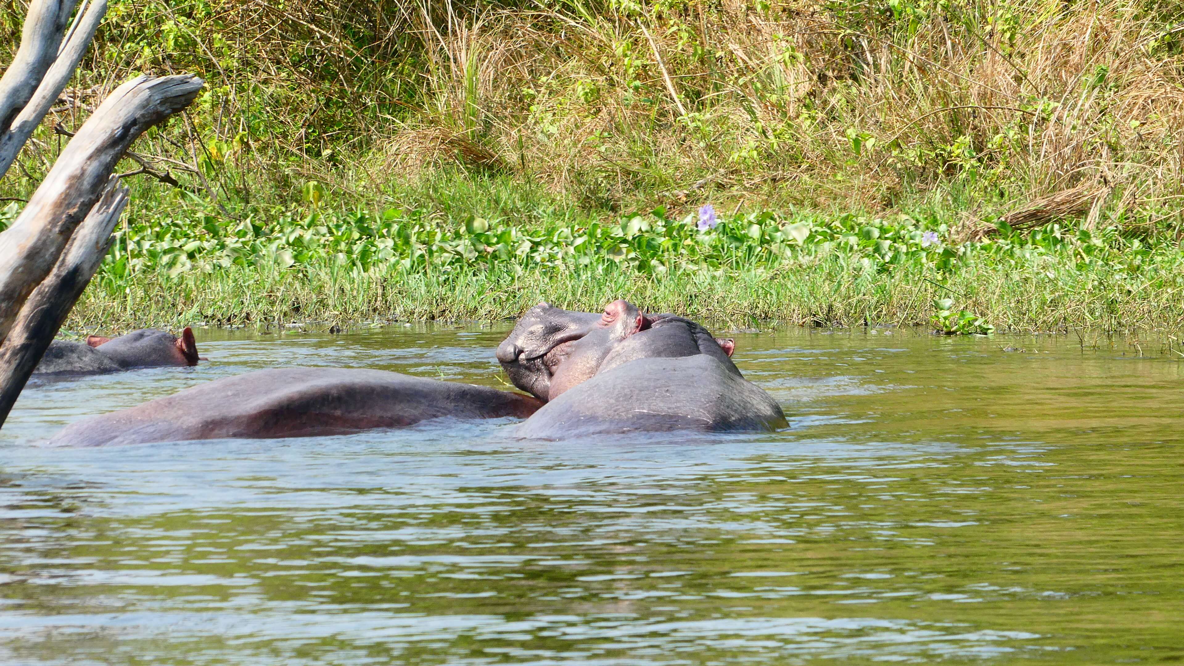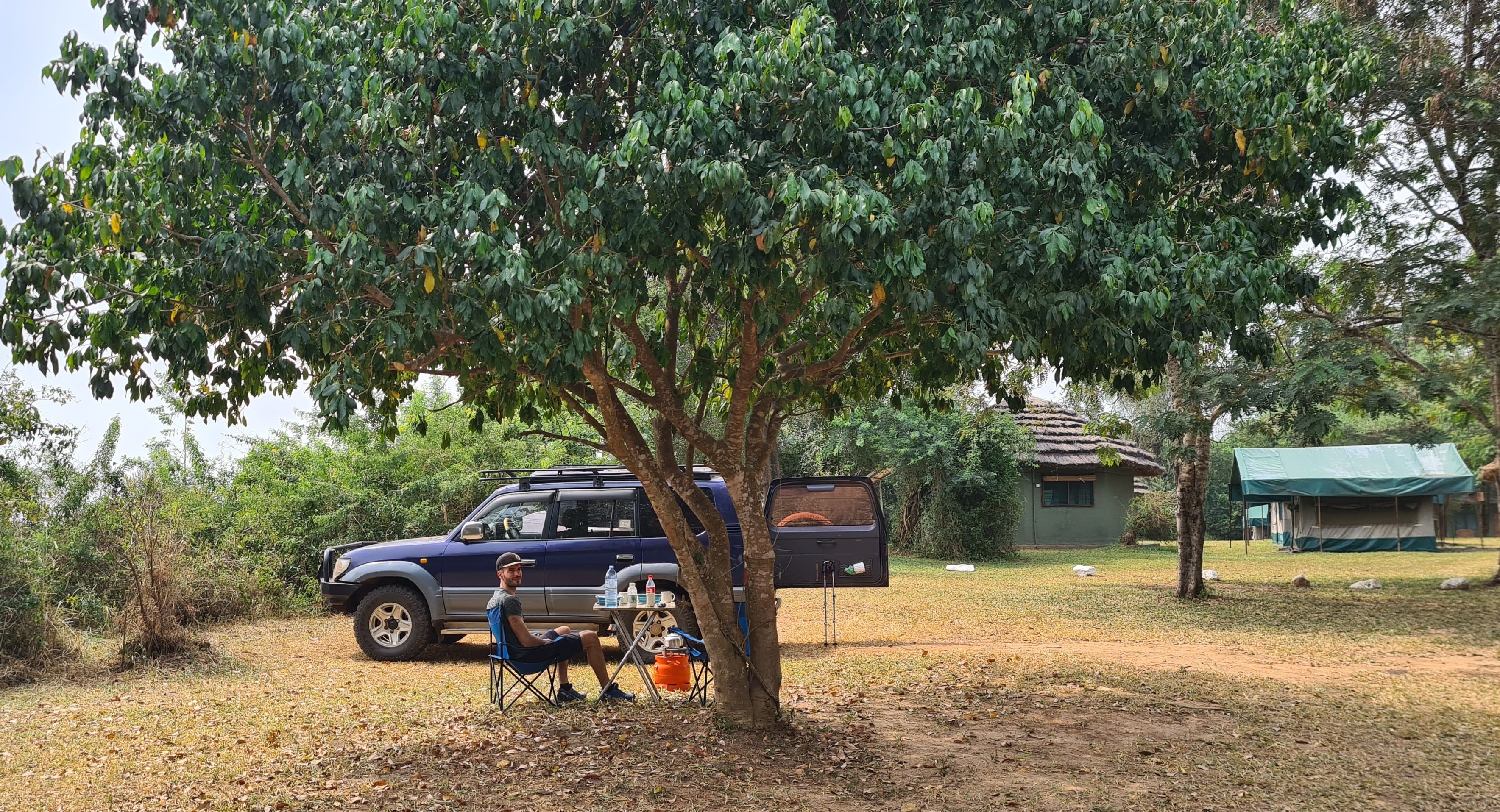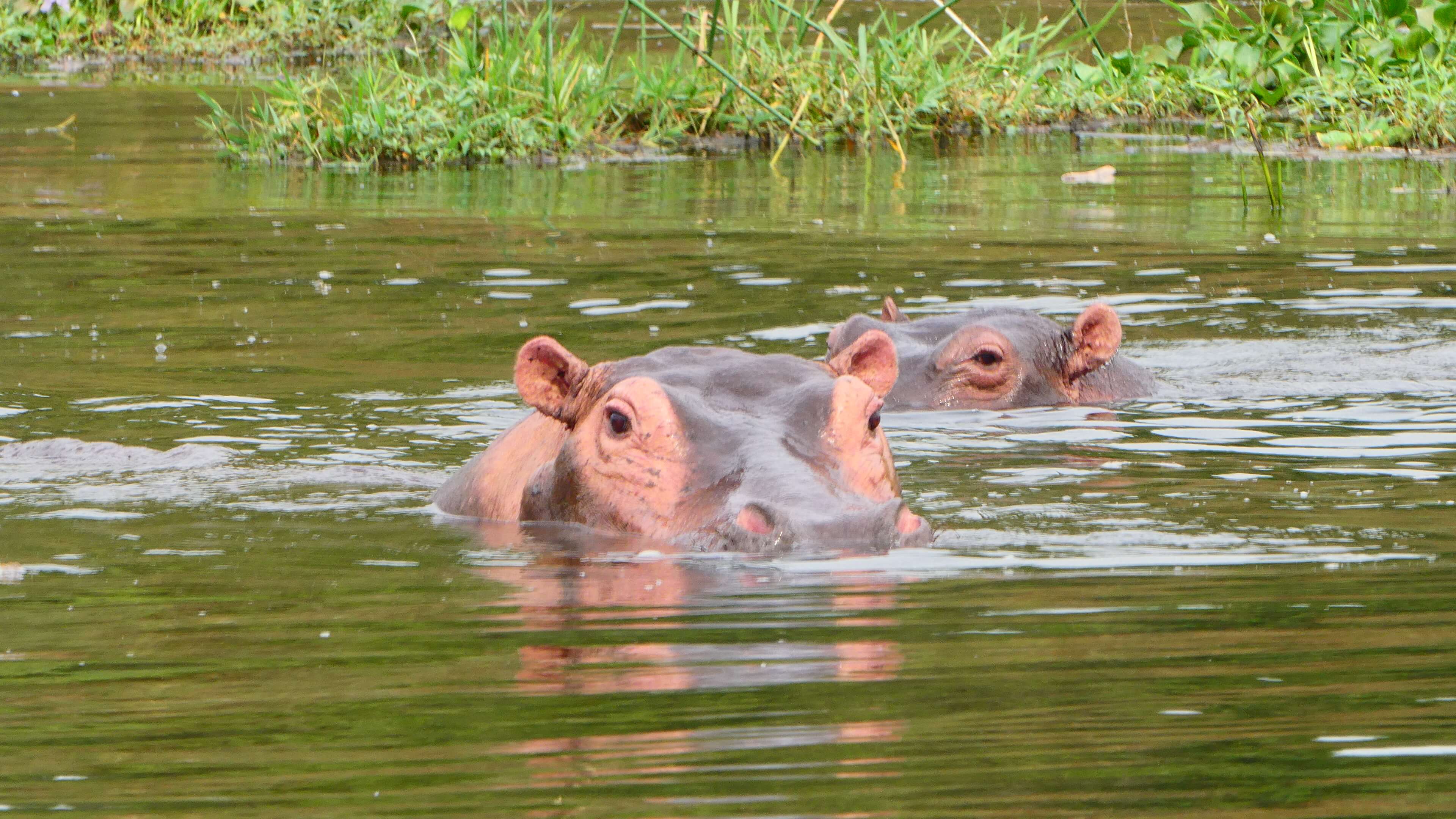 Um 4 Uhr weckt uns ein leichter Regen aus dem Schlaf in unserem Roofless-Tent. Also, schnell raus und doch lieber die Zeltplane drüberwerfen. Matthias schaut ungläubig dem Taschenlampenlicht hinterher: Hey, da steht ein Nilpferd! Tatsächlich nur wenige Meter hinterm Auto grast es seelenruhig unsere Campingwiese ab. Es bleibt nicht die einzige Begegnung mit den Speckbären. Am Morgen läuft Matthias fast in eines rein, als er aus dem Waschraum kommt. Wir lernen: Nilpferde verbringen den ganzen Tag im kühlen Wasser, kommen aber nachts an Land zum Grasen und Fressen und legen dabei mehrere Kilometer zurück – selbst in unwegsamem und steilem Gelände. Wer hätte das gedacht?!