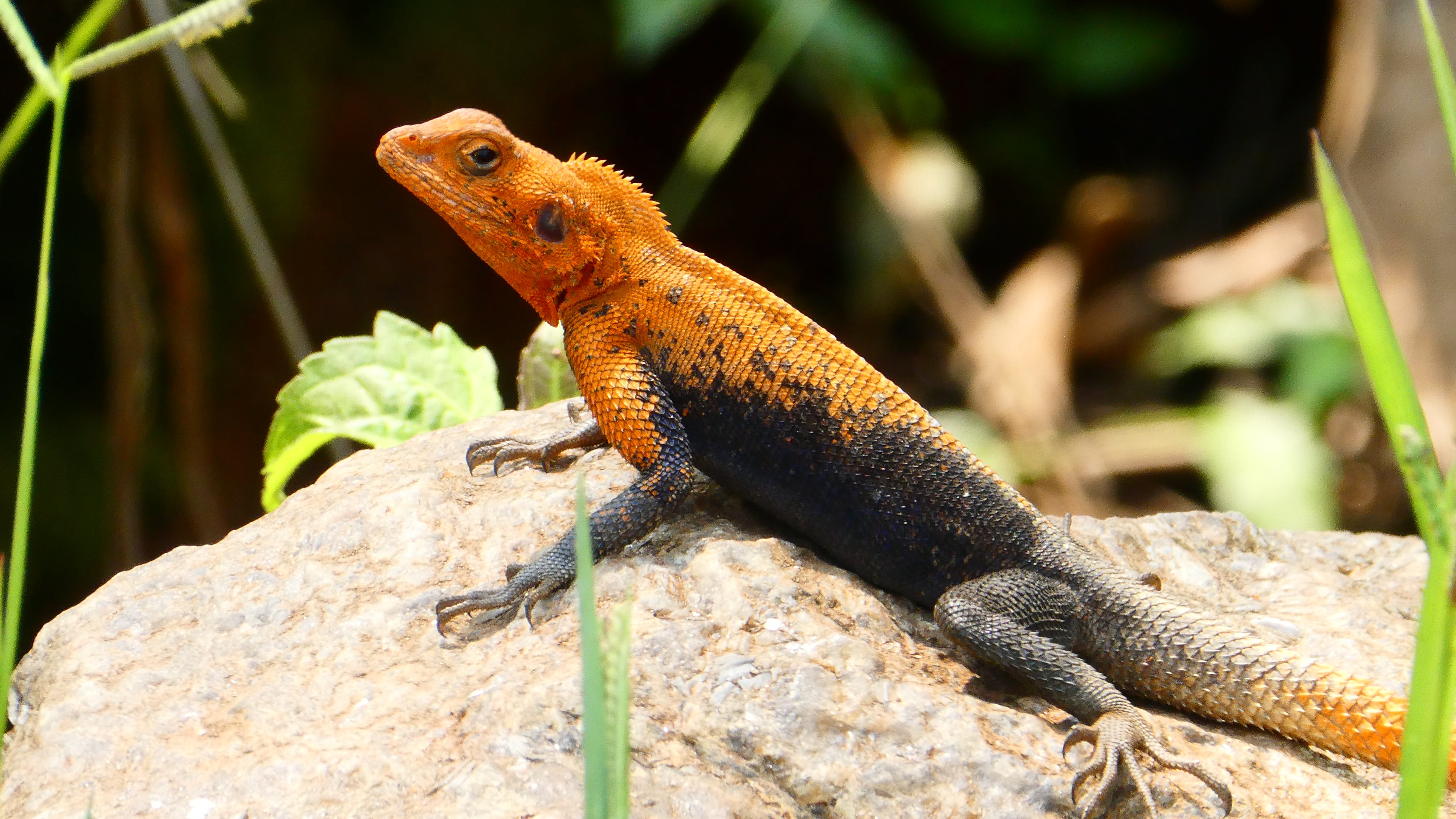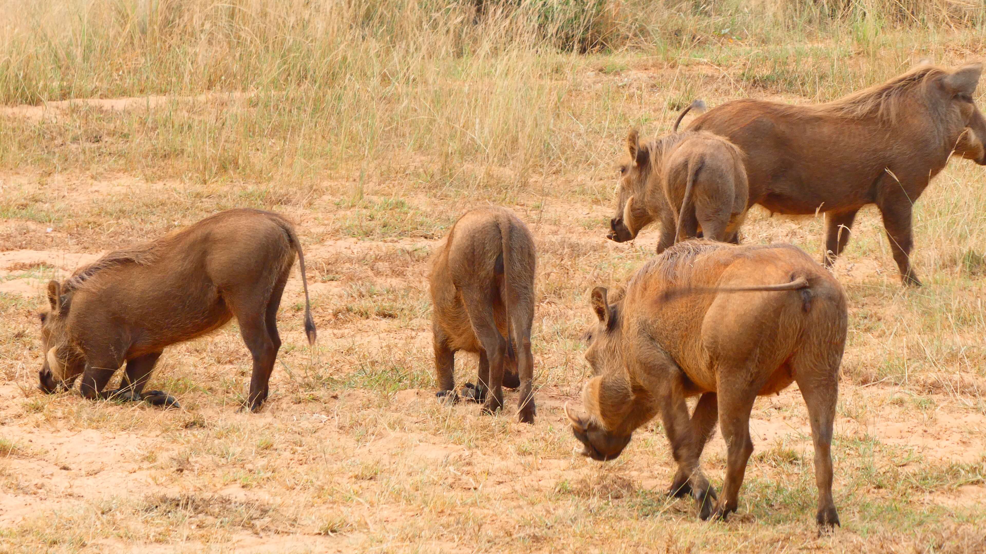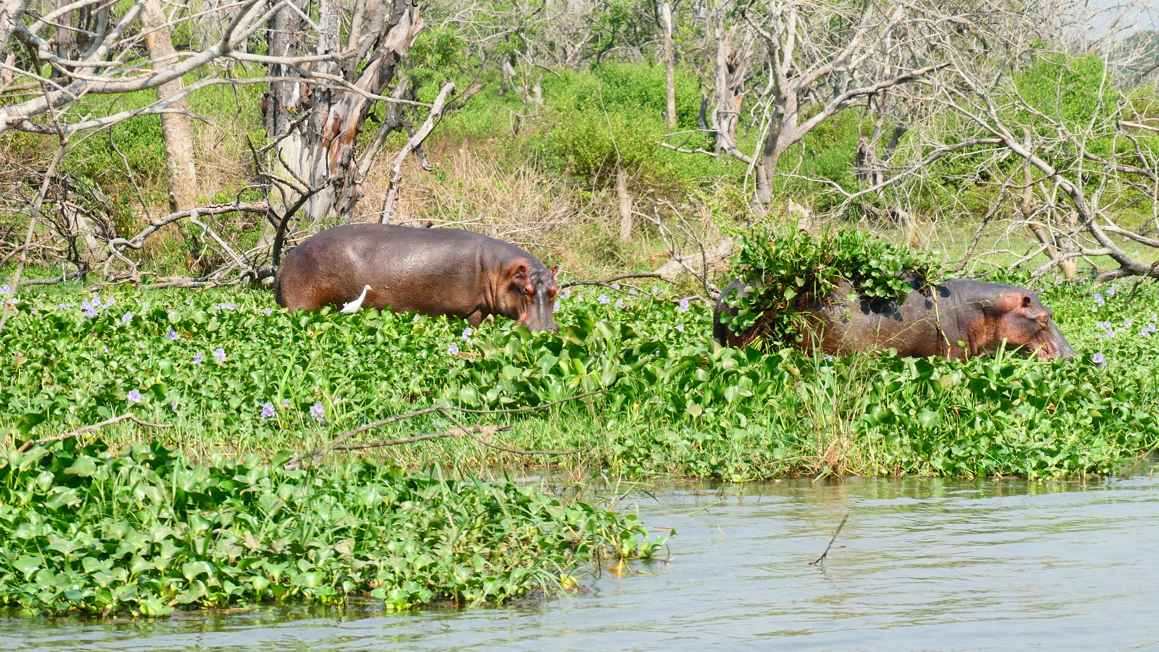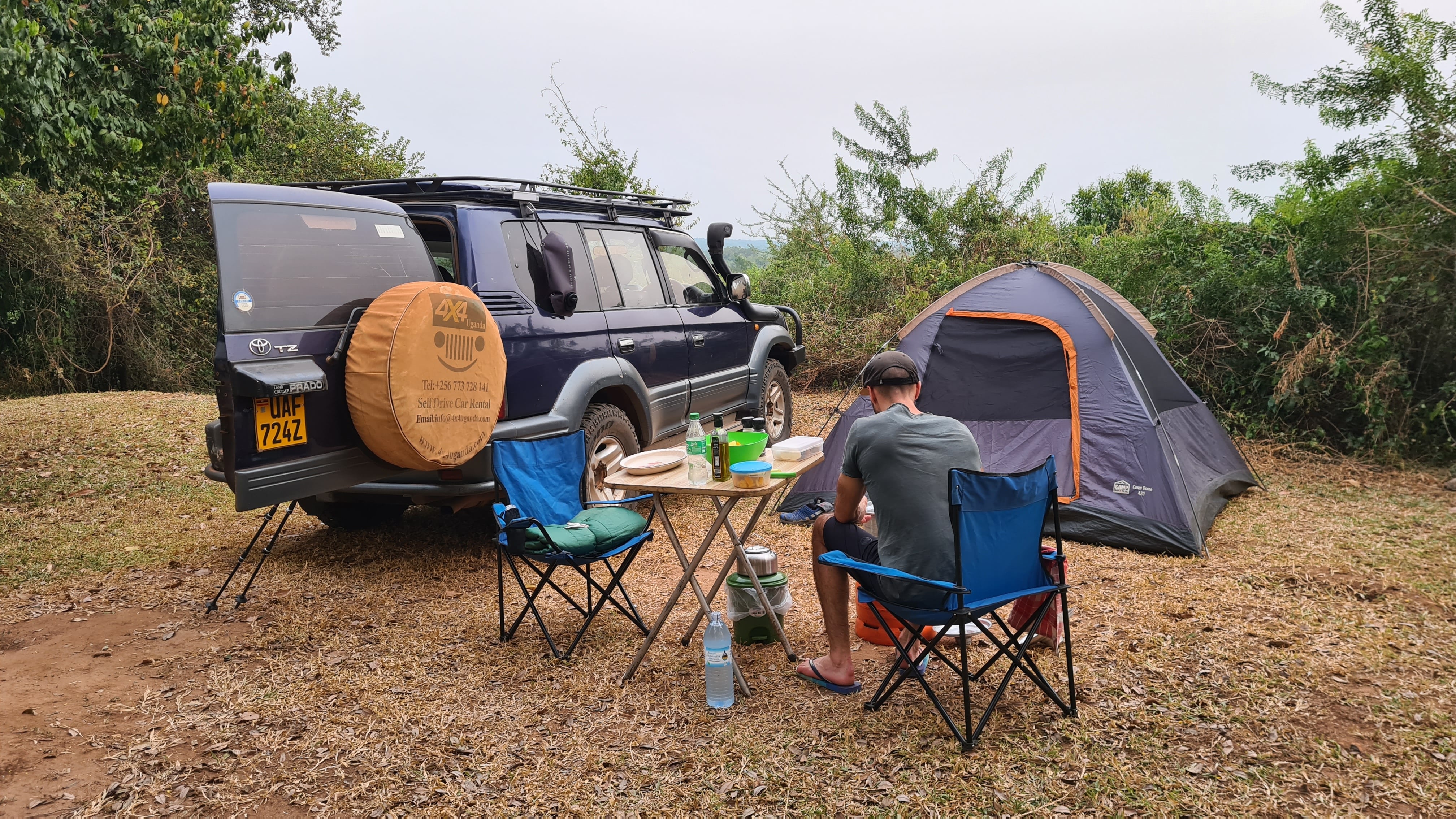 Um 4 Uhr weckt uns ein leichter Regen aus dem Schlaf in unserem Roofless-Tent. Also, schnell raus und doch lieber die Zeltplane drüberwerfen. Matthias schaut ungläubig dem Taschenlampenlicht hinterher: Hey, da steht ein Nilpferd! Tatsächlich nur wenige Meter hinterm Auto grast es seelenruhig unsere Campingwiese ab. Es bleibt nicht die einzige Begegnung mit den Speckbären. Am Morgen läuft Matthias fast in eines rein, als er aus dem Waschraum kommt. Wir lernen: Nilpferde verbringen den ganzen Tag im kühlen Wasser, kommen aber nachts an Land zum Grasen und Fressen und legen dabei mehrere Kilometer zurück – selbst in unwegsamem und steilem Gelände. Wer hätte das gedacht?!