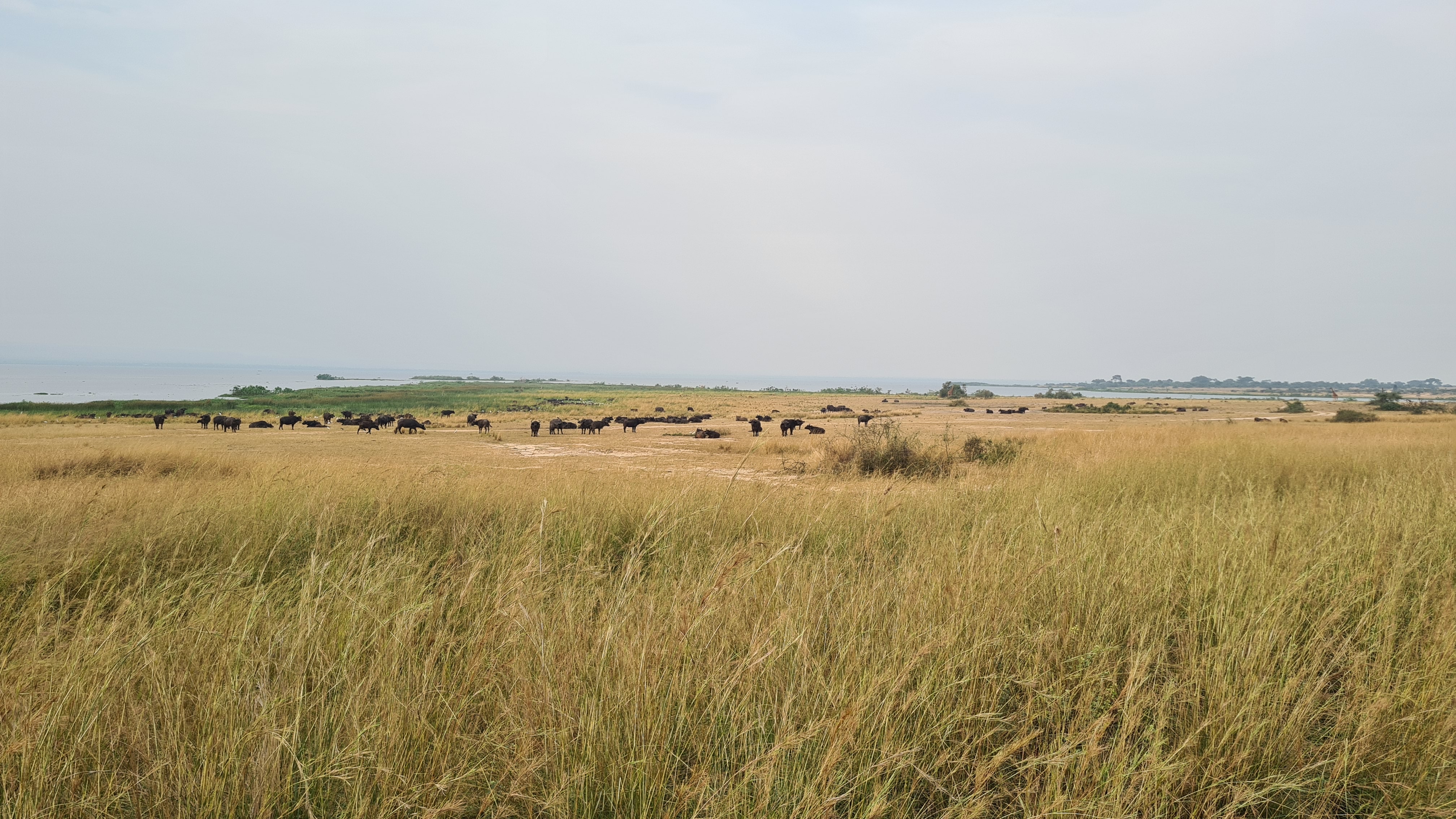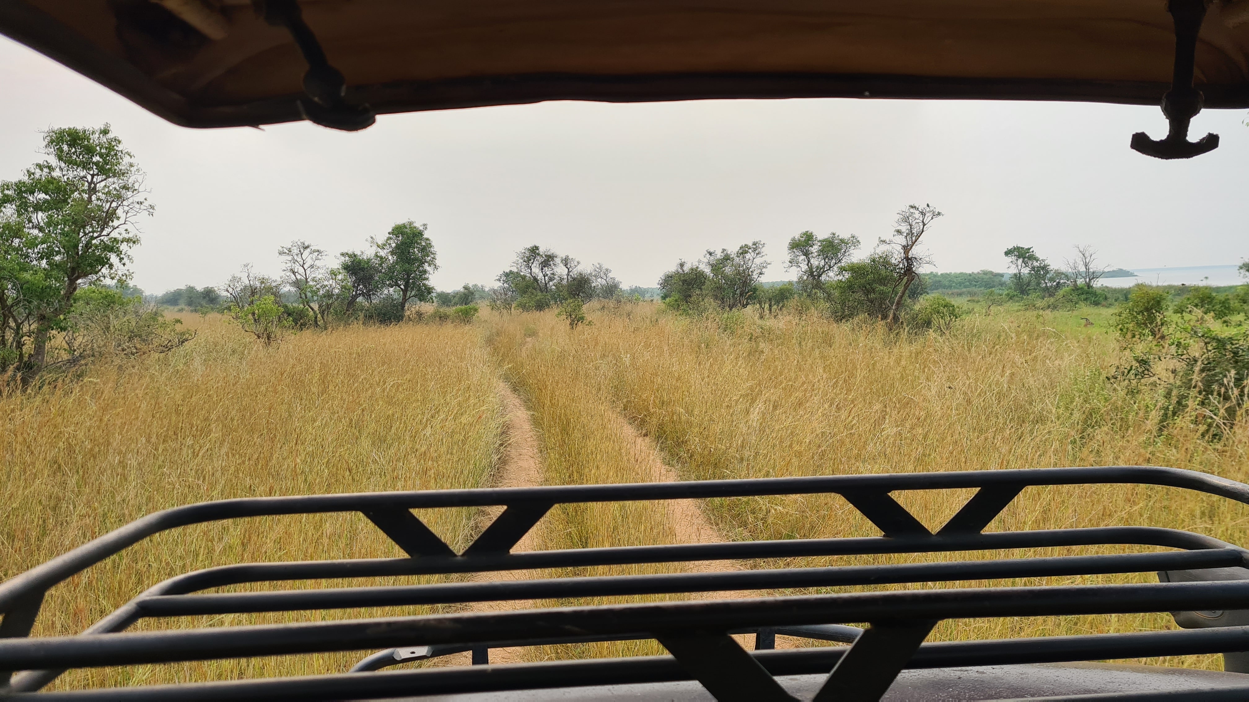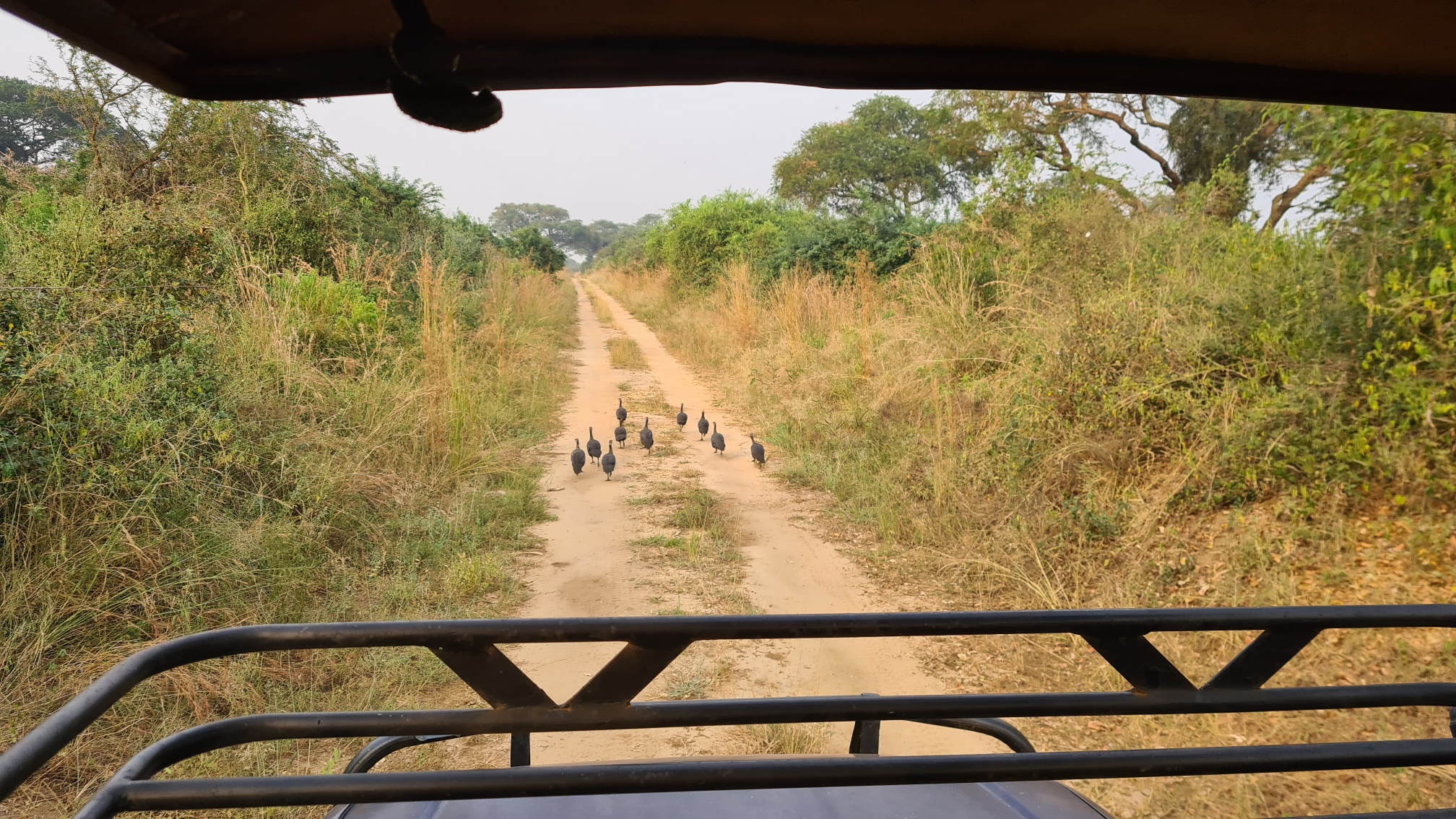 Am nächsten Tag wollen wir uns dem nördlichen Teil der Halbinsel zwischen Victoria- und Albert-Nile widmen und starten wieder früh um 7 Uhr. Die Landschaft hier ist viel buschiger und undurchdringlicher. Den meisten Spaß haben wir mit den aufgescheuchten Hühnern, die zwar Reißaus nehmen, dabei aber eeeeewwwiiiig aufgeregt auf der Fahrbahn rumtippeln, bevor ihnen wohl doch die Puste ausgeht und sie im Gebüsch verschwinden. Nach dem buschigen Gelände führt der Weg weiter durch Wiesen und über Sandbänke, immer wieder müssen wir umkehren und bessere Alternativen suchen.