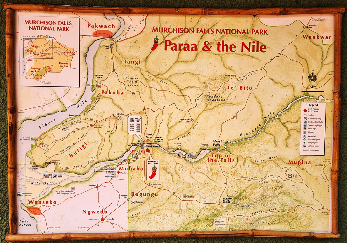 Vom Ziwa Rhino Sanctuary geht es für uns weiter zum Murchison Falls National Park. Erst 75 km über Masindi zum Kichu(m)banyobo Entrance Gate und von dort noch einmal rund 70 km zum Red Chilli Rest Camp, wo wir uns für drei Nächte auf dem Campingplatz eingebucht haben.