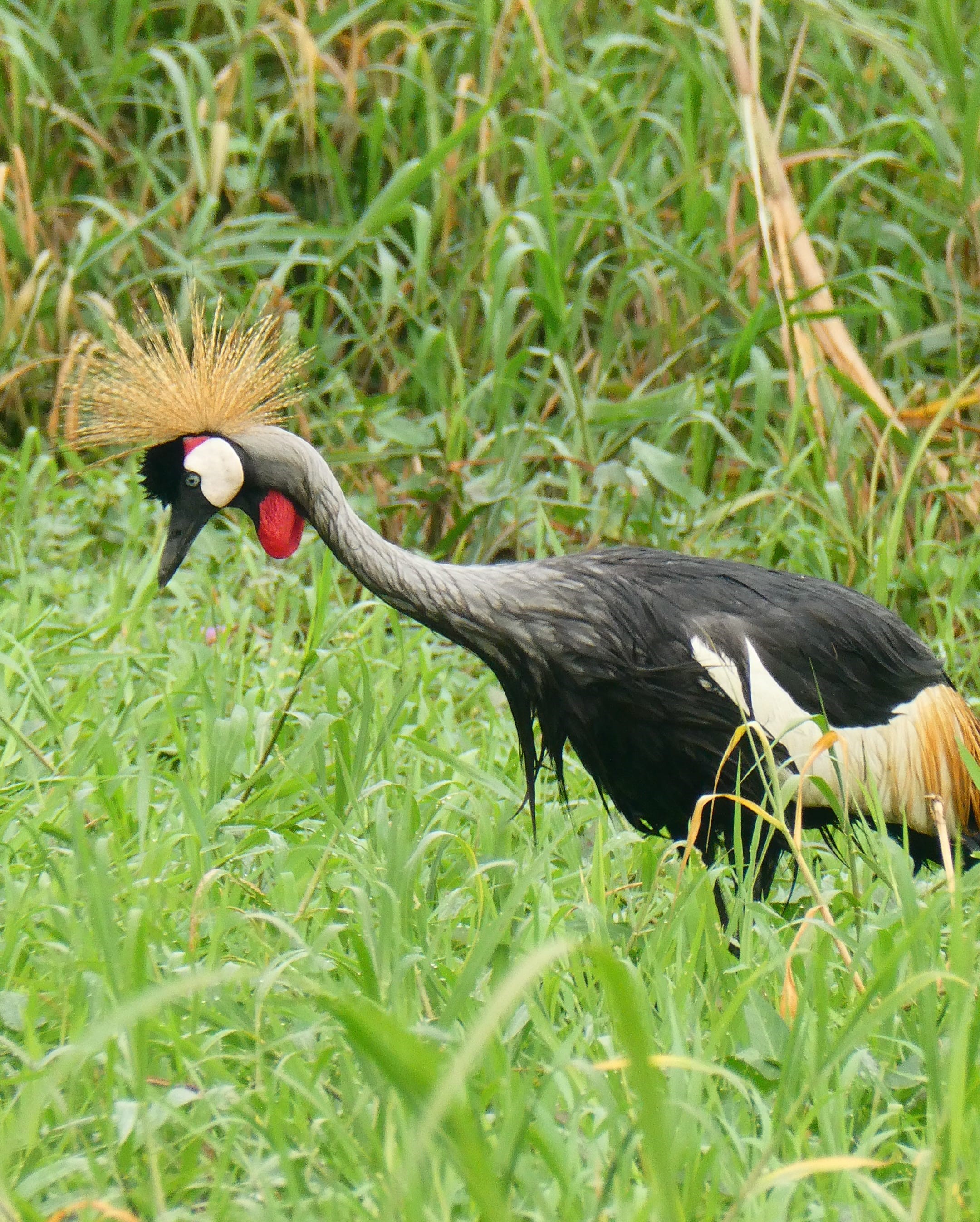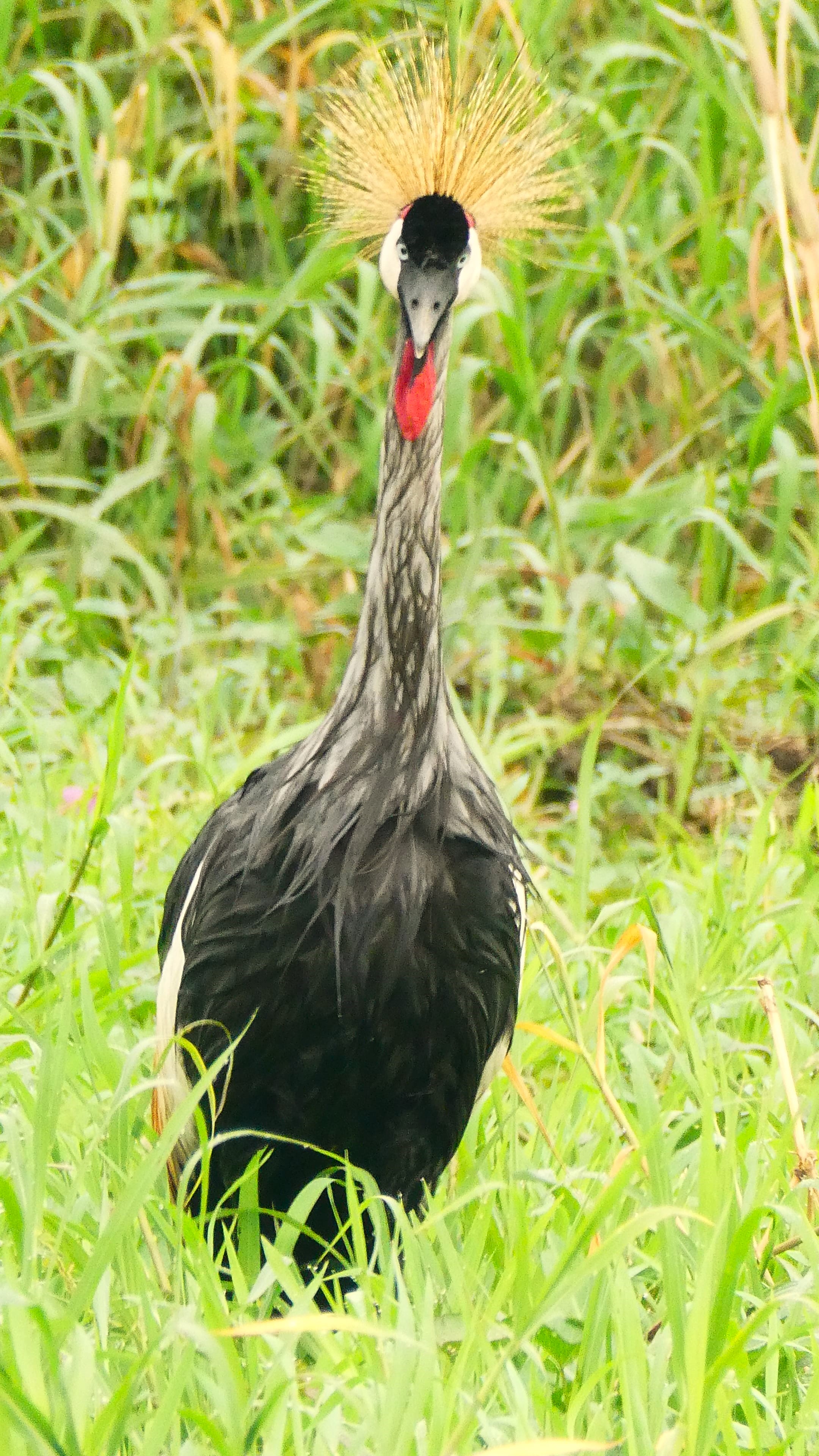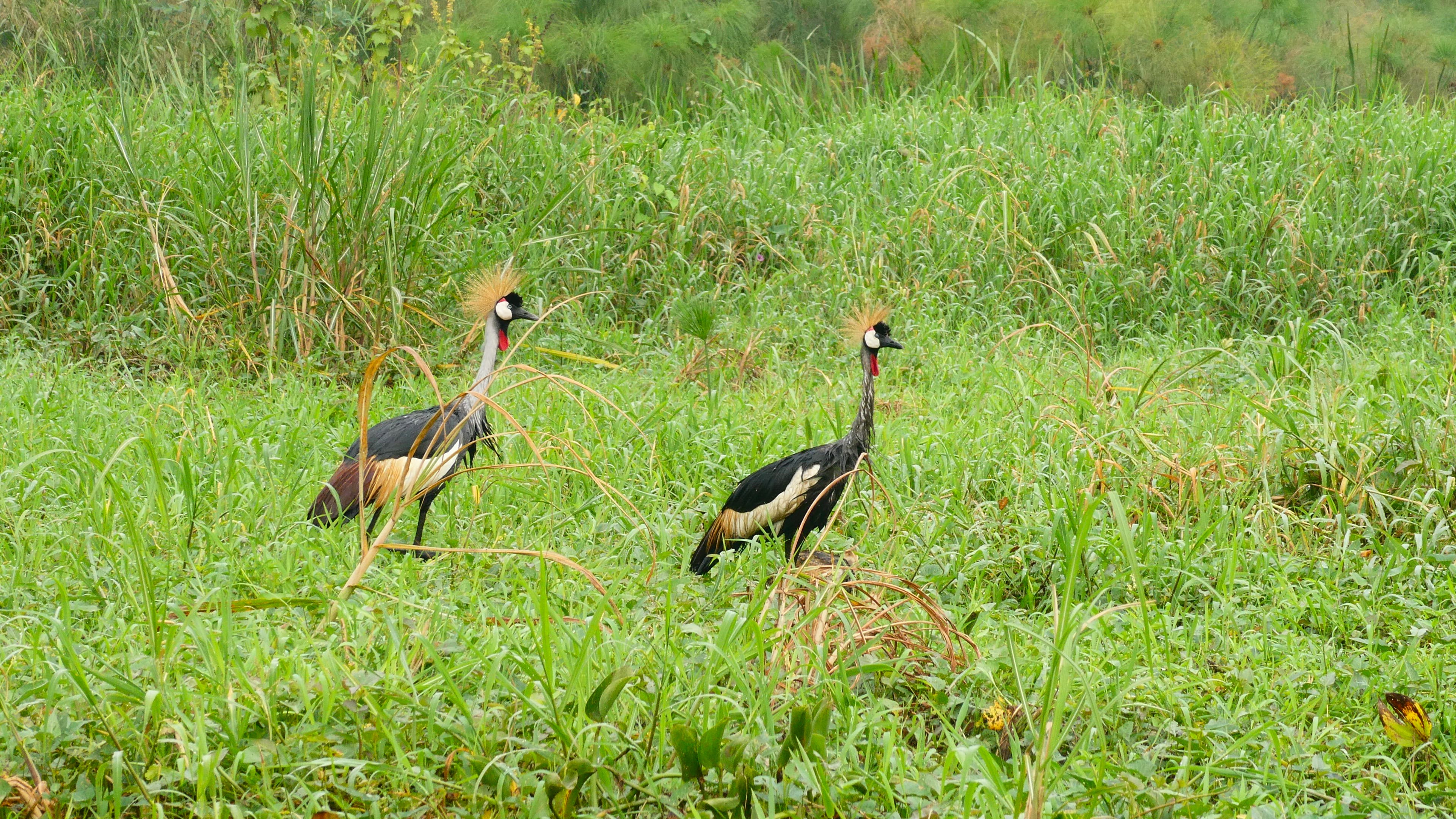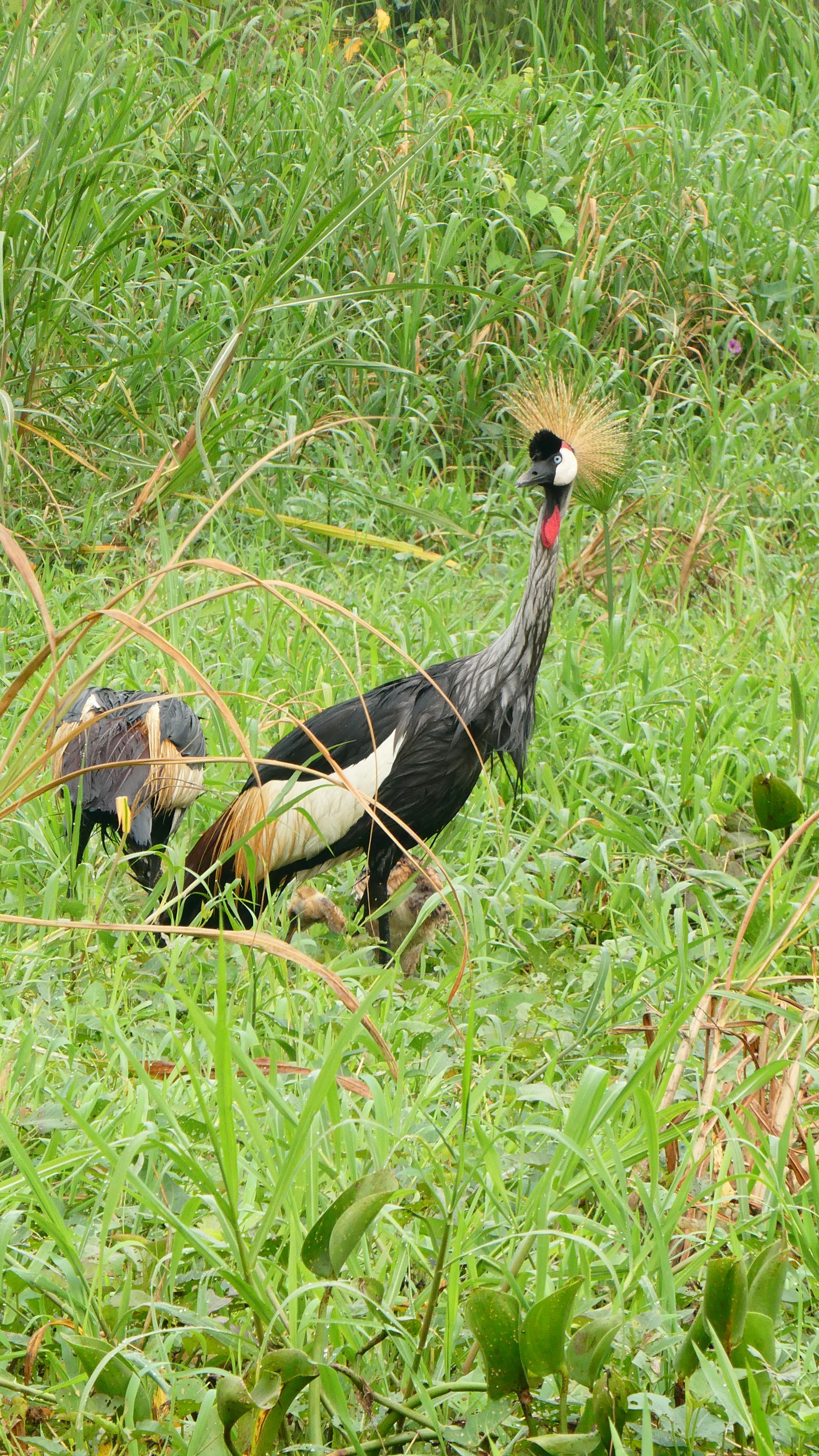 Der Grauhals-Kronenkranich (grey crowned crane) ist nicht nur schön anzuschauen, sondern auch das Wappentier auf der schwarz-gelb-roten Flagge Ugandas. Okay, unsere beiden Fotomodelle hier sehen mit ihrem nassen Gefieder noch ziemlich zerzaust aus.