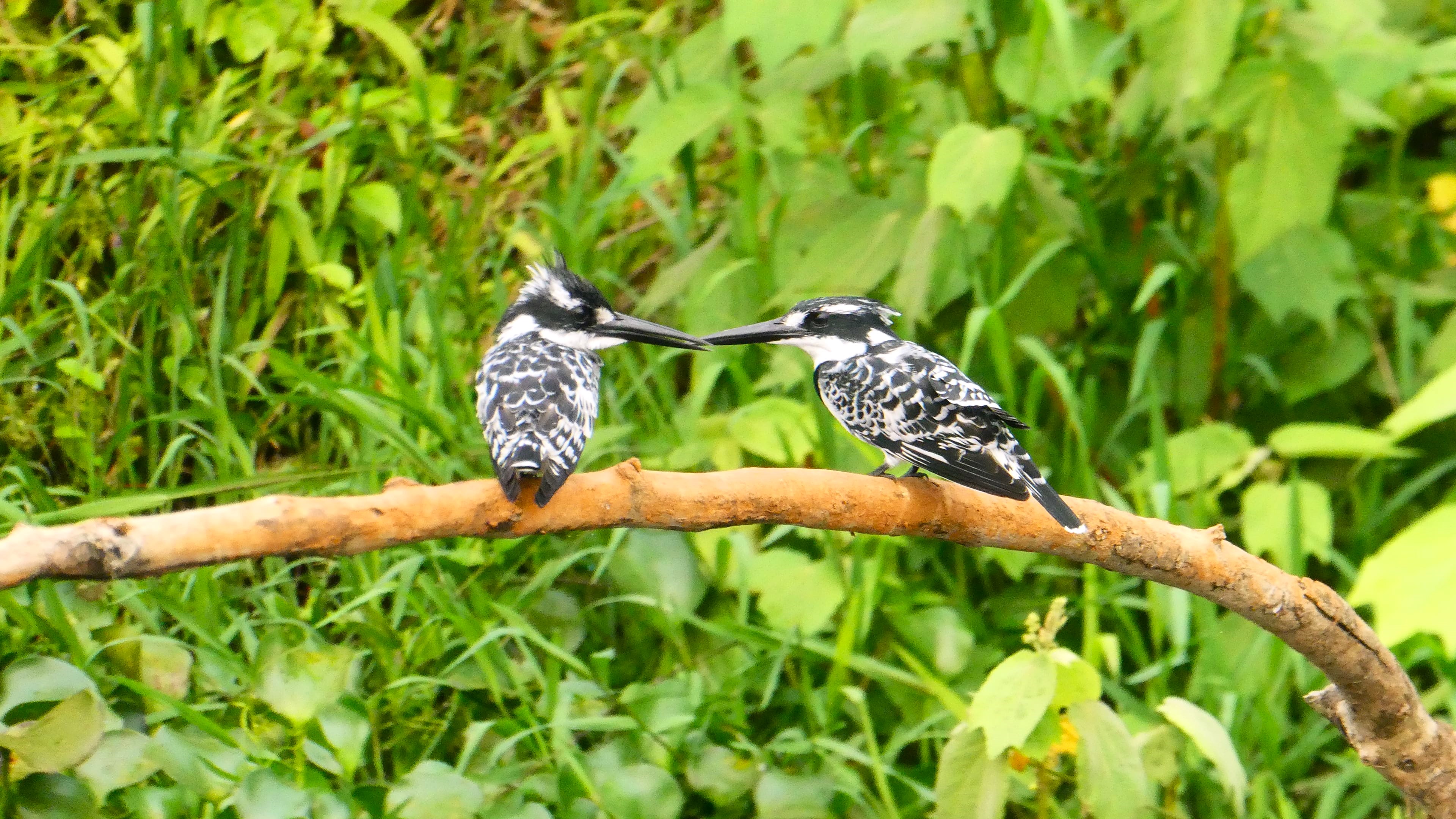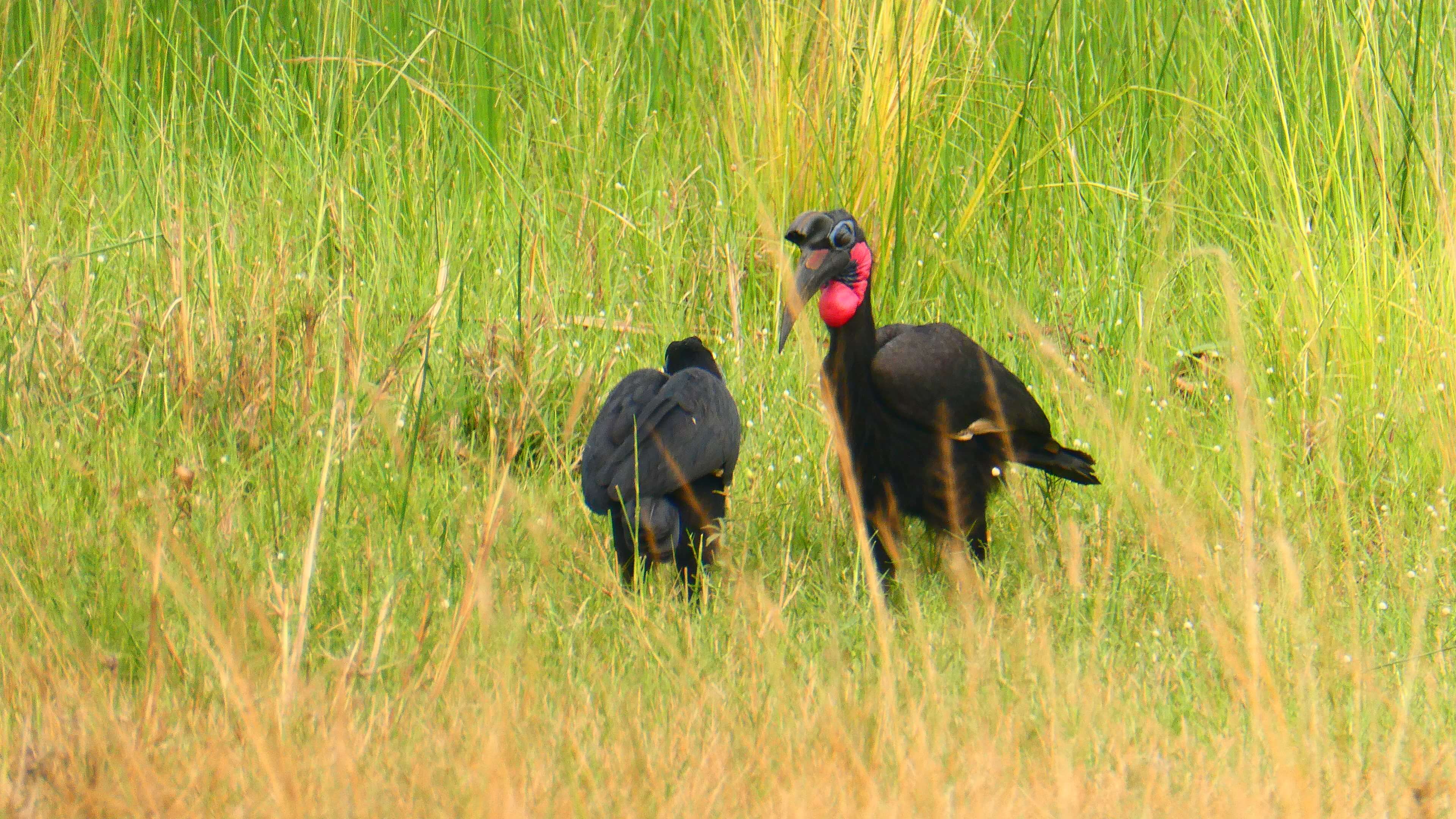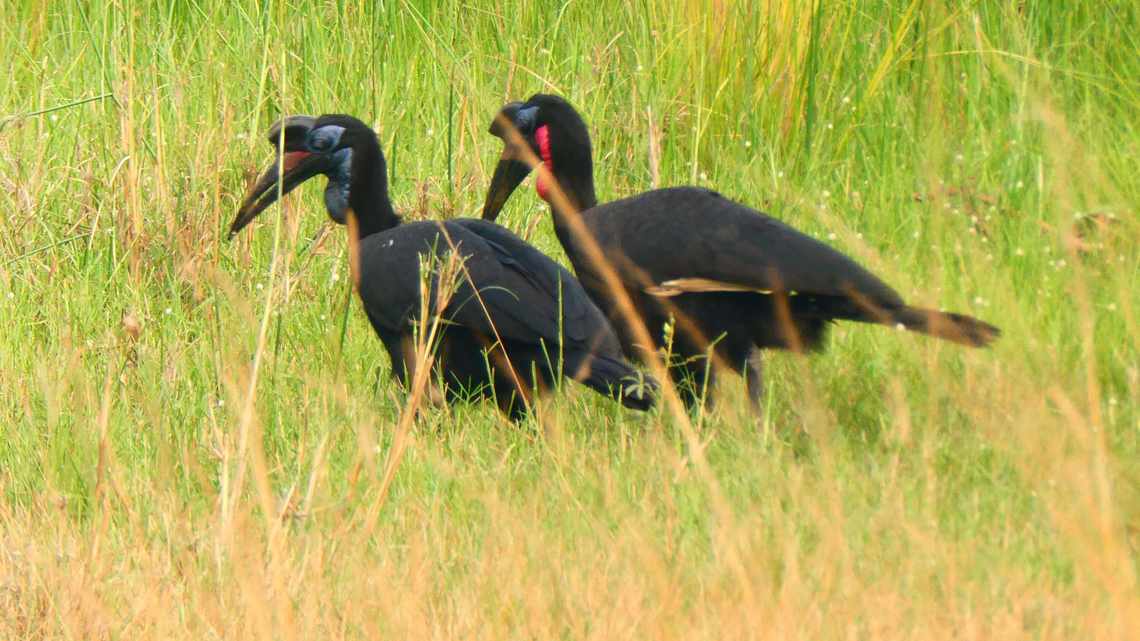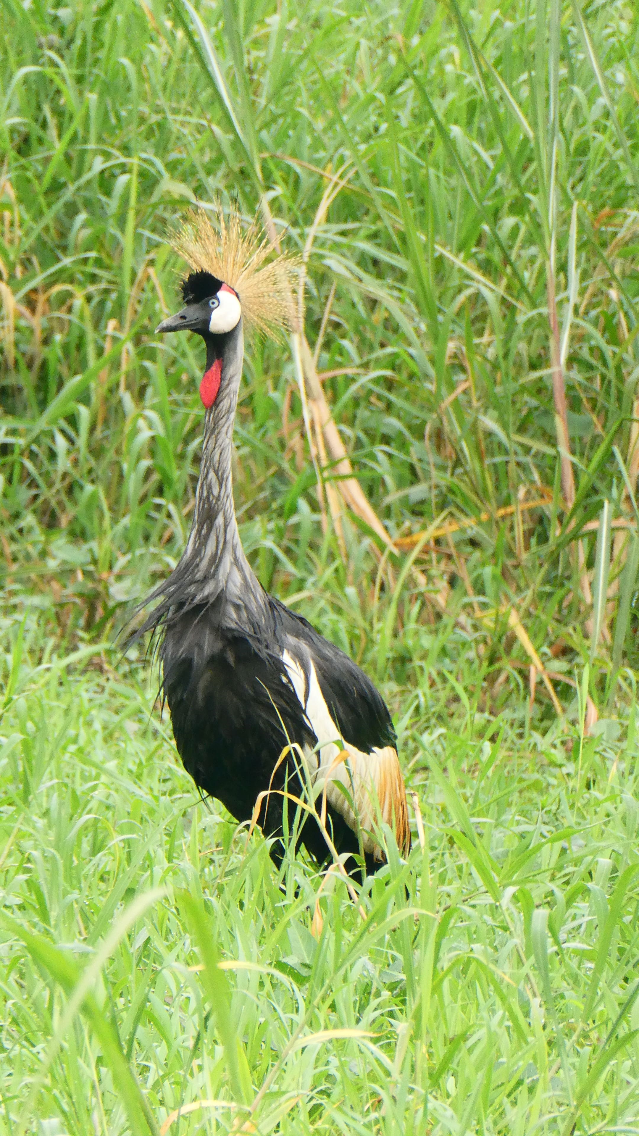 Der Grauhals-Kronenkranich (grey crowned crane) ist nicht nur schön anzuschauen, sondern auch das Wappentier auf der schwarz-gelb-roten Flagge Ugandas. Okay, unsere beiden Fotomodelle hier sehen mit ihrem nassen Gefieder noch ziemlich zerzaust aus.