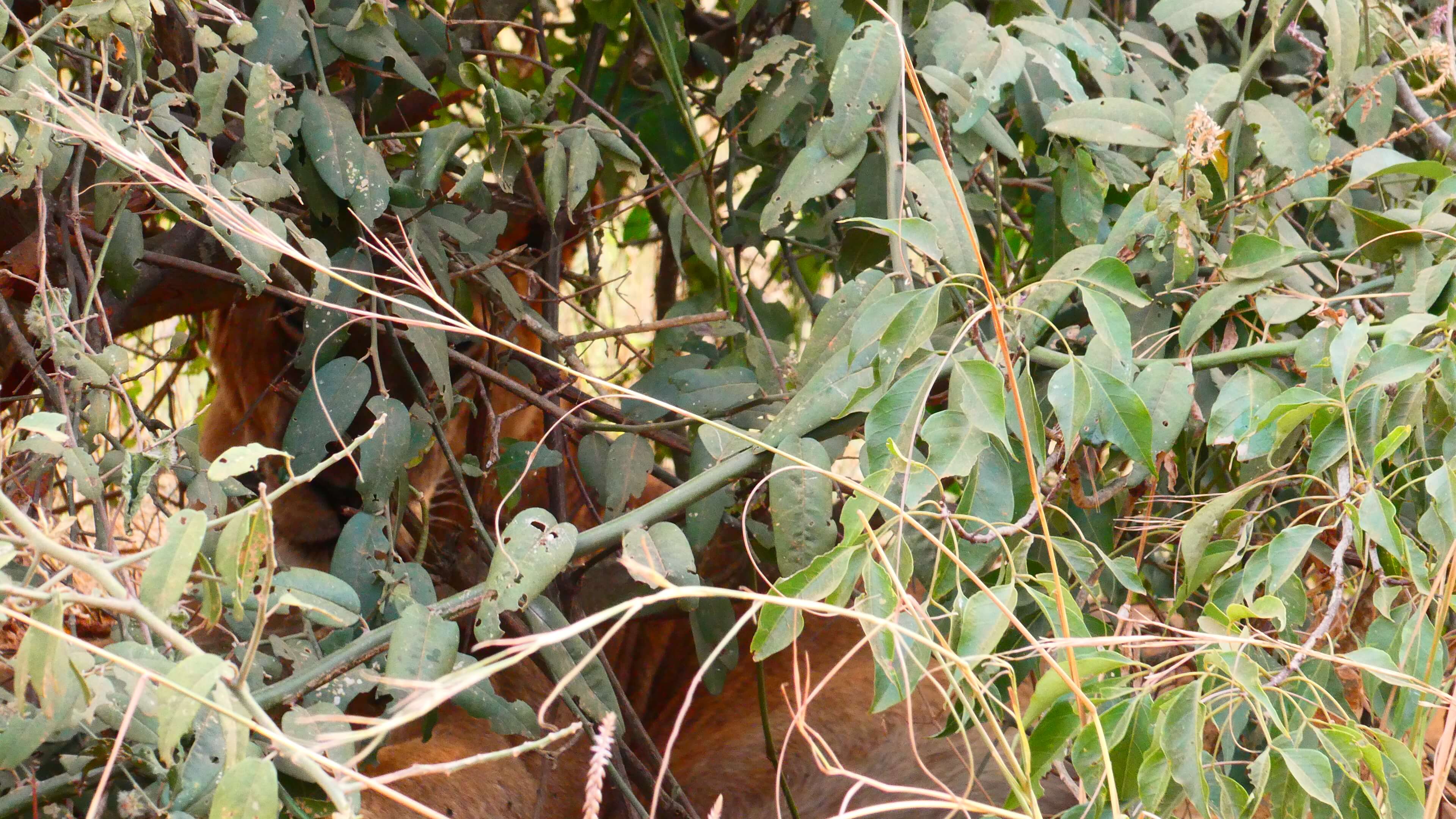 Von einem entgegenkommenden Jeep bekommen wir den Tipp, dass eine Löwin in einem Gebüsch direkt neben dem Track versteckt ist. Unglaublich, nahezu unsichtbar, obwohl wir wirklich direkt davor stehen.