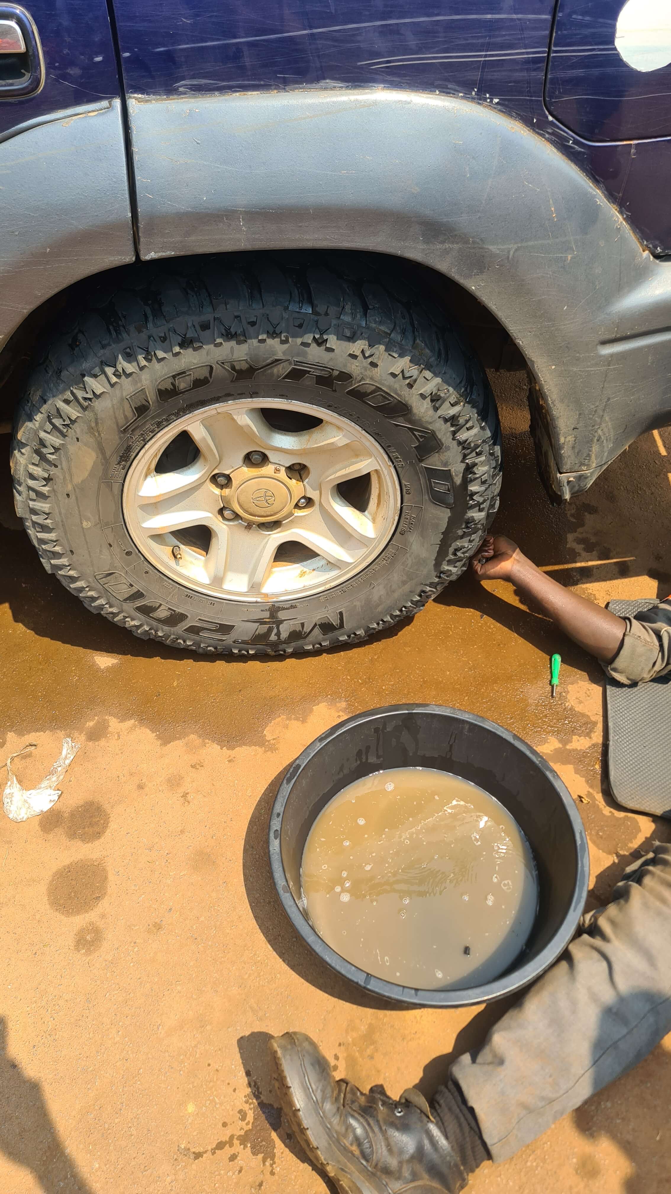 Nach drei erlebnisreichen Tagen im Murchison Falls National Park steuern wir in Masindi zuerst wieder die Shell Tankstelle an. Für 342.000 UGX (88 $) laufen 64 Liter in unseren Tank. Ach ja, unser linker, hinterer Reifen ist etwas schlapp und bräuchte Luft. Der Servicemitarbeiter ist von der ganz schnellen Sorte, diagnostiziert in Windeseile ein kleines Mini-Loch, das er Matthias auch sogleich mittels Wasserblubbern vorführt. Zack-zack, schon ist das Werkzeug zur Hand, er stößt damit brachial in den Reifen – Pfffffft … Oh mein Gott, ja, jetzt haben wir ein ansehnliches Loch!
