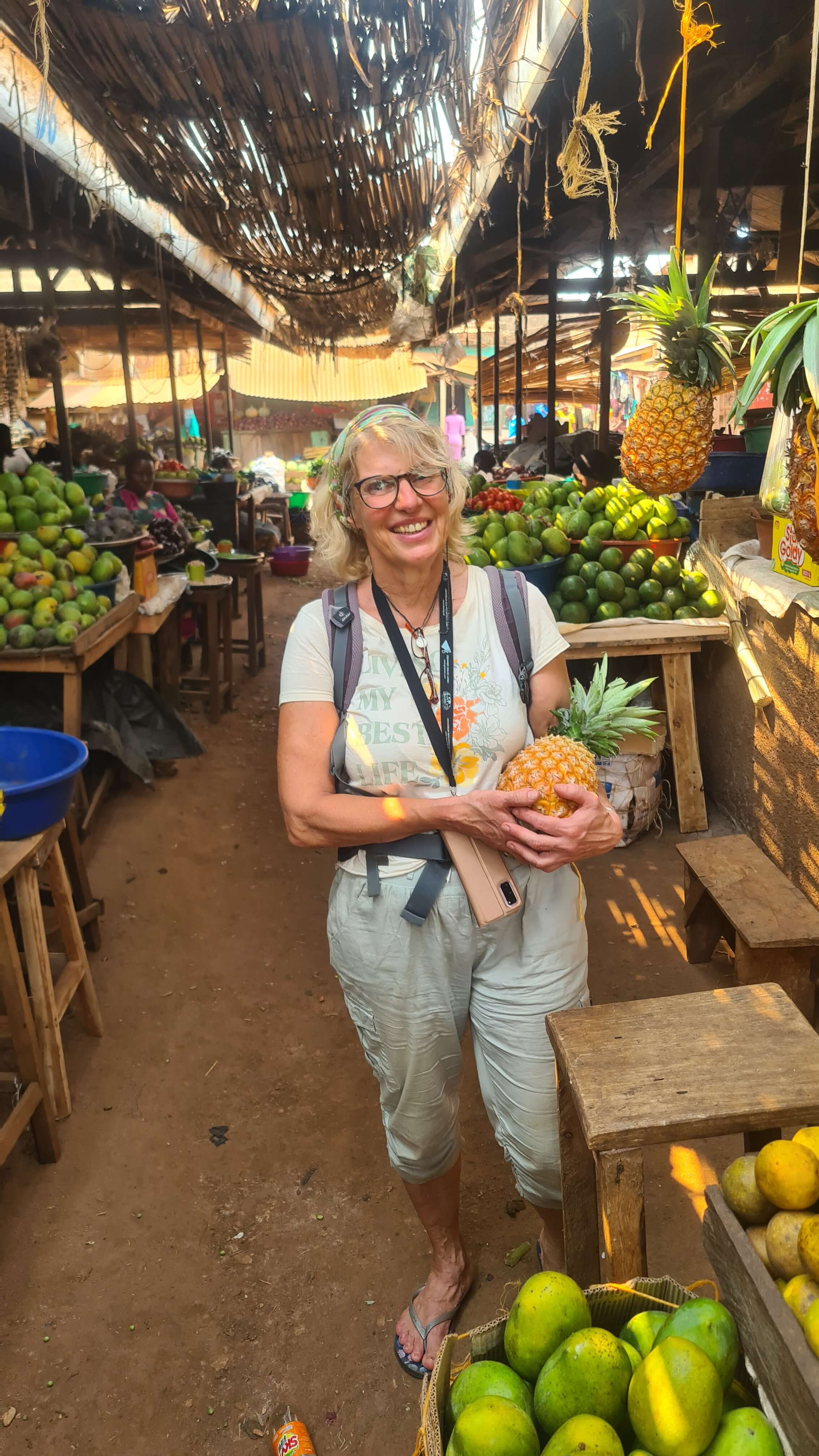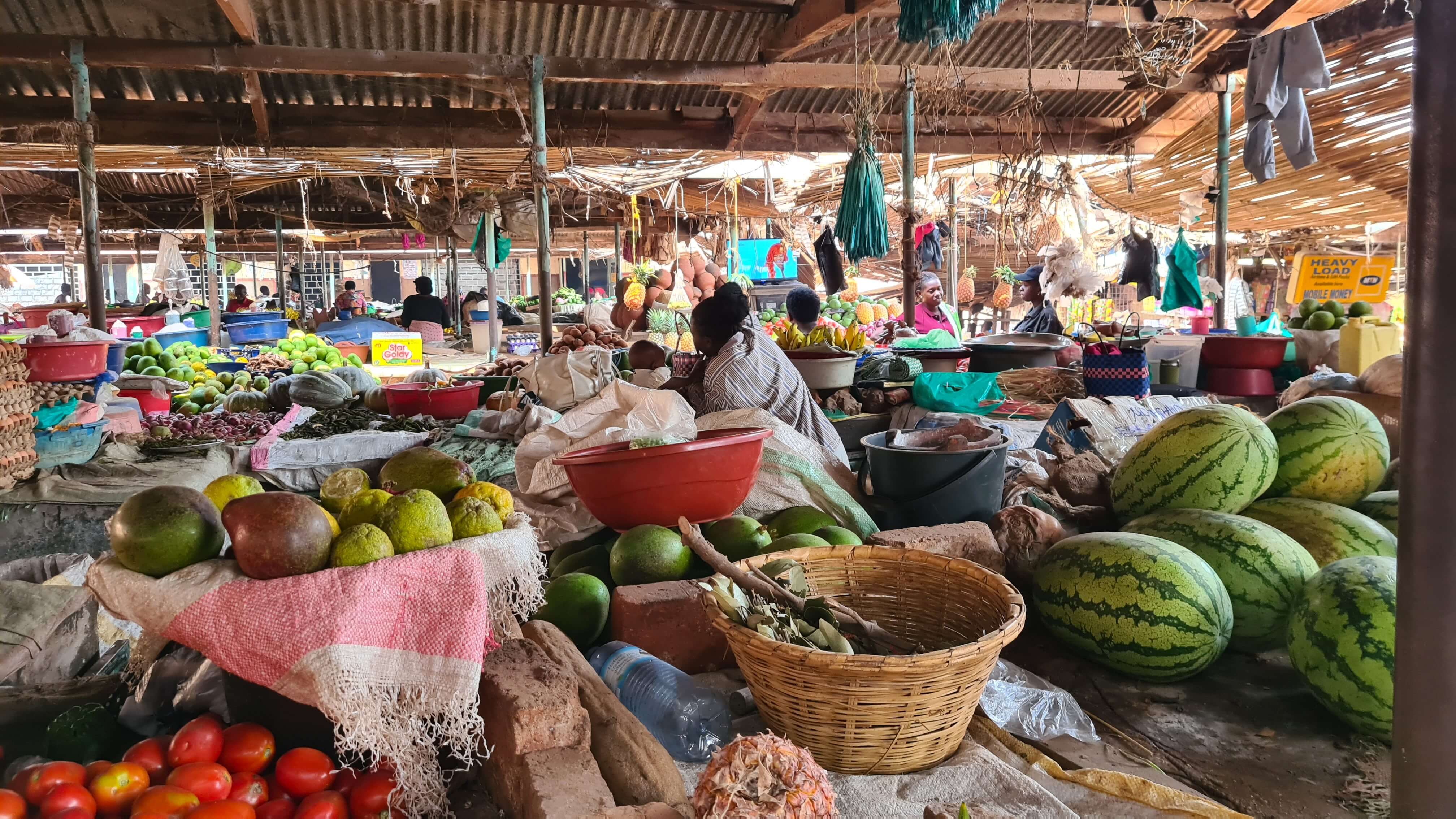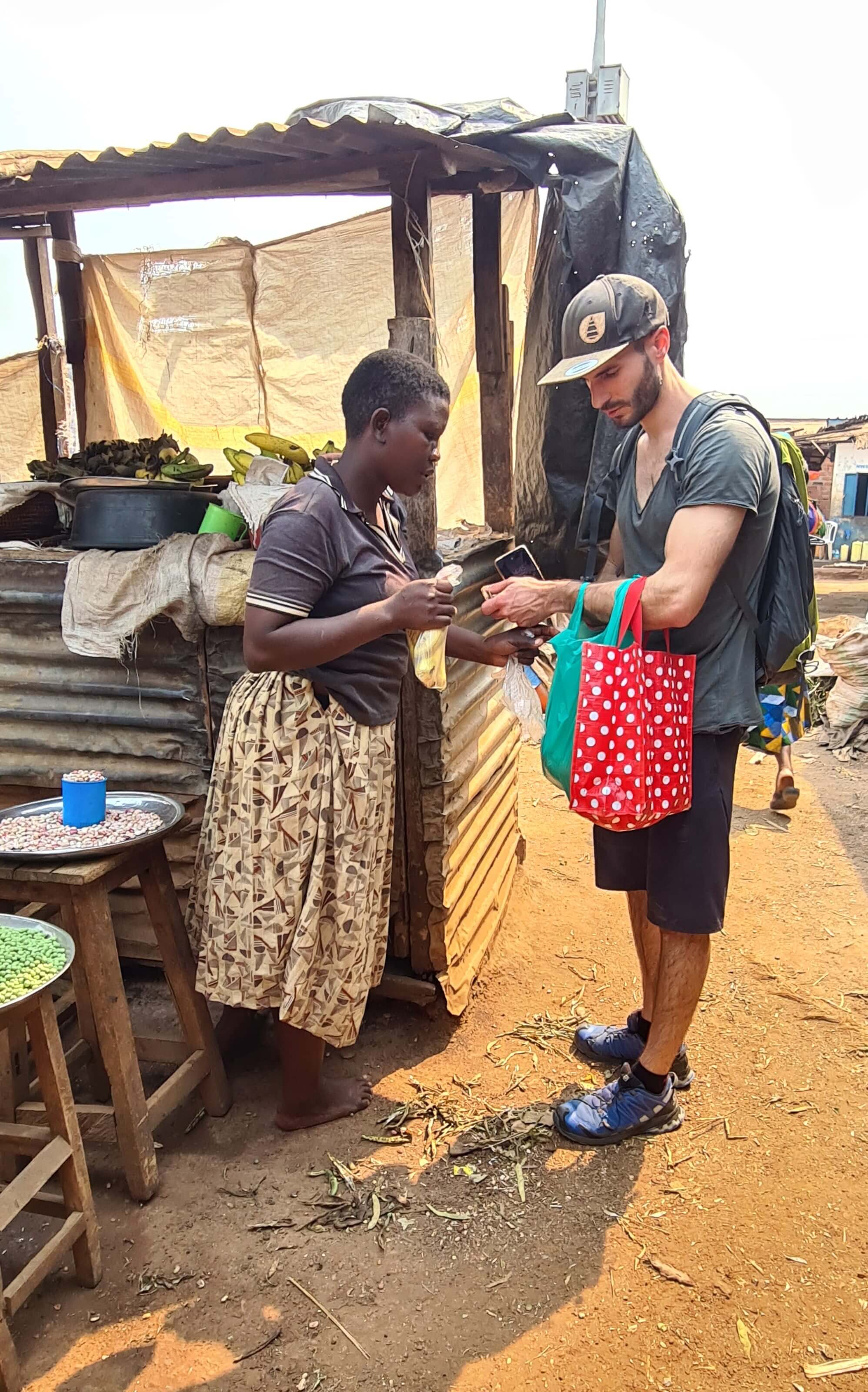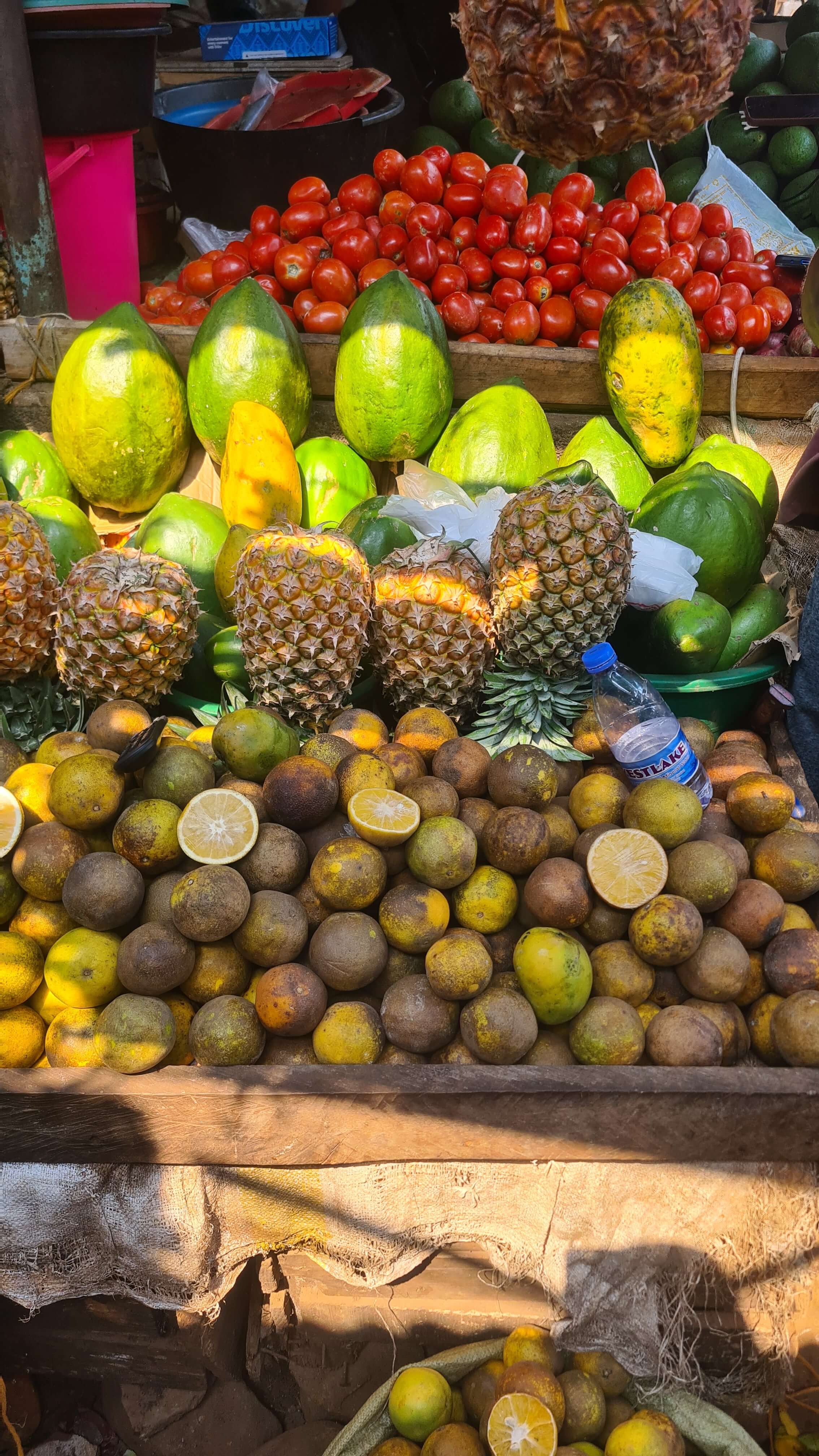 Den lokalen Markt müssen wir natürlich auch besuchen. Die Auslagen sind sehr spannend und die (Einkaufs-)Gespräche sehr lustig. Vermutlich lachen sich die Damen schlapp, weil sie uns so viel Geld für Obst und Gemüse aus der Tasche ziehen. Man kauft in Uganda nicht nach Anzahl oder Kilogramm, sondern immer nach einem Geldbetrag: also Tomaten und Paprika für 500 UGX, Bananen für 1000 UGX usw.