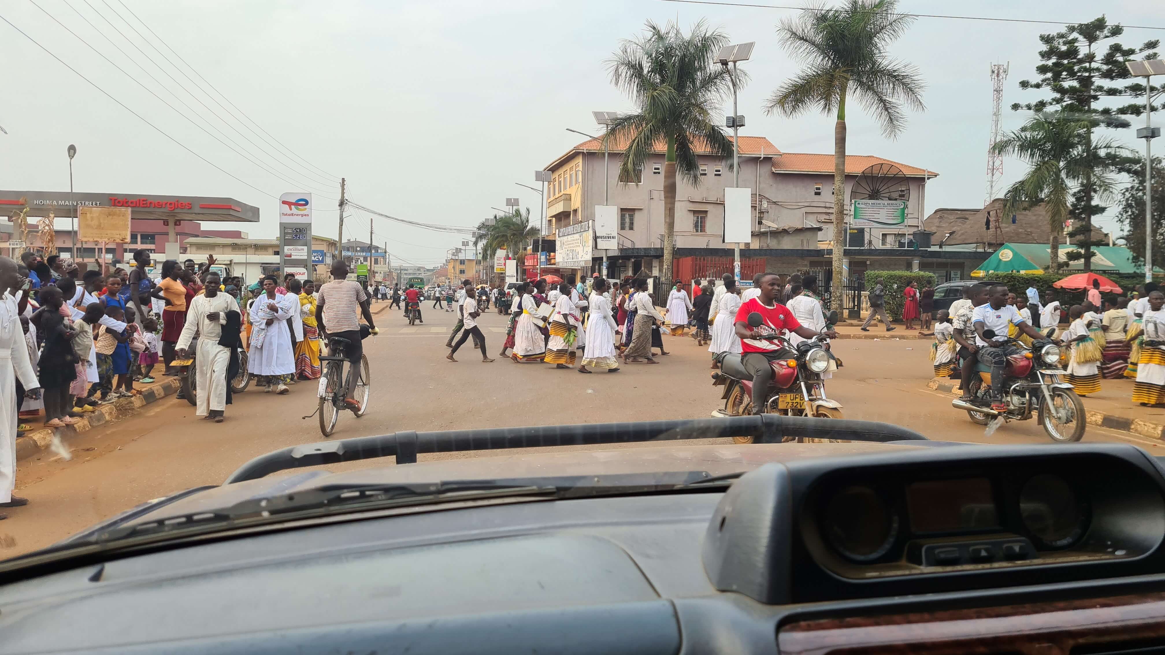 Dafür gibt es aber links und rechts der Straße das „real Ugandan life“ zu sehen. Spannend, anders, oft schmutzig, armseelig, dann aber auch wieder bunt und voller Lebensfreude. Die strömt insbesondere an den Sonntagen aus allen Kirchen und Gemeindeunterkünften in Form von Musik, Gesängen und farbenfroh gekleideten Menschen. Attraktive Frauen in aufwändigen, selbst genähten Kleidern (Frauen und Mädchen tragen übrigens IMMER Rock oder Kleid), Kinder im „Prinzessinnengewand“, die Herren im Anzug oder mit strahlend weißem Oberhemd. Angesichts des Staubes, Schmutzes und der beengten, einfachsten Wohnverhältnisse in Einraumwohnungen und Lehmhütten ist es für uns gar nicht nachvollziehbar, wie man derart adrett gestylt und stolz erhobenen Hauptes zur gemeinsamen Messe schreiten kann. Beeindruckend!