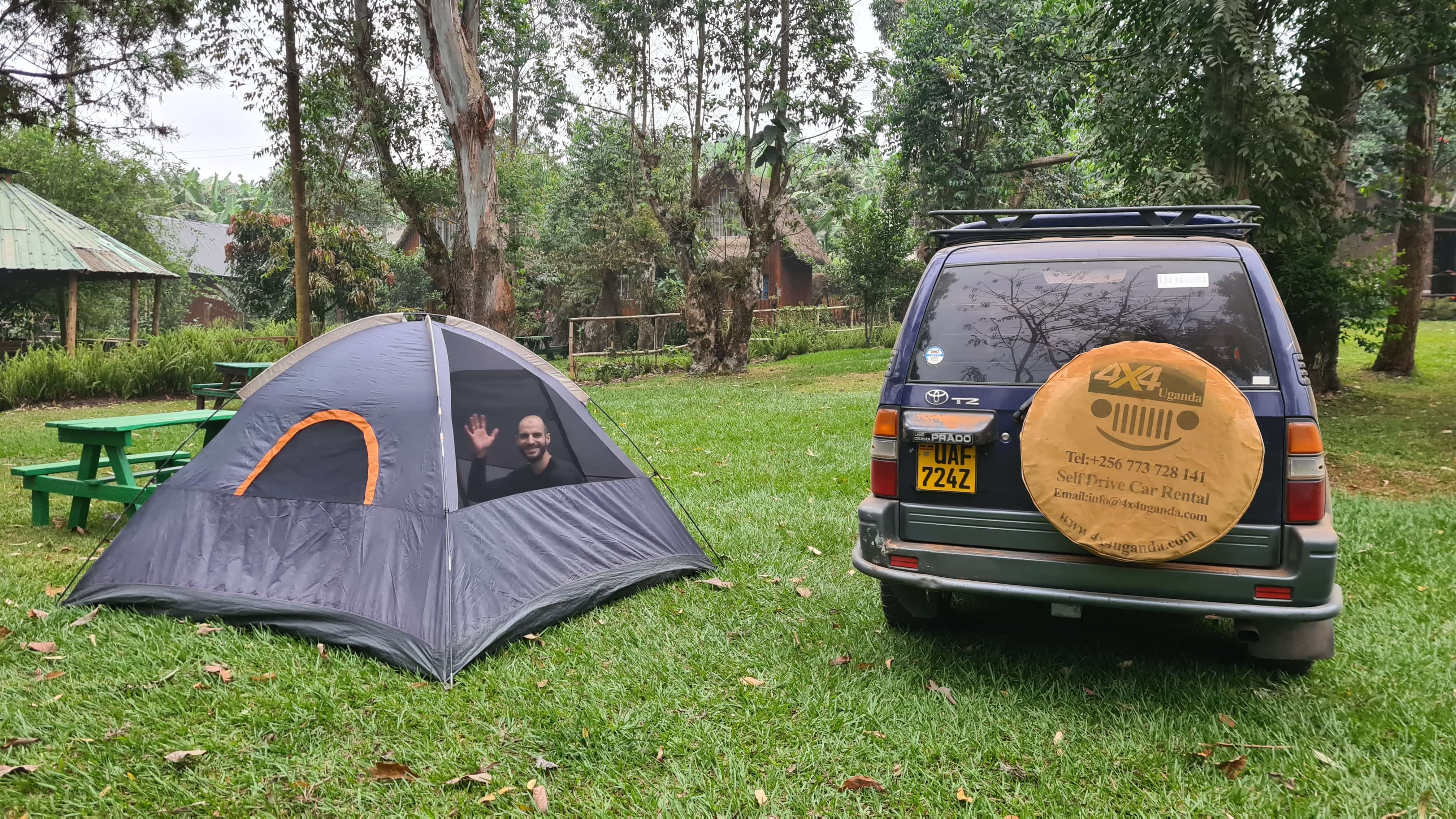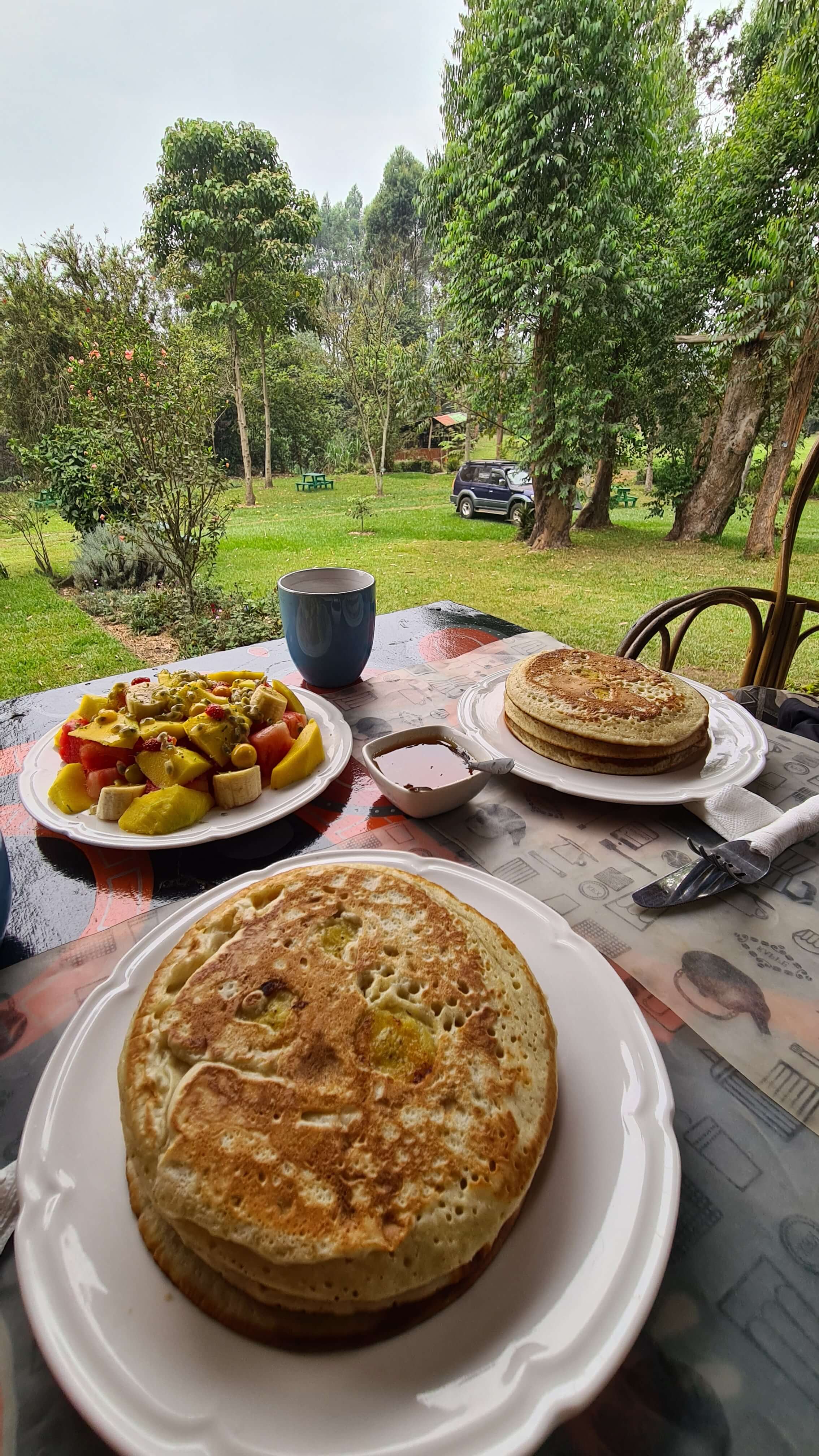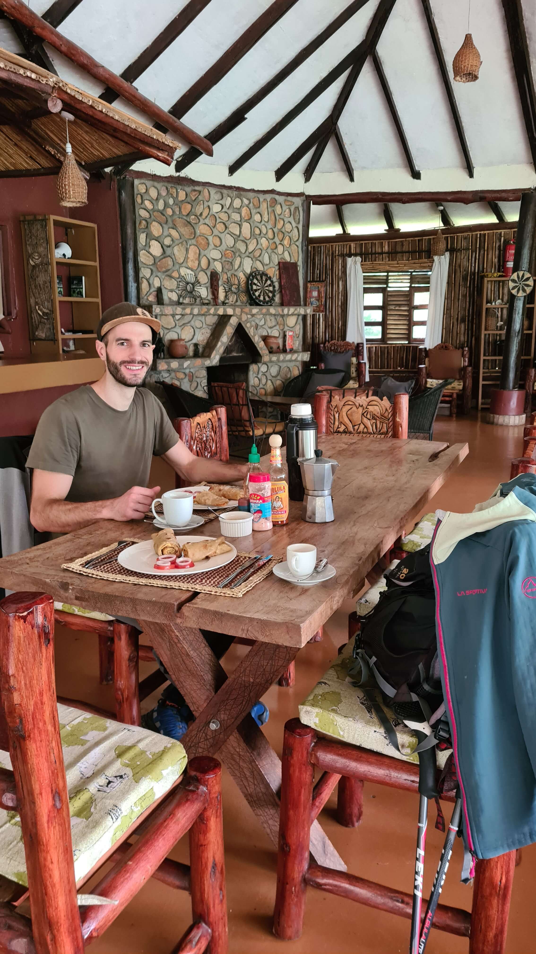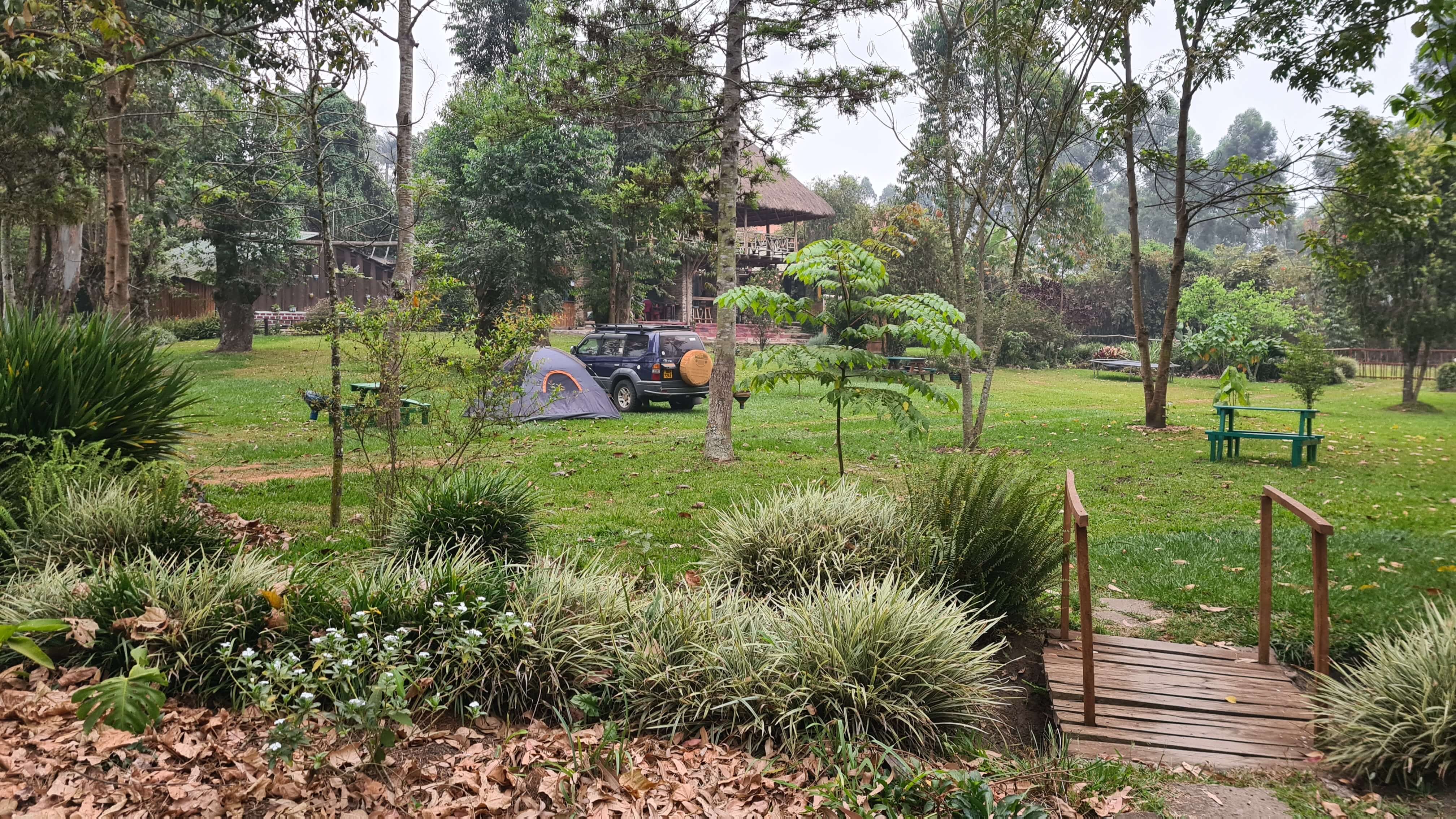 Morgens weckt uns bereits um 6 Uhr der Chorgesang des sonntäglichen Gottesdienstes aus Fort Portal. Geschlagene zwei Stunden grooven und singen die harmonischen Stimmen, dass es eine wahre Freude ist. Um 7 Uhr stimmen dann die Vögel am Campsite mit ein. Die kleine Anlage des Kalitusi Nature Resorts & Campsite ist wunderschön, mit eigenem Gemüsegarten, Hühnern und viel Freifläche zum Grillen und Chillen. Und eigentlich ohne wilde Tiere in der Nacht, aber einer der verspielten Hunde hat dann doch tatsächlich Matthias‘ Sportschuhe stibitzt und verschleppt – ganz in Pavian-Manier. Zum Glück haben wir sie gefunden, bevor er sie über Nacht zerlegen konnte.