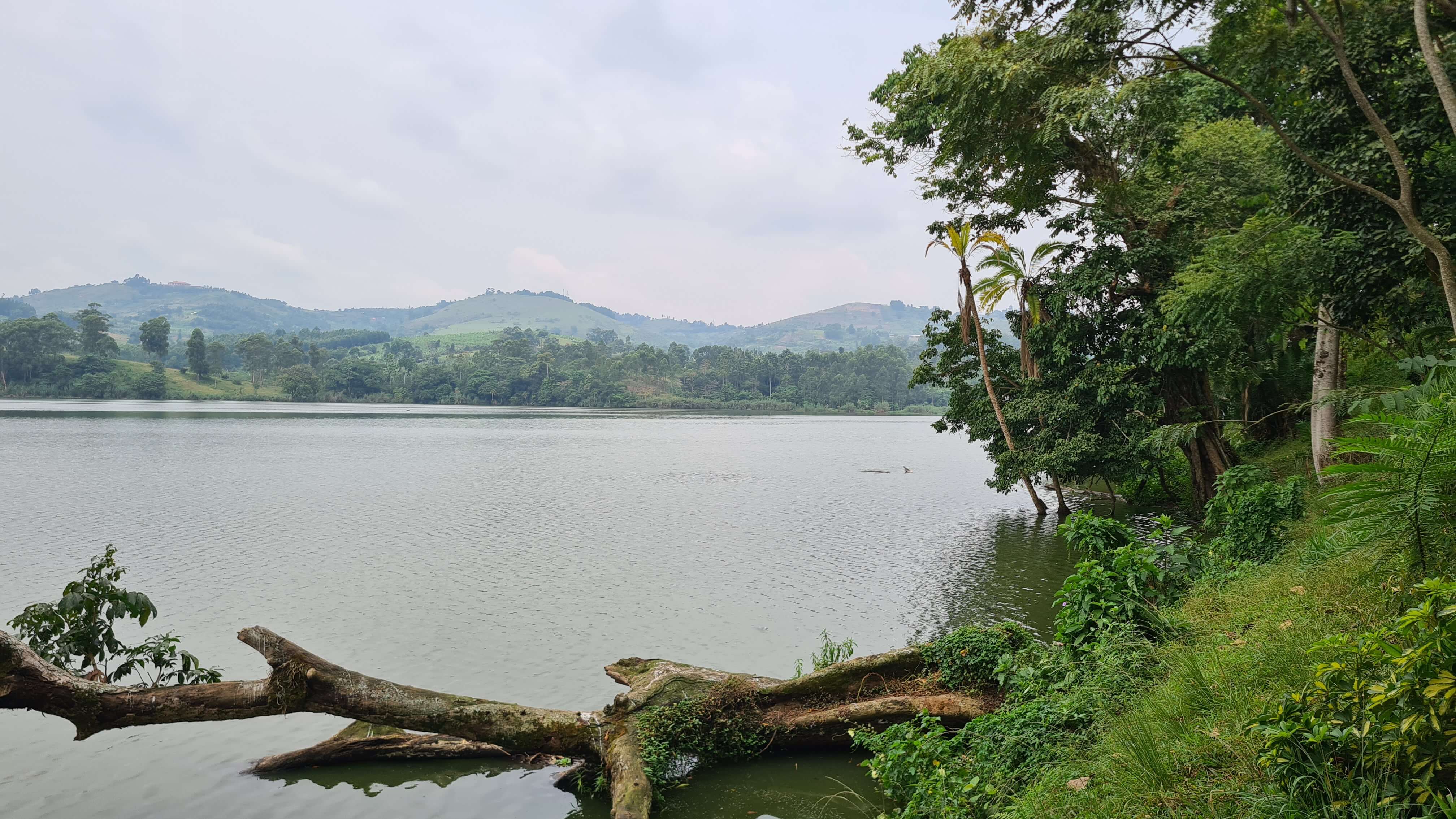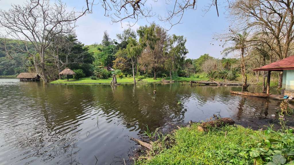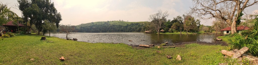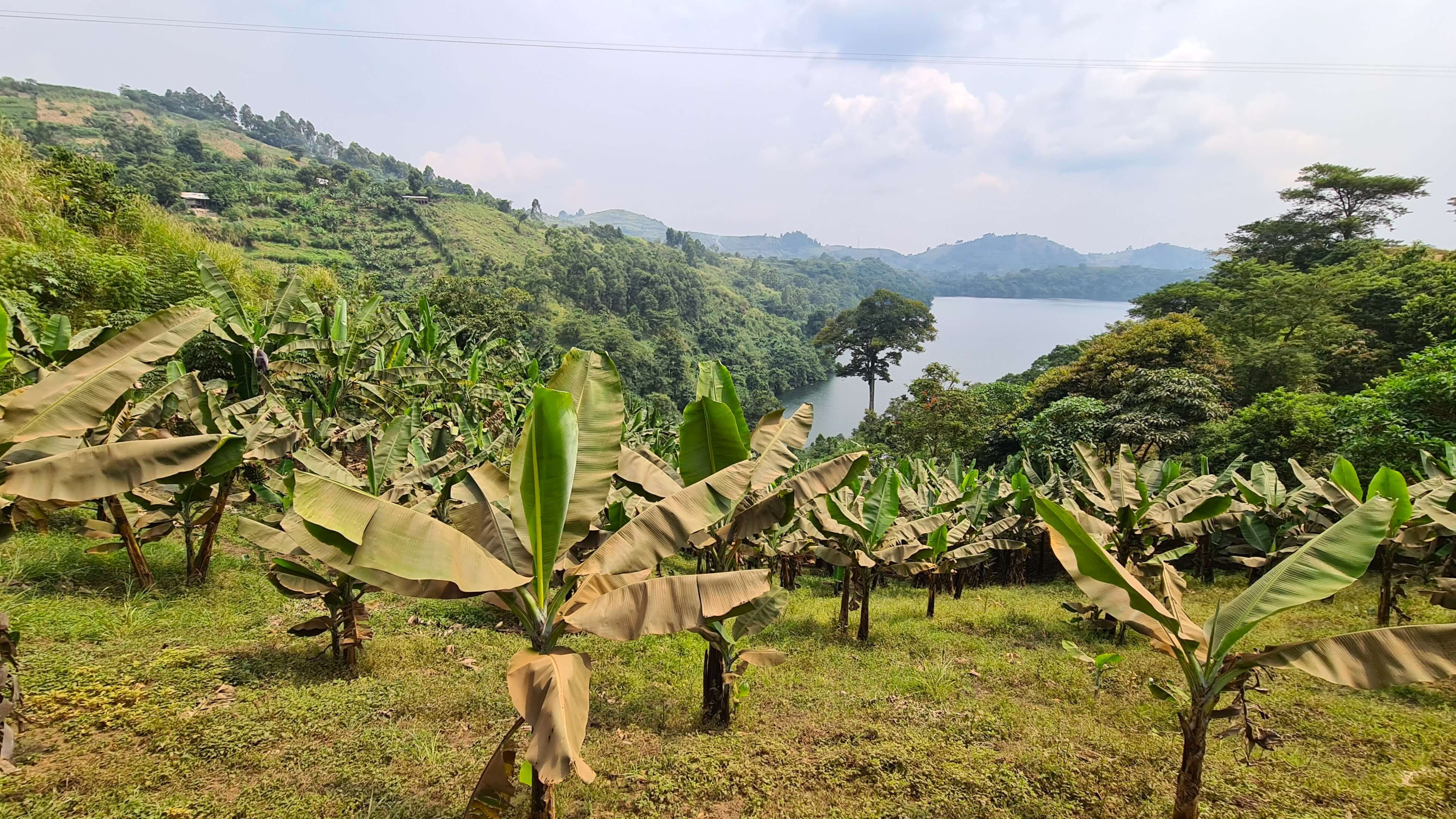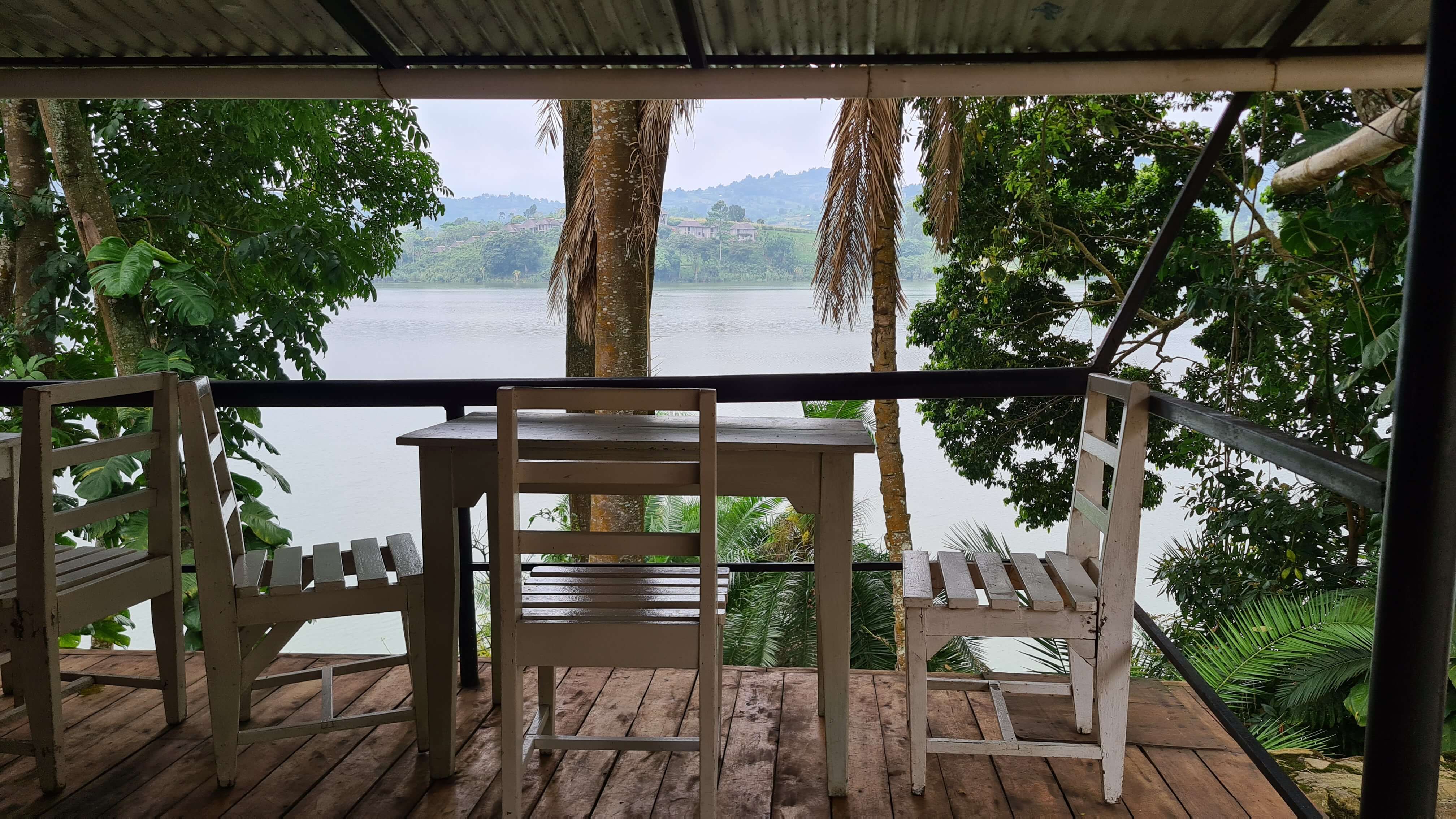 Zuerst geht es Richtung Kibale National Park, wo wir nahe Rweteera am Crater Lake Nyabikere einen ersten Stopp einlegen. Der Blick über den See soll vom CVK Lakeview Resort sehr schön sein und man könne dort auch einen Kaffee oder Tee trinken. Na, dann machen wir das doch. Die Anlage ist auch hier wie ausgestorben und sogleich werden wir als einzige Besucher fürsorglich willkommen geheißen. Ein Kaffee dauere allerdings 20 Minuten. Also gut, es ist das erste Mal, dass wir ugandischen Kaffee und Tee trinken … vielleicht ist das wie beim Pils-Zapfen: Gut Ding will Weile haben. Wir schlendern etwas umher, schauen einer Affenbande zu, die hier von Wipfel zu Wipfel tobt und bekommen schließlich unseren Kaffee und unseren Tee auf der Terrasse serviert. Das ist interessant: Der Kaffee besteht aus einer Thermoskanne heißem Wasser, einer Packung gemahlenem Kaffee und einer Tasse. Was für diese Zubereitung nun so lange Zeit beansprucht hat, entzieht sich unserem Vorstellungsvermögen. Doch wir nehmen es mit Humor. Matthias‘ Teeblätter aus Uganda schauen wiederum eher aus wie Granulat und beide haben wir beim Trinken ziemlich viele Feststoffe im Mund.