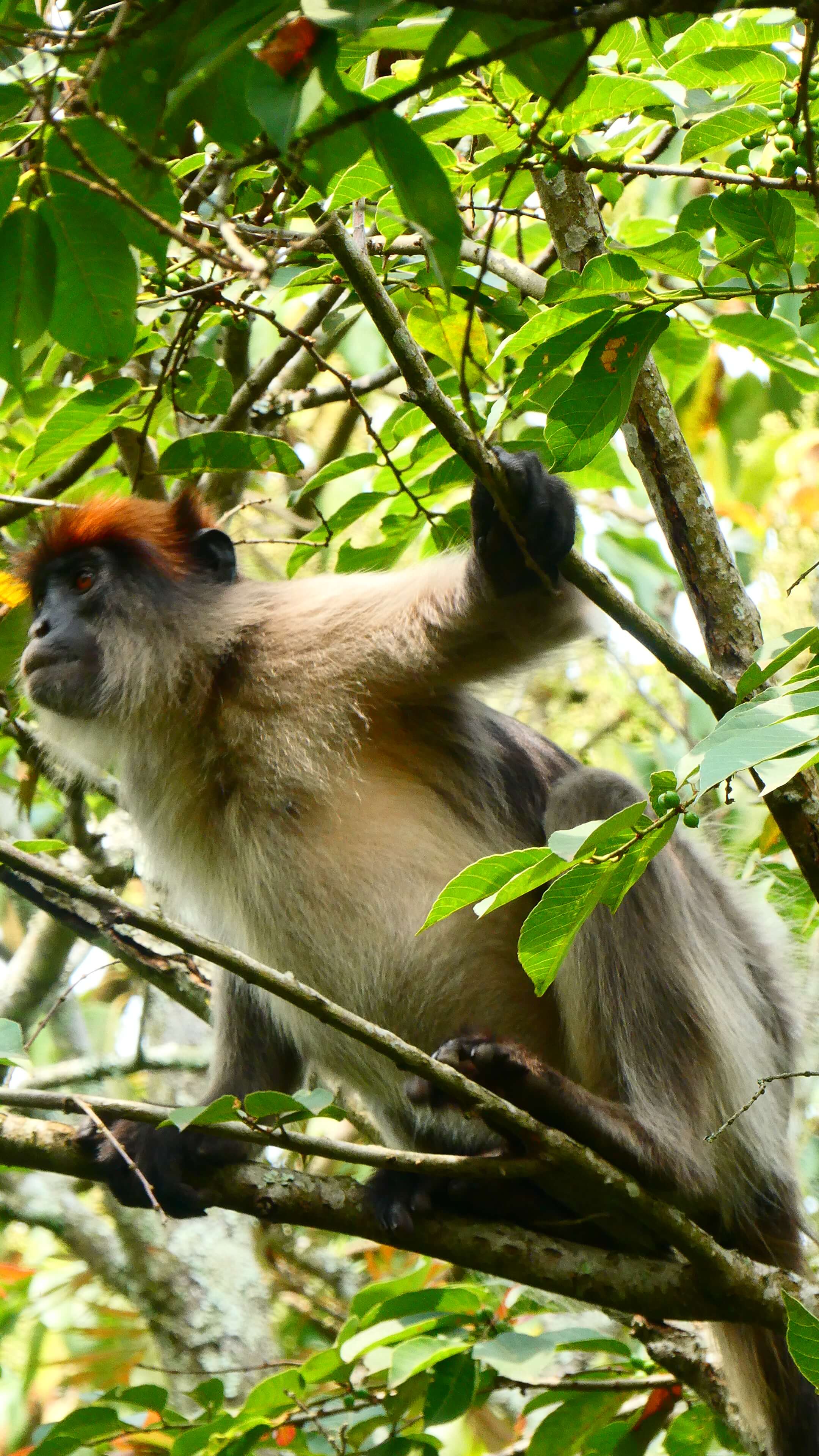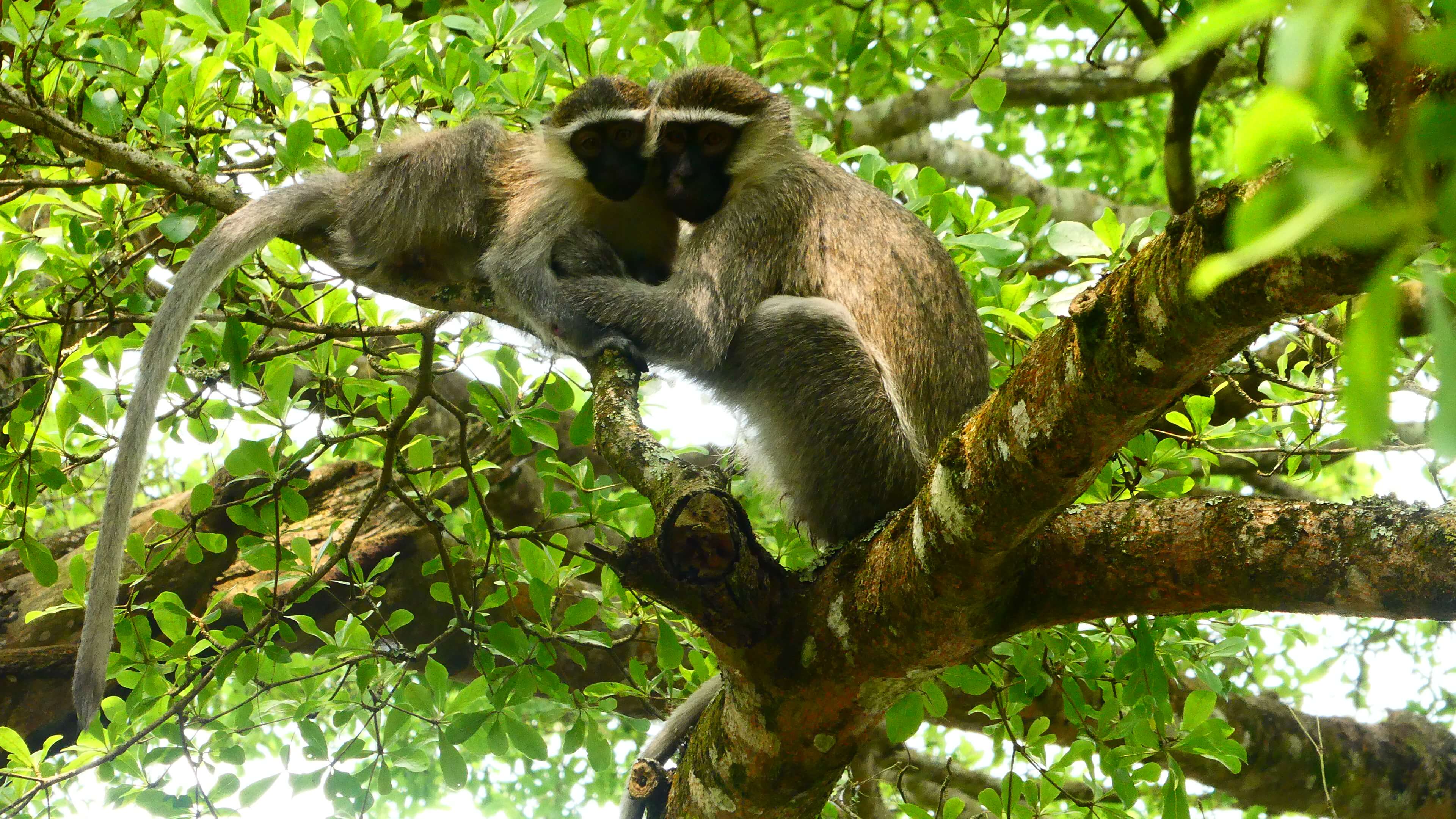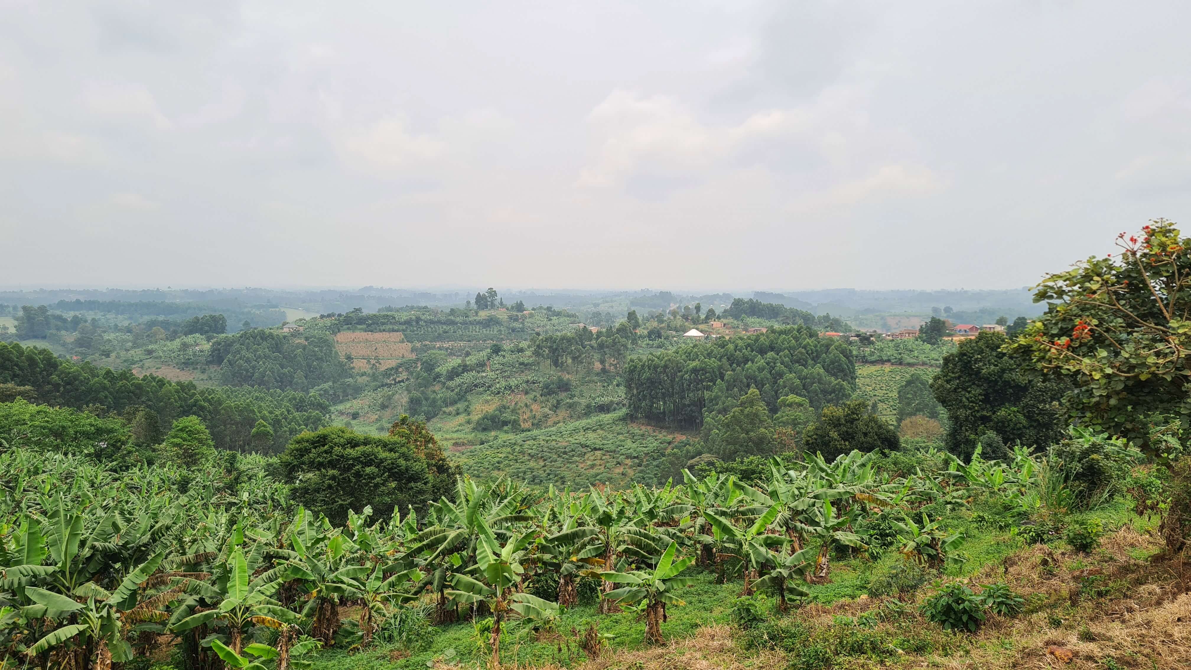 Zuerst geht es Richtung Kibale National Park, wo wir nahe Rweteera am Crater Lake Nyabikere einen ersten Stopp einlegen. Der Blick über den See soll vom CVK Lakeview Resort sehr schön sein und man könne dort auch einen Kaffee oder Tee trinken. Na, dann machen wir das doch. Die Anlage ist auch hier wie ausgestorben und sogleich werden wir als einzige Besucher fürsorglich willkommen geheißen. Ein Kaffee dauere allerdings 20 Minuten. Also gut, es ist das erste Mal, dass wir ugandischen Kaffee und Tee trinken … vielleicht ist das wie beim Pils-Zapfen: Gut Ding will Weile haben. Wir schlendern etwas umher, schauen einer Affenbande zu, die hier von Wipfel zu Wipfel tobt und bekommen schließlich unseren Kaffee und unseren Tee auf der Terrasse serviert. Das ist interessant: Der Kaffee besteht aus einer Thermoskanne heißem Wasser, einer Packung gemahlenem Kaffee und einer Tasse. Was für diese Zubereitung nun so lange Zeit beansprucht hat, entzieht sich unserem Vorstellungsvermögen. Doch wir nehmen es mit Humor. Matthias‘ Teeblätter aus Uganda schauen wiederum eher aus wie Granulat und beide haben wir beim Trinken ziemlich viele Feststoffe im Mund.