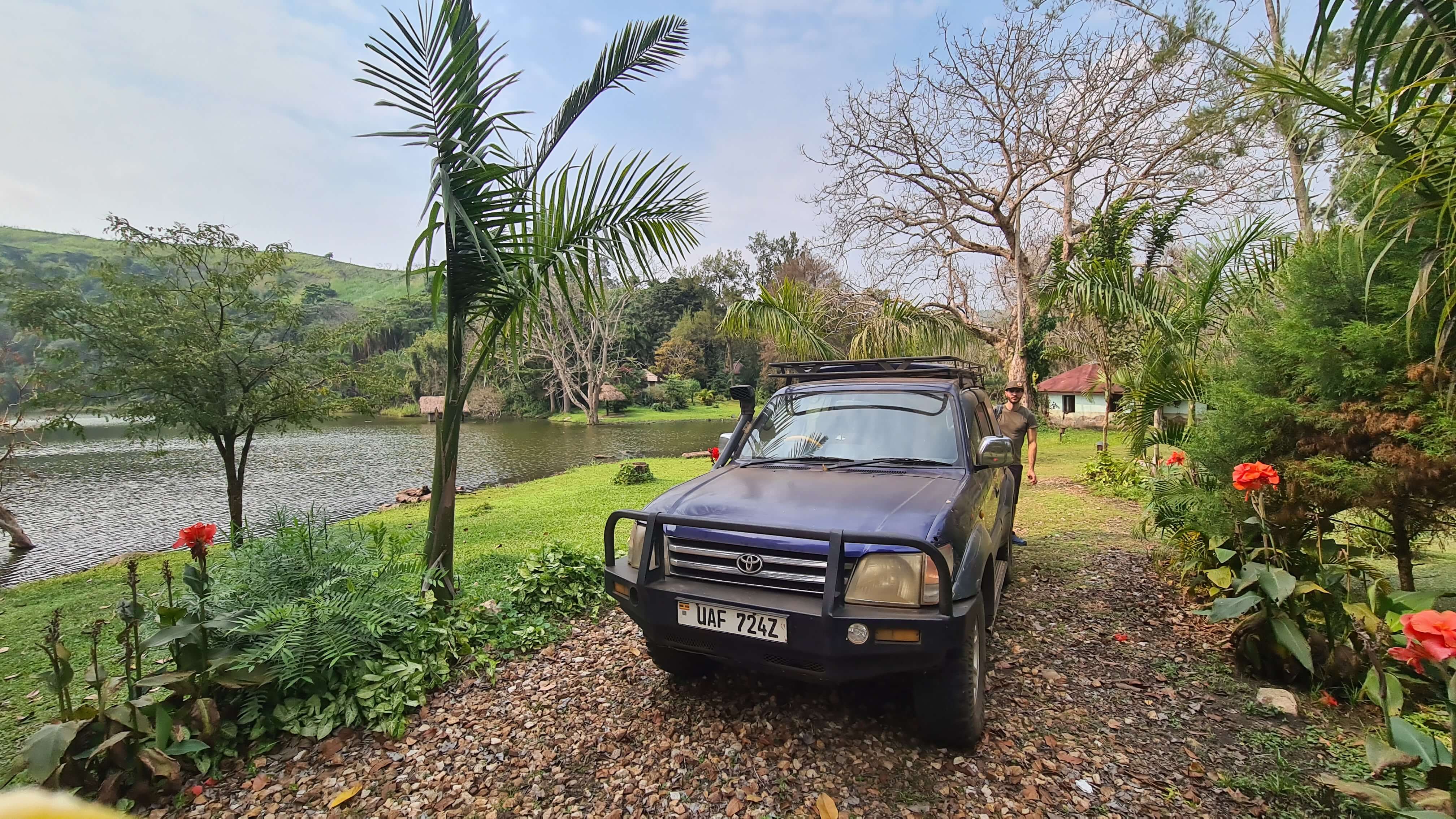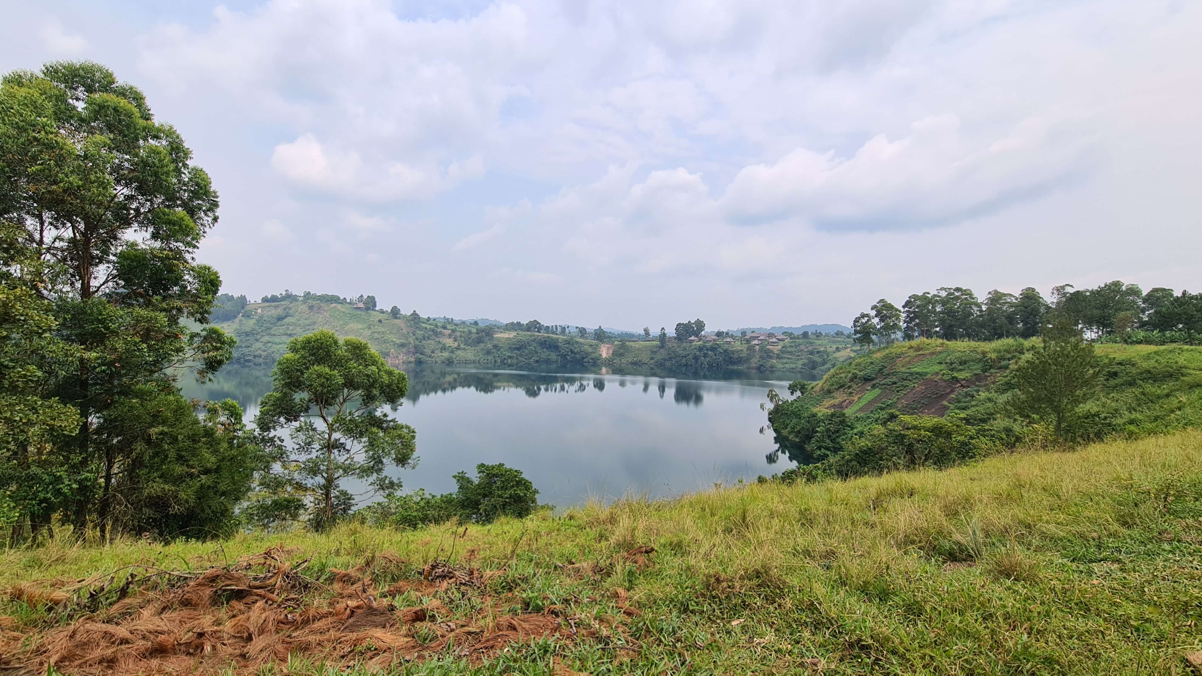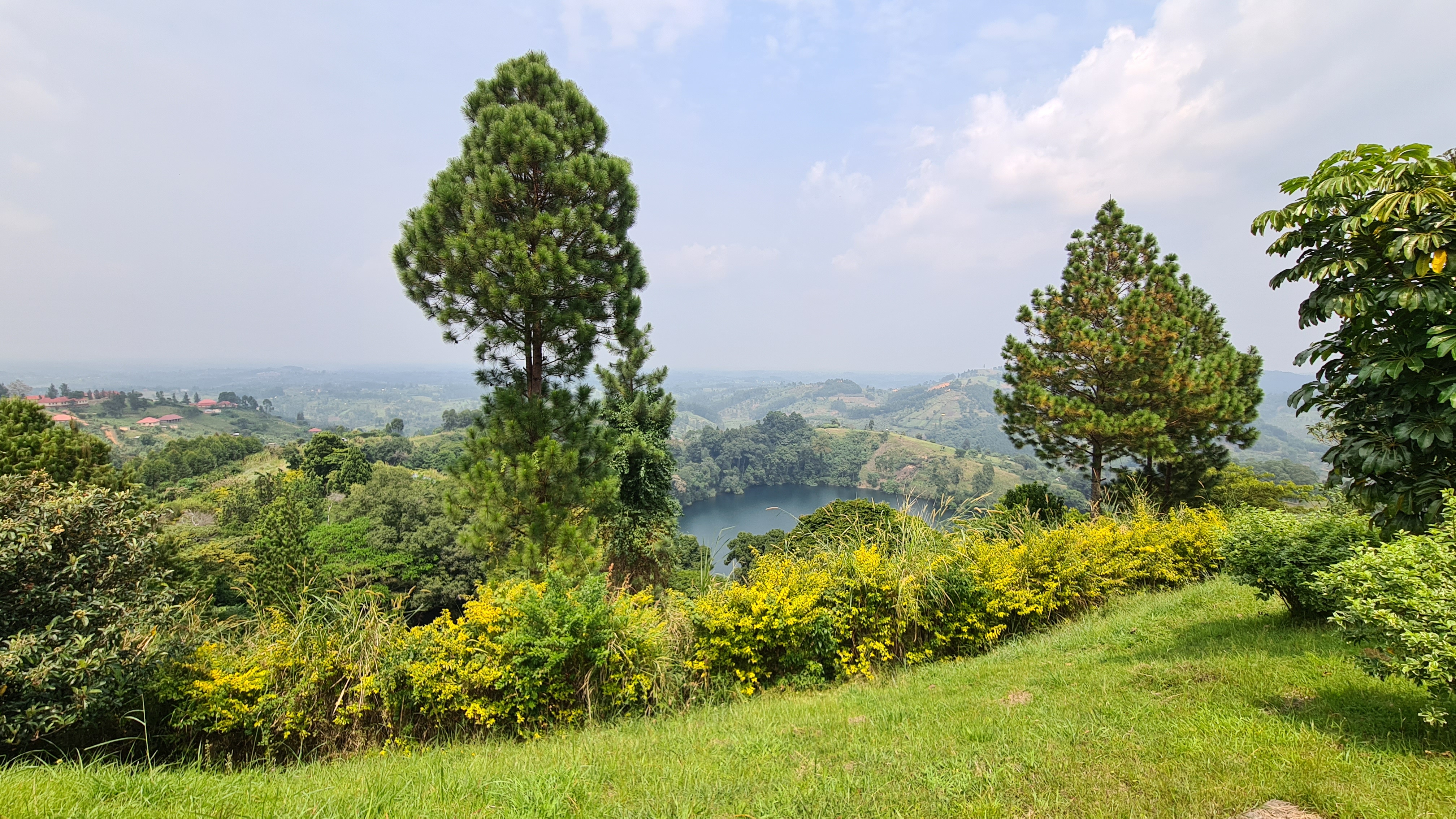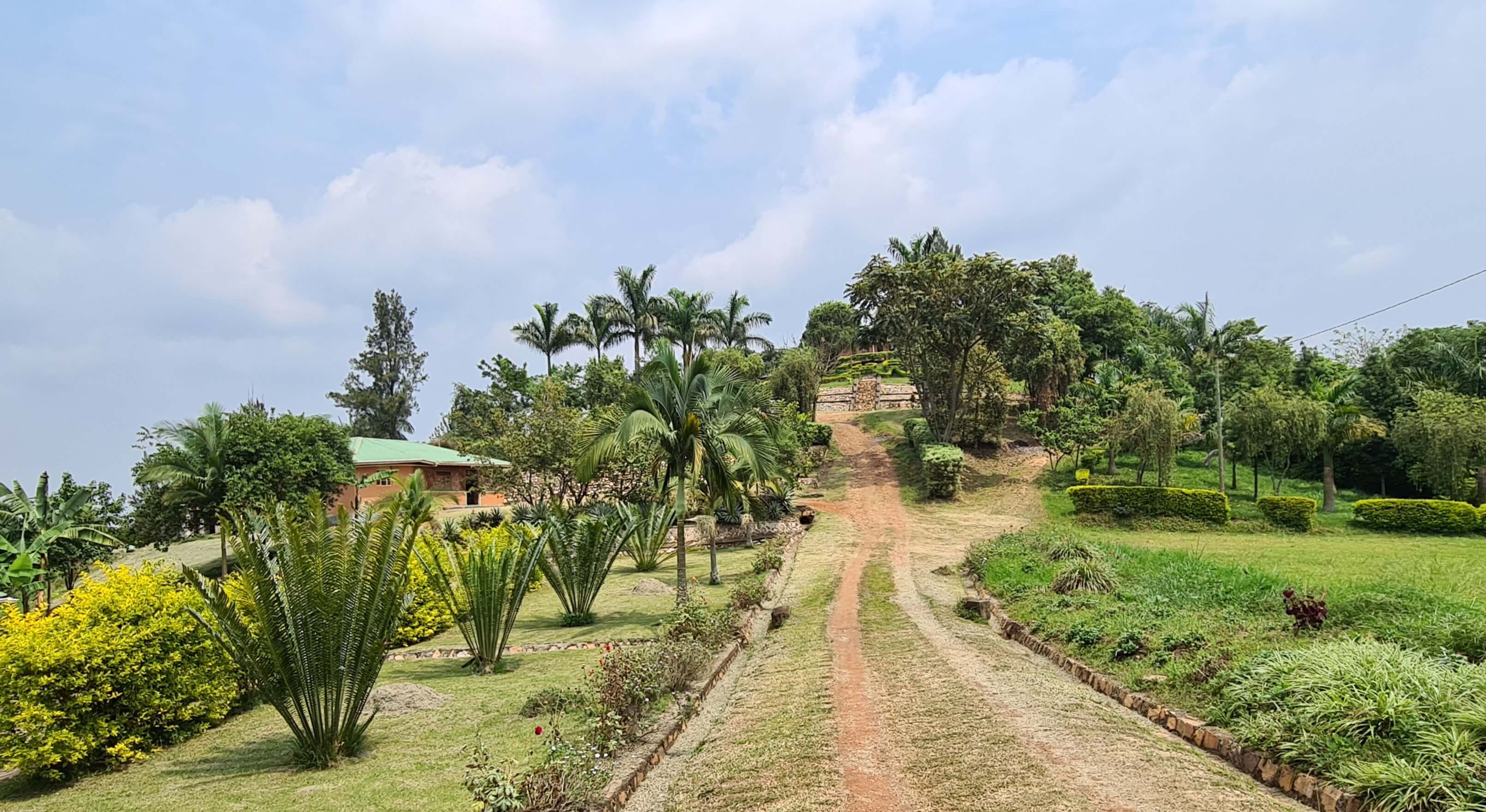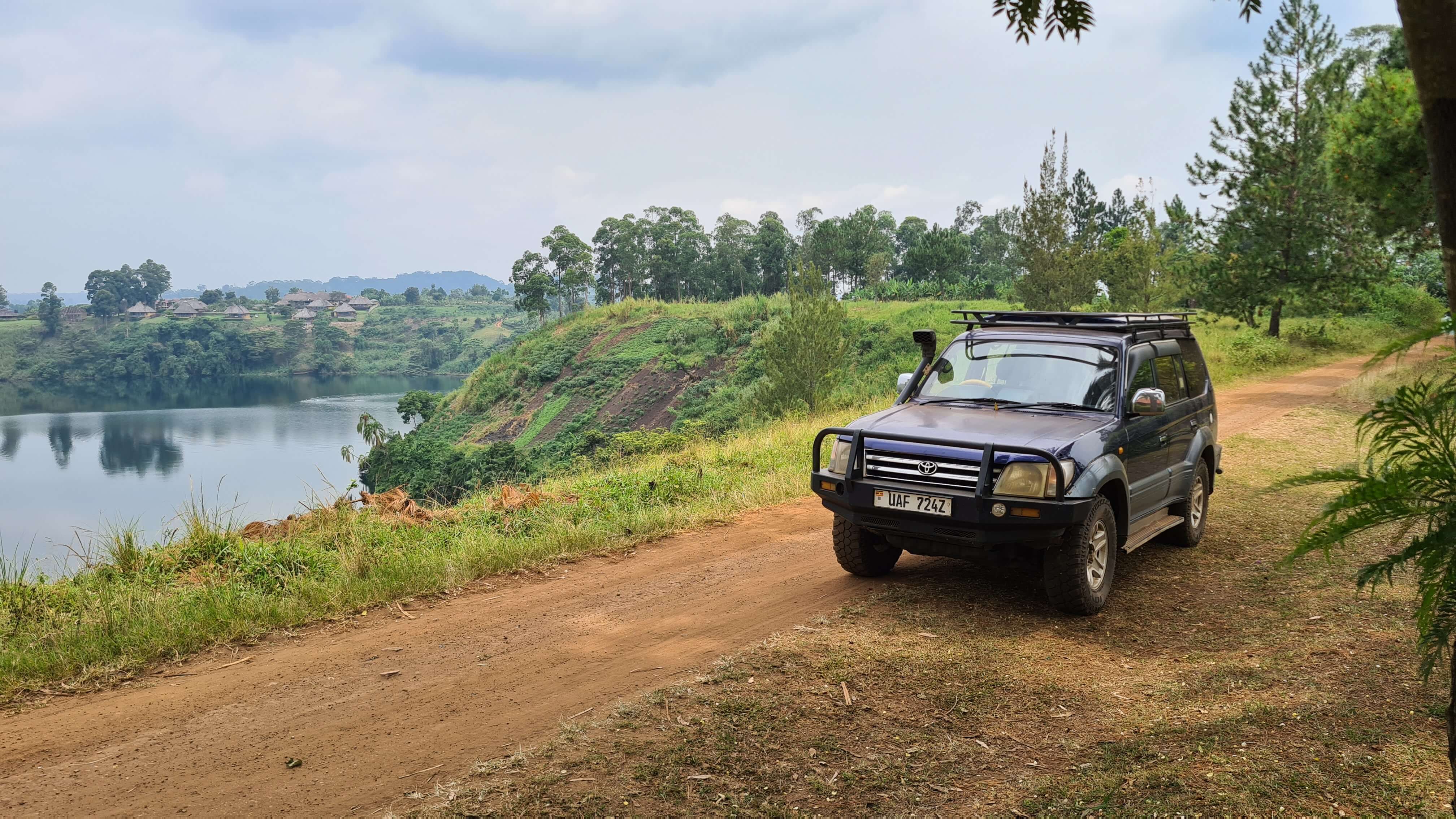 Über kleine Offroad-Straßen und Pfade führt uns der Weg weiter zu den beiden Kraterseen Nyinabulitwa und Nyamirima. Die beste Aussicht versprechen wir uns natürlich von der Hotelanlage „Top of the World“. Auf staubigen Feldwegen geht es eine Anhöhe hinauf und wieder einmal fragen wir uns, ob wir hier wohl richtig sind, bis wir vor dem schweren Zufahrtstor stehen. Tatsächlich öffnet sich die Pforte und wir fahren in ein fast schon fürstlich anmutendes Anwesen ein, um unser Auto auf dem sonst verwaisten Parkplatz abzustellen.