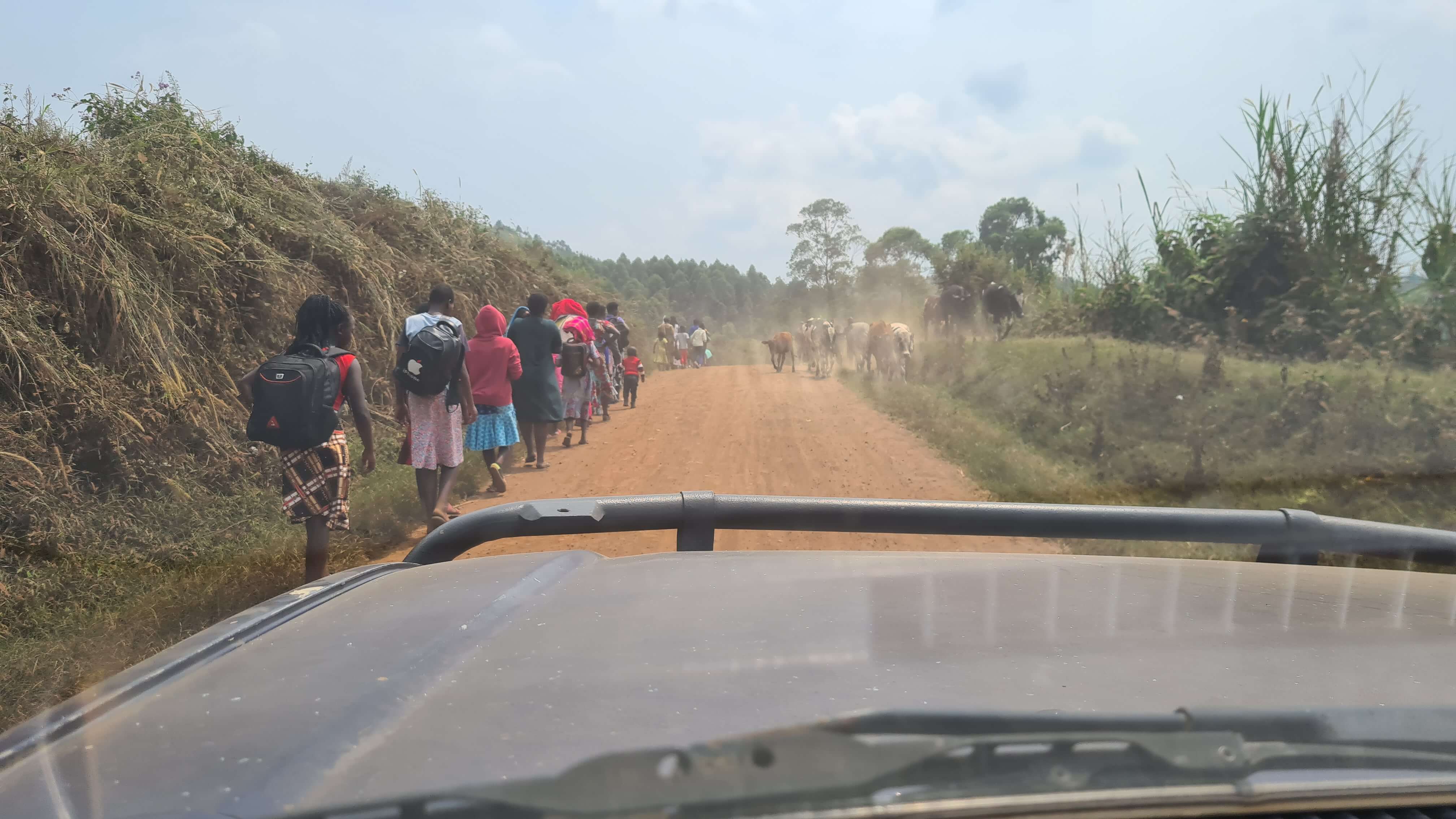 Wir fahren durch kleine Dörfer, vorbei an Tee-, Bananen- und Maniokplantagen, und egal wie abgelegen wir uns hier fühlen, die Wege werden immer gesäumt von Menschen, die meist zu Fuß in die eine und die andere Richtung unterwegs sind, um an einem der großen Gottesdienste mit Musik und Tanz teilzunehmen oder einen lokalen Markt zu besuchen. Matthias und ich haben schon ein ganz schlechtes Gewissen, weil wir mit unserem Fahrzeug beim Vorbeifahren, selbst im Schneckentempo, so viel Staub aufwirbeln.
