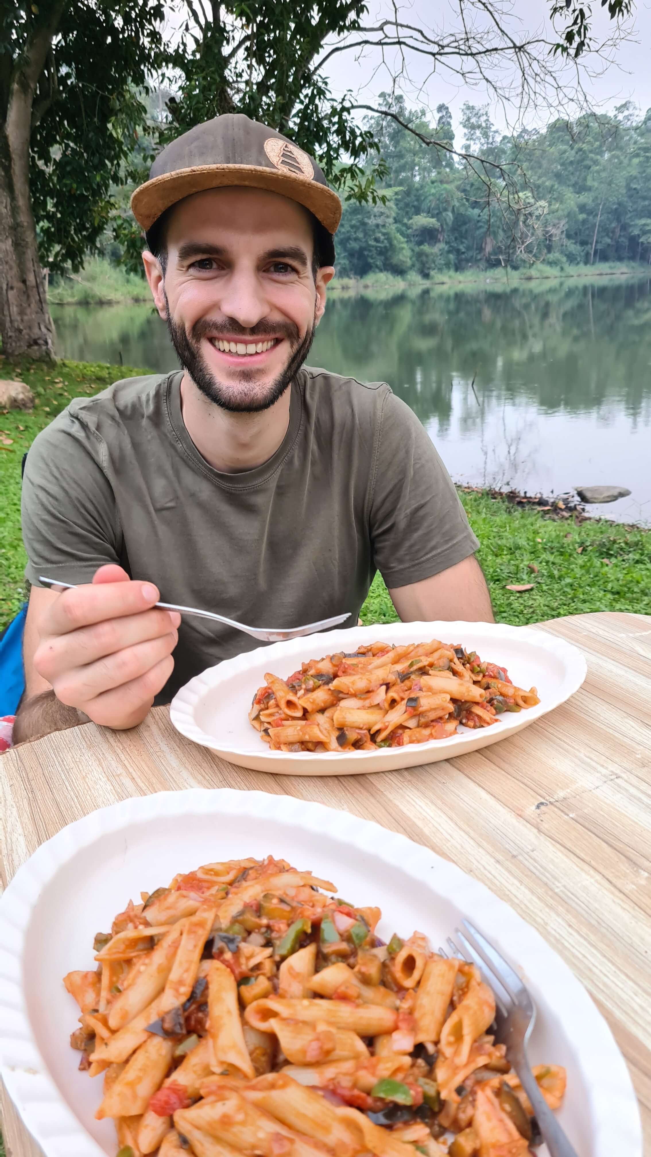 Jetzt geht es an den Zeltaufbau und ans Kochen. Zwei junge Männer beobachten uns aus respektvollem Abstand und sind wohl verwundert, wie die zwei Ausländer hier werkeln – und jeder Handgriff sitzt. Heute freuen wir uns über leckere Nudeln mit Auberginen-Tomatensoße und verarbeiten die restlichen Nudeln der Packung zu einem frischen Nudelsalat als Wegzehrung für den nächsten Tag.