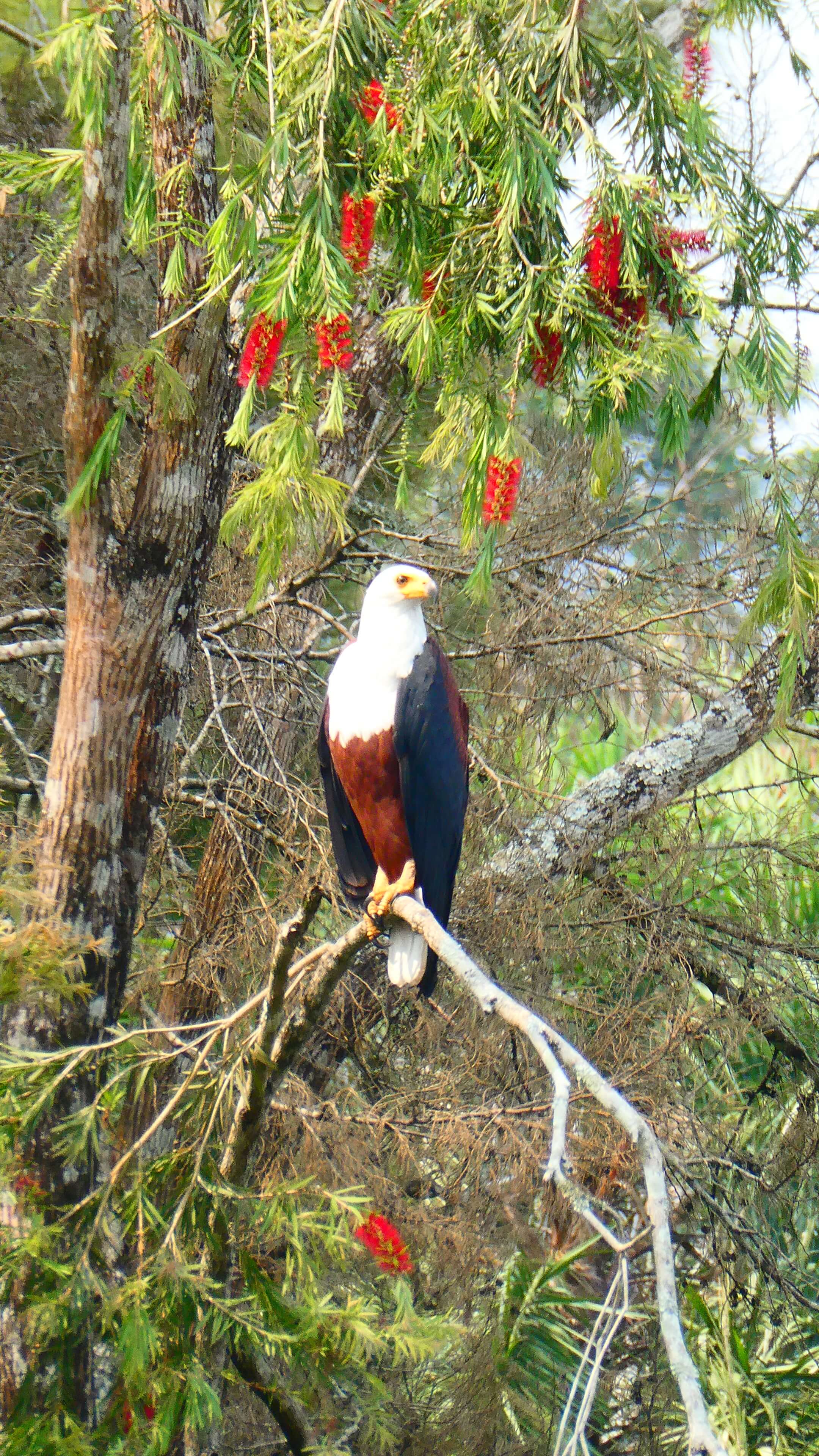Als wir nach einem feinen Frühstück schon fast losfahren wollen, bietet sich uns dann noch ein lautstarkes, gefiedertes Spektakel. Eine Schar der großen Turaco-Vögel stürmt den gewaltigen Baum beim Restaurant, wo offensichtlich gerade die Blüten oder Früchte schmackhaft sind.