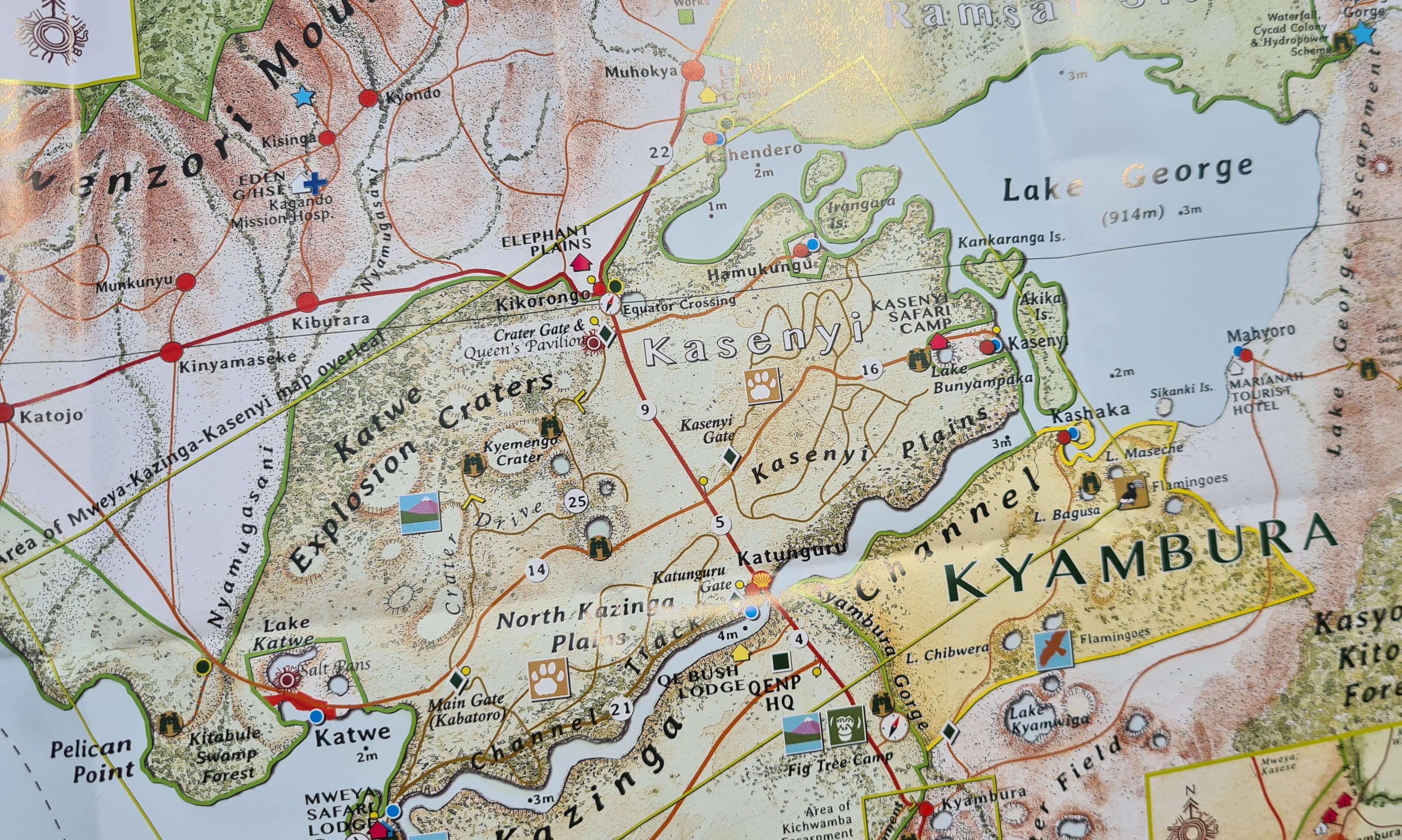 Nach unserer Mittagsrast am Queen’s Pavilion betreten wir das Crater Gate Office des Queen Elizabeth National Parks, um uns Informationen und eine Trail-Karte zu holen. Zur Option steht die Fahrt über den Katwe Crater Drive im Osten oder durch die Kasenyi Plains im Westen. Da wir nun schon so viele Kraterseen genossen haben, entscheiden wir uns für die zweite Alternative und fahren über das Kasenyi Gate um 14.30 Uhr in den Nationalpark ein. Das übliche Prozedere der Registrierung und des Bezahlens der Entrance Fee für die 2 x 24 Stunden fällt hier fast schon unspektakulär aus.